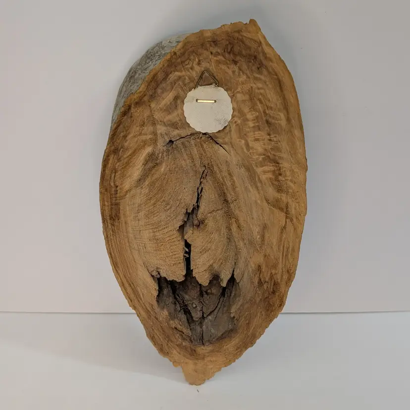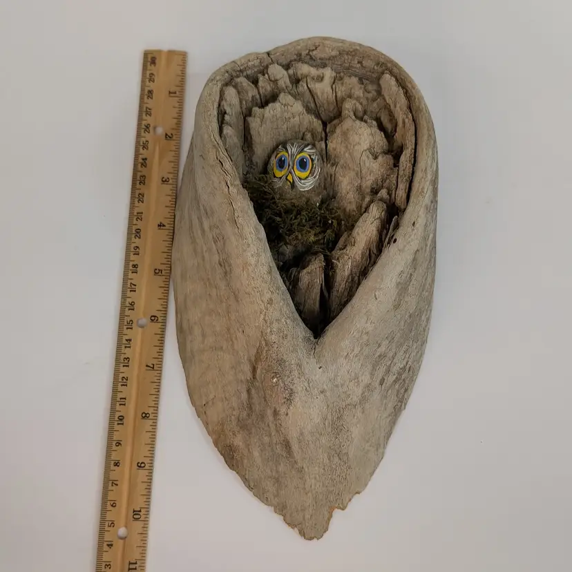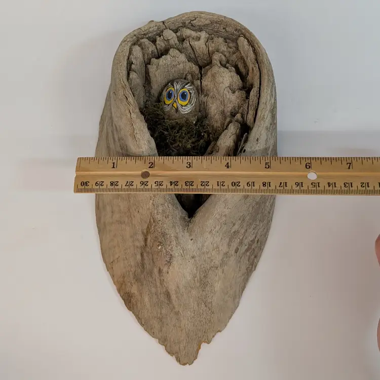 Cute, little hand painted owlet sitting in some moss in a driftwood knot. It is all ready to go with a hanger on the back. In nice, used condition. Measurements ~ 5.25 x 10 x 2.75"