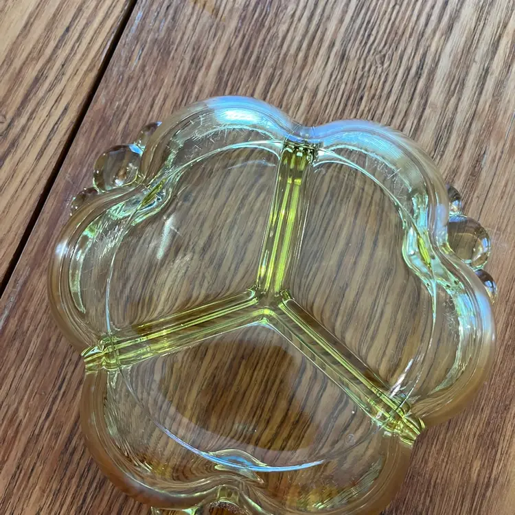 This particular piece, shaped like a pumpkin or gourd, is a classic example of Depression-era or mid-century glassware, often used as a candy dish or trinket box. Such items were widely produced and collected for their decorative appeal and affordability, making them popular additions to home decor during the 1940s and 1950s.