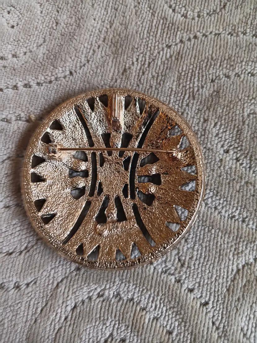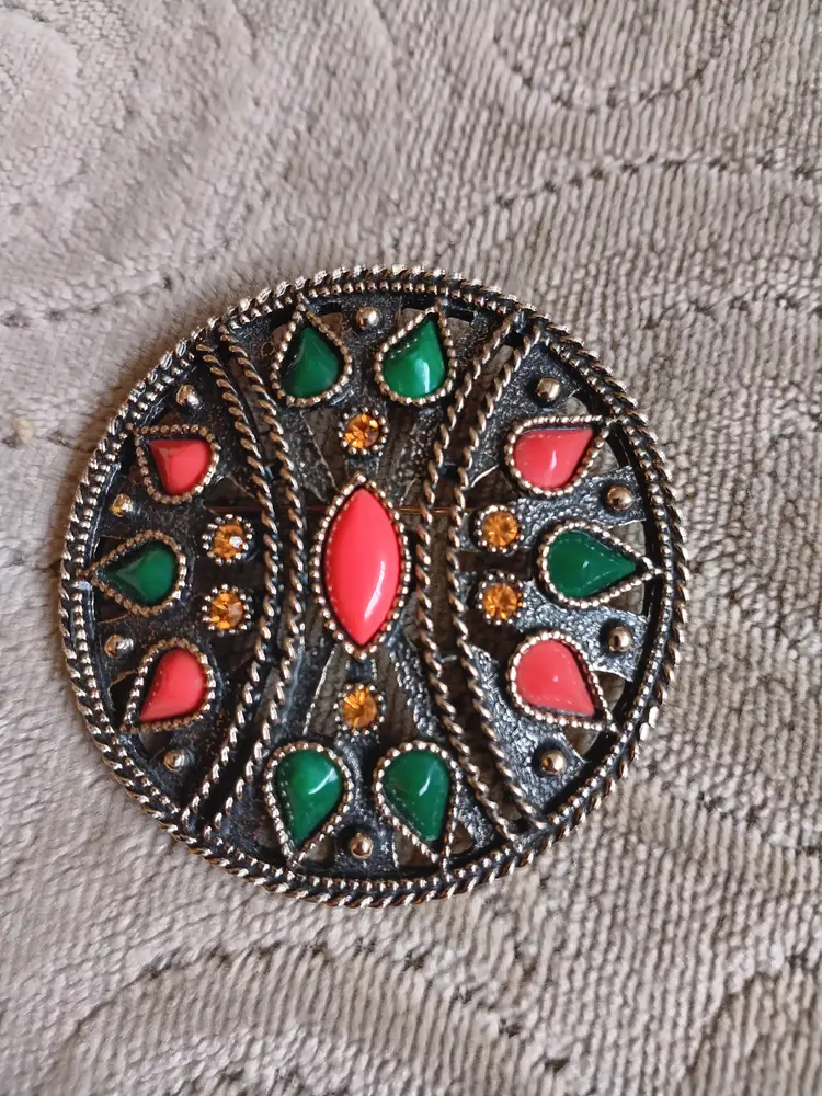 This is a vintage Emmons large round brooch or pendant featuring coral/red and green teardrop cabochons with orange/yellow rhinestones in an antiqued goldtone setting.