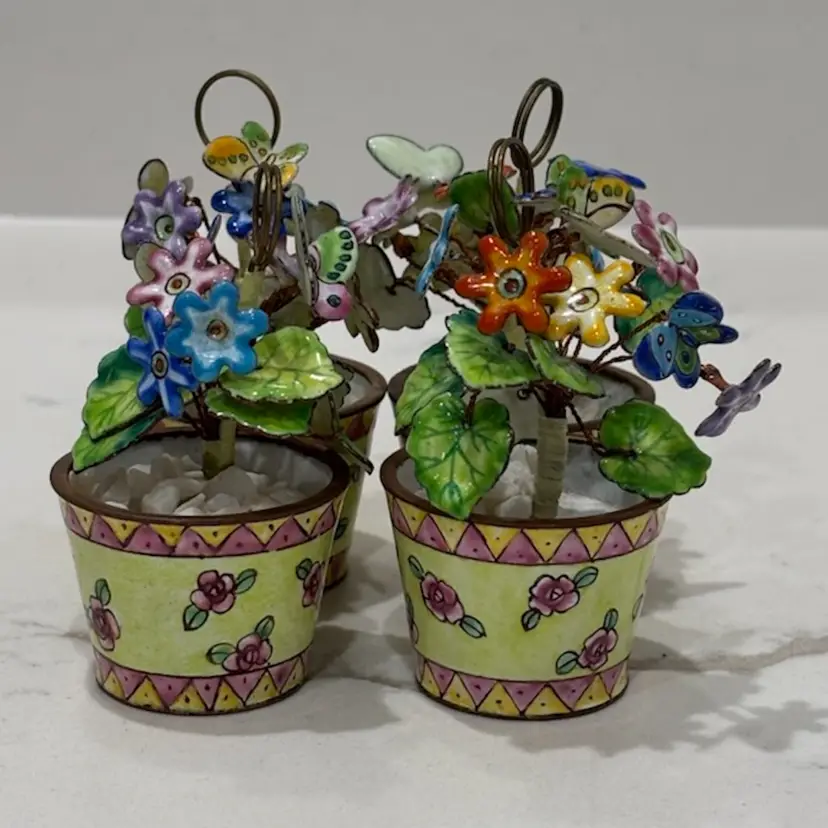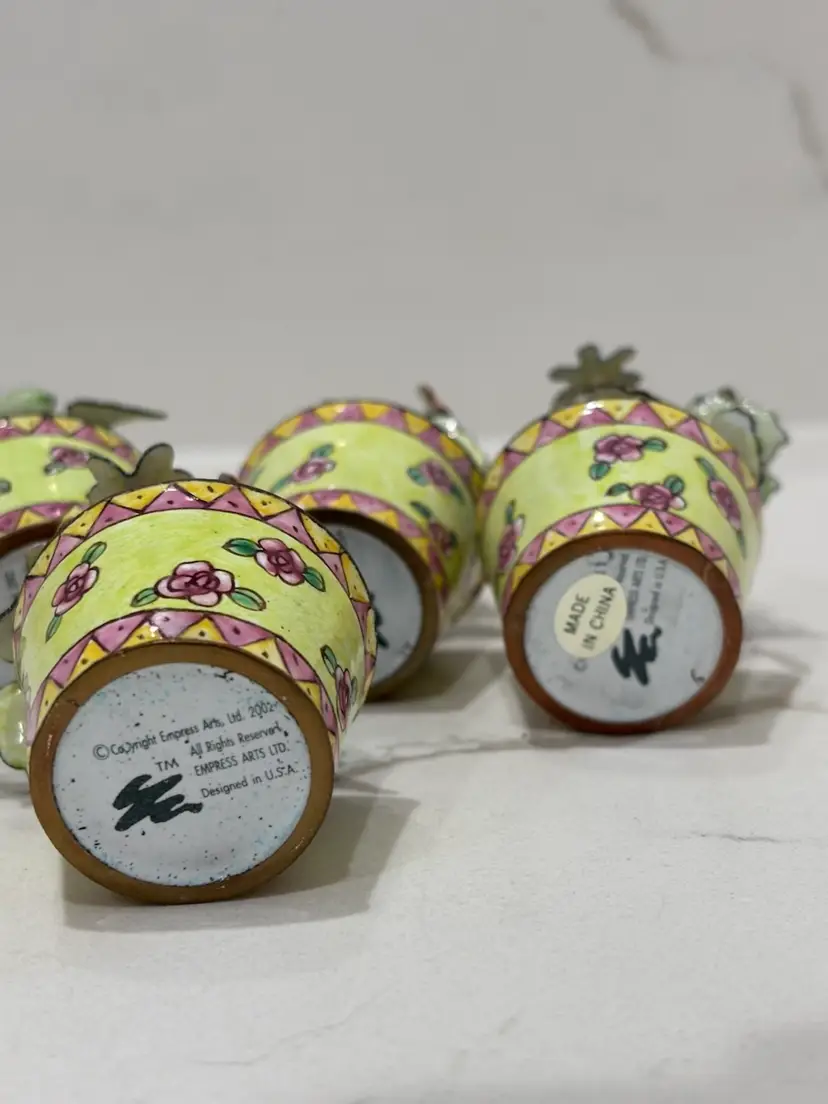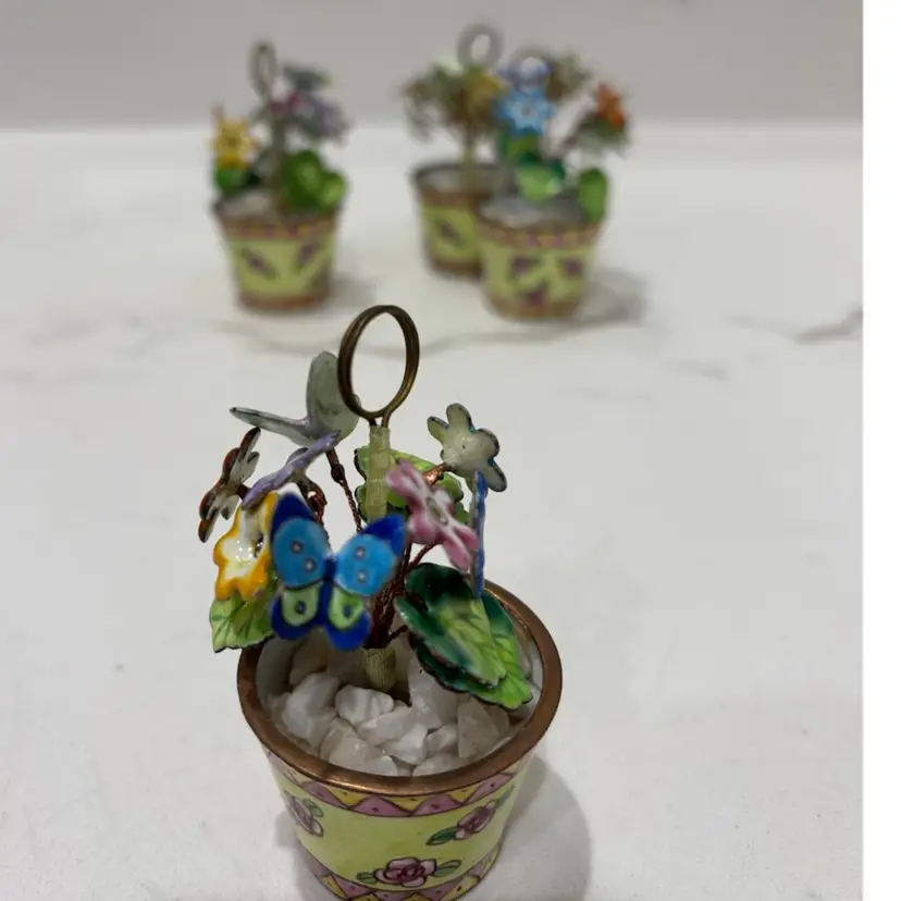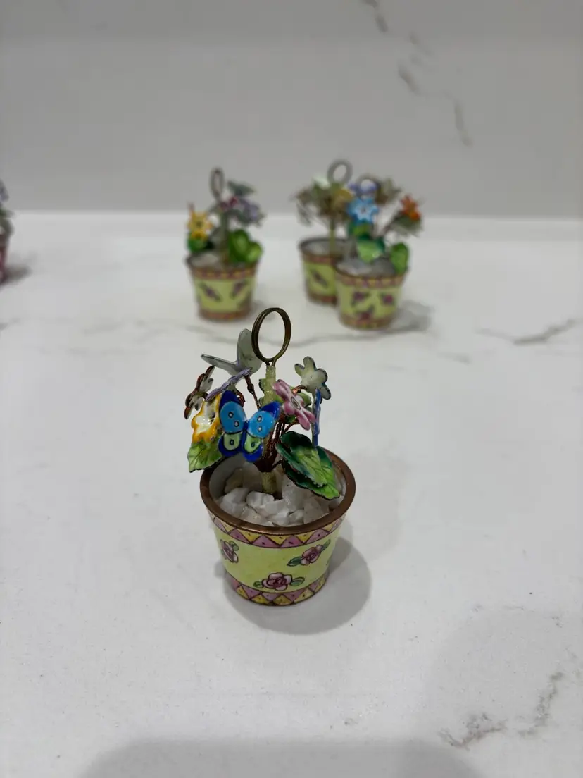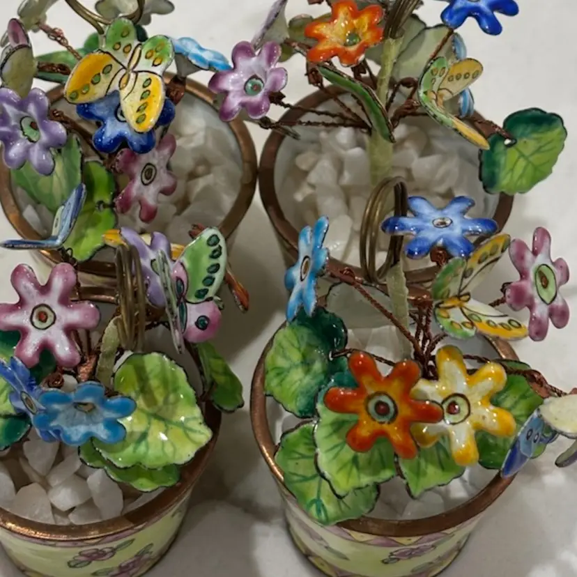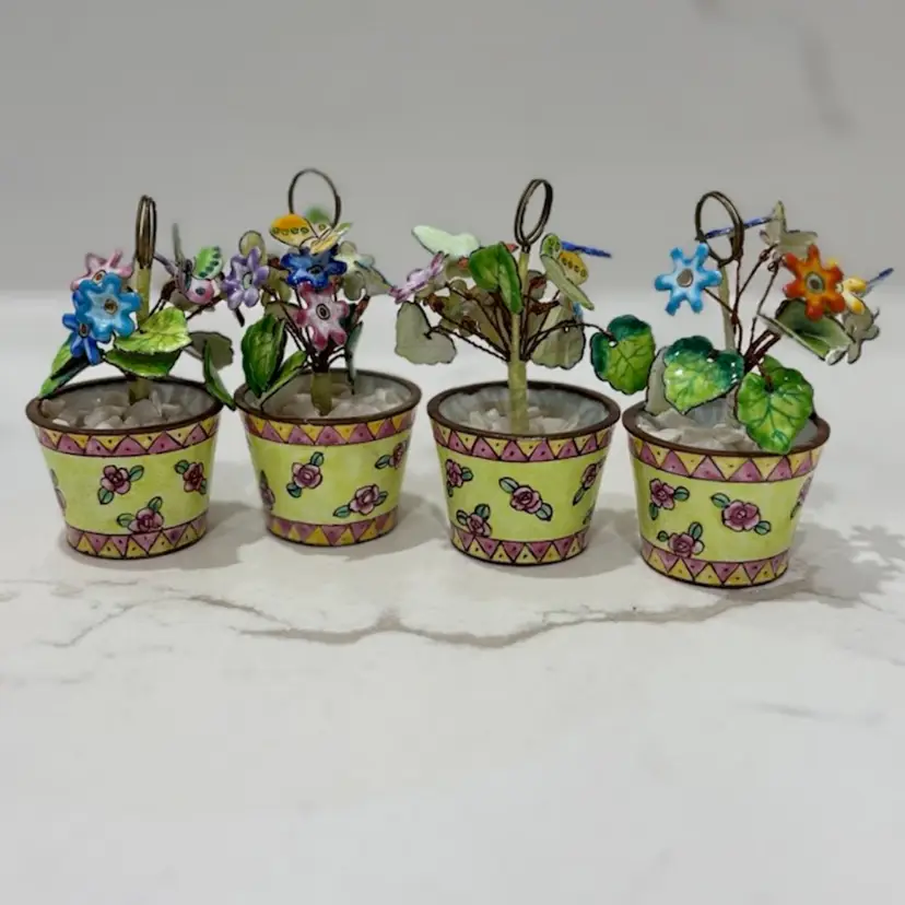 Vintage Empress Arts Ltd Set Of 4 Miniature Floral And Butterfly Bouquet Enamel Card Or Photo Holders Yellow