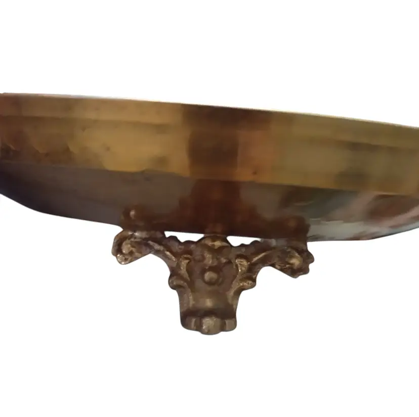 This is a beautiful enamel in brass red & green with intricate feet. This is great for display, it to hold trinkets/jewelry. Dish measures 7" wide x 2" tall.