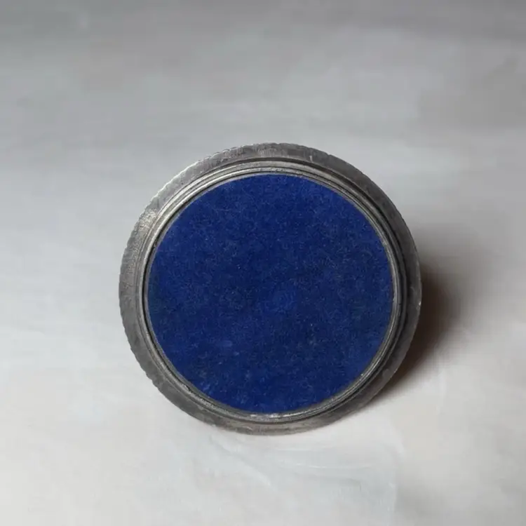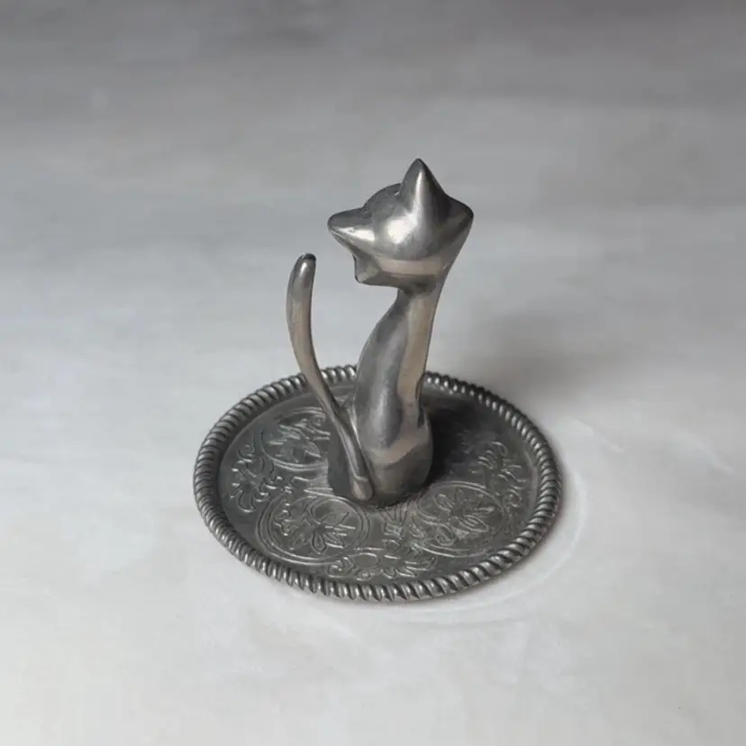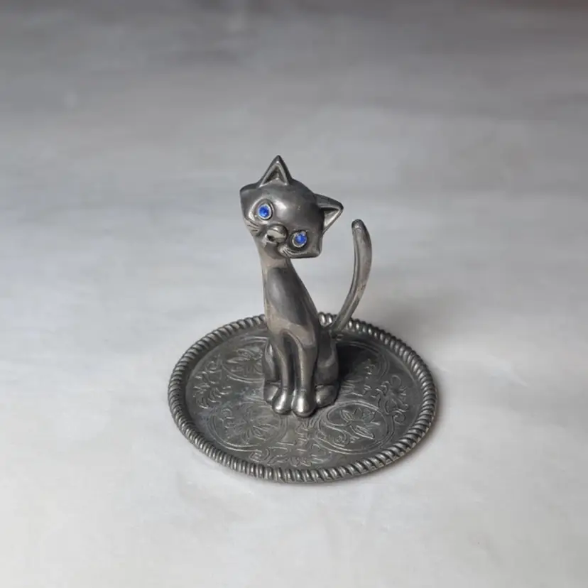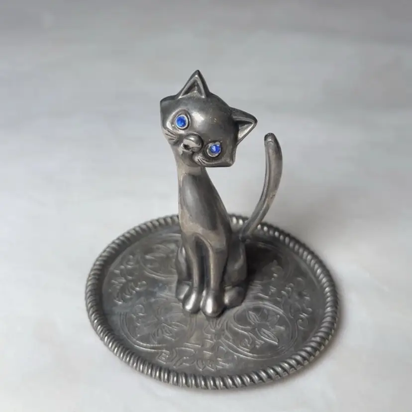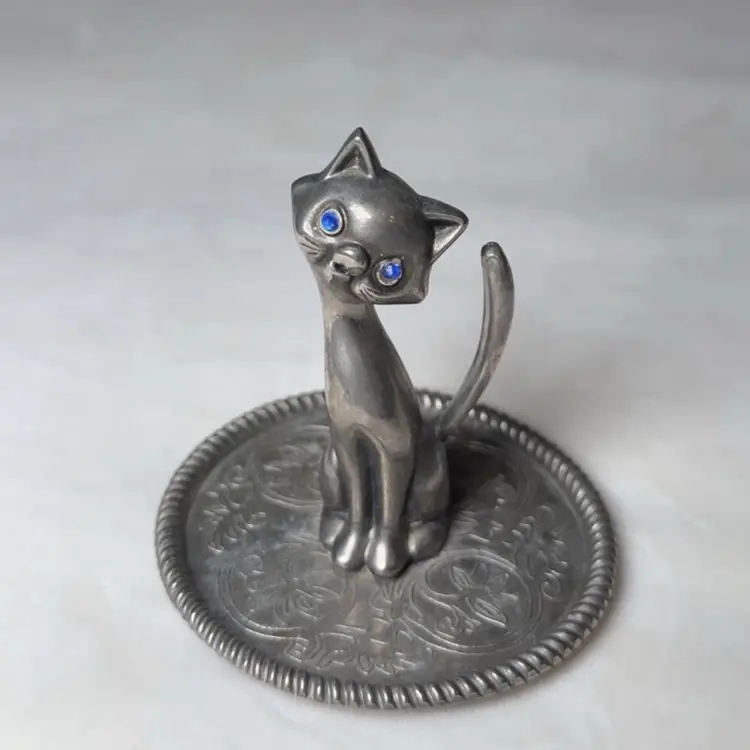 This vintage EP zinc alloy silver ring holder tray figurine with a cat design, featuring blue rhinestone eyes, is a charming and elegant addition to any jewelry collection. Made of metal in a round shape, this jewelry stand is perfect for organizing and displaying your rings in a stylish way. The vintage design adds a touch of nostalgia to your accessories, making it a unique and eye-catching piece for any jewelry lover. The dish has a 3.5” diameter, and the cat stands 3” tall.