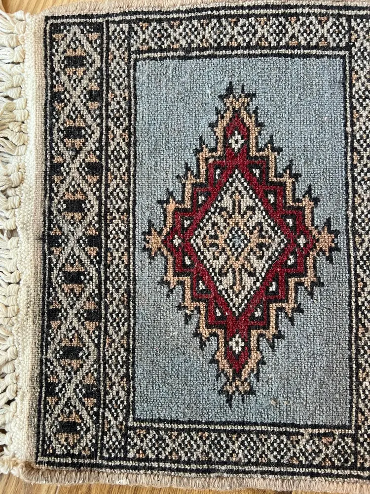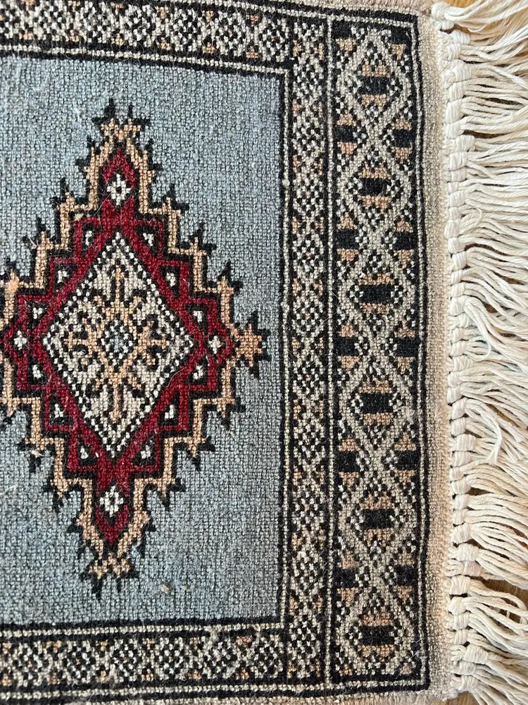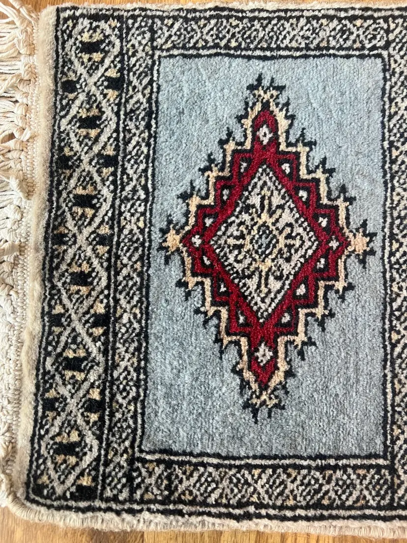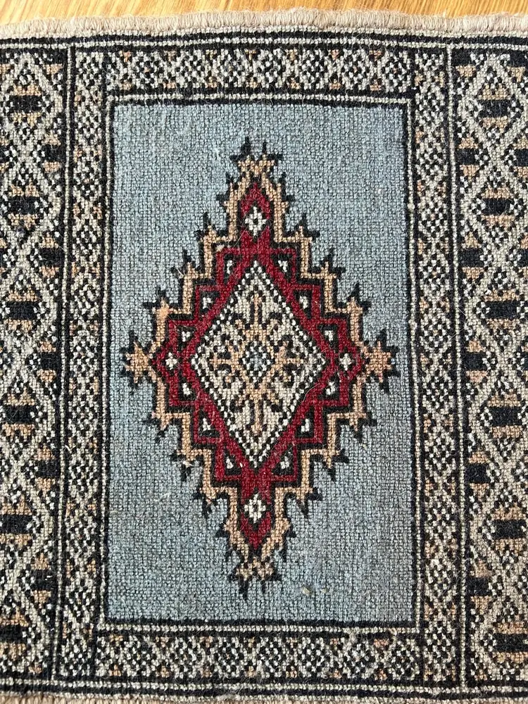 The Charlie B Gallery of Carson City, Nevada is offering this estate found small rug. This rug based on its design was likely made in Pakistan or South Asia. All the knots appear to be present at the ends with some flattening needed. Somehow over the life of the rug, there were light touches of white paint happened at the one area of the edge---I have not tried to clean this as it seemed minor especially being at the back of the rug. The stitching seems to be relatively complete, as shown. Please see photographs.