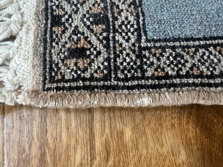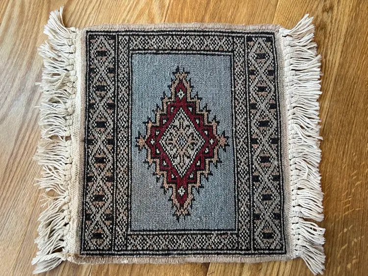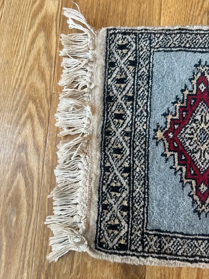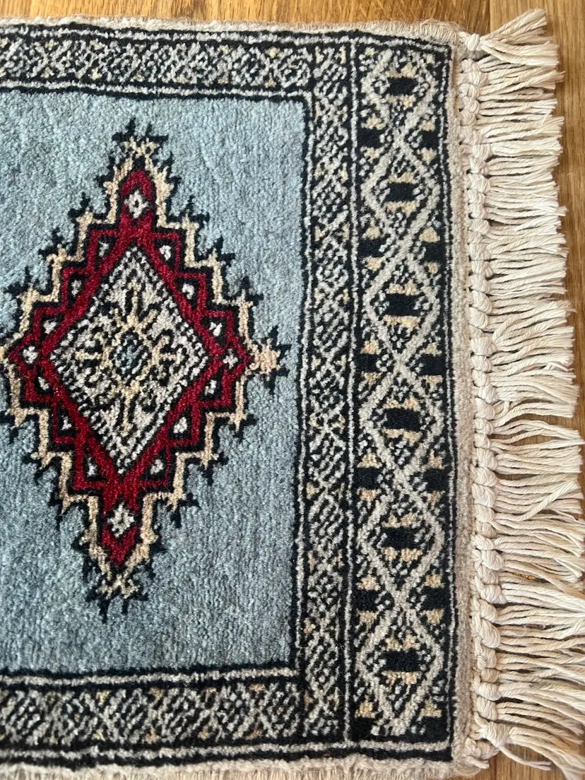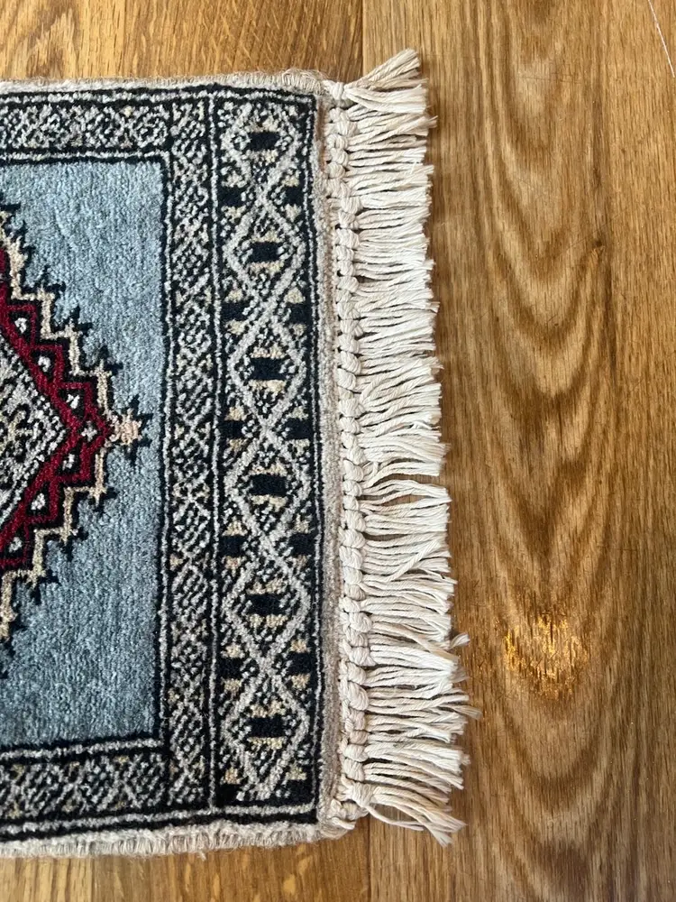 The Charlie B Gallery of Carson City, Nevada is offering this estate found small rug. This rug based on its design was likely made in Pakistan or South Asia. All the knots appear to be present at the ends with some flattening needed. Somehow over the life of the rug, there were light touches of white paint happened at the one area of the edge---I have not tried to clean this as it seemed minor especially being at the back of the rug. The stitching seems to be relatively complete, as shown. Please see photographs.