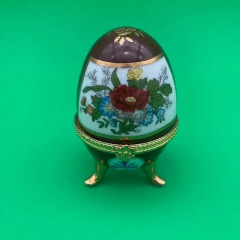 Vintage Faberge Porcelain Style Brown Floral Imperial Egg Trinket Box - 4" Tall