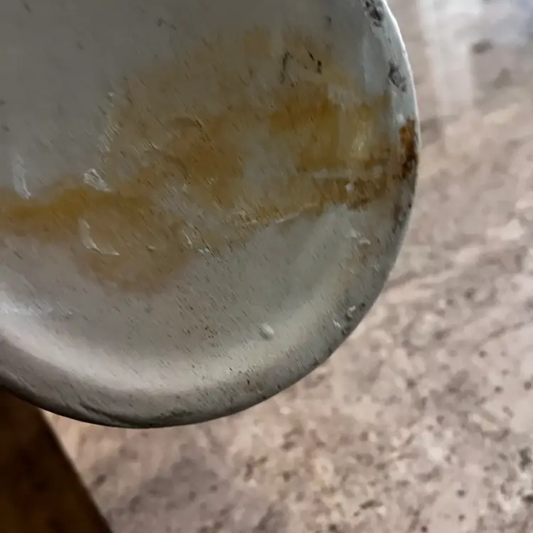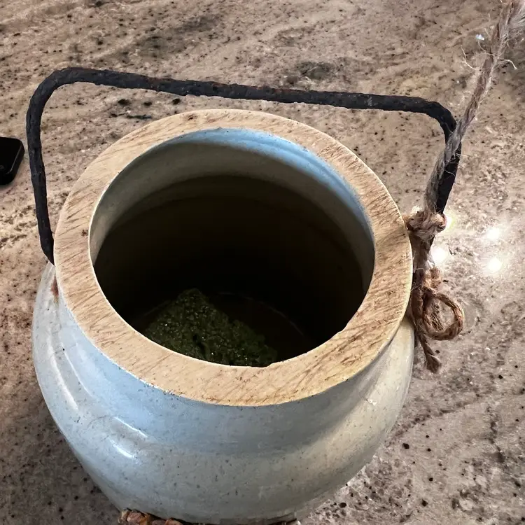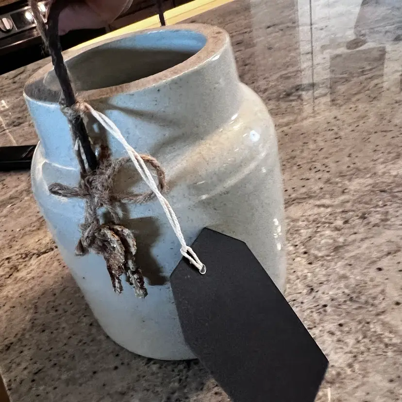 Upcycled by me! One of my favorites! hand painted it Heavy old crock with lots of marks and rust Added the keys rusted them myself.