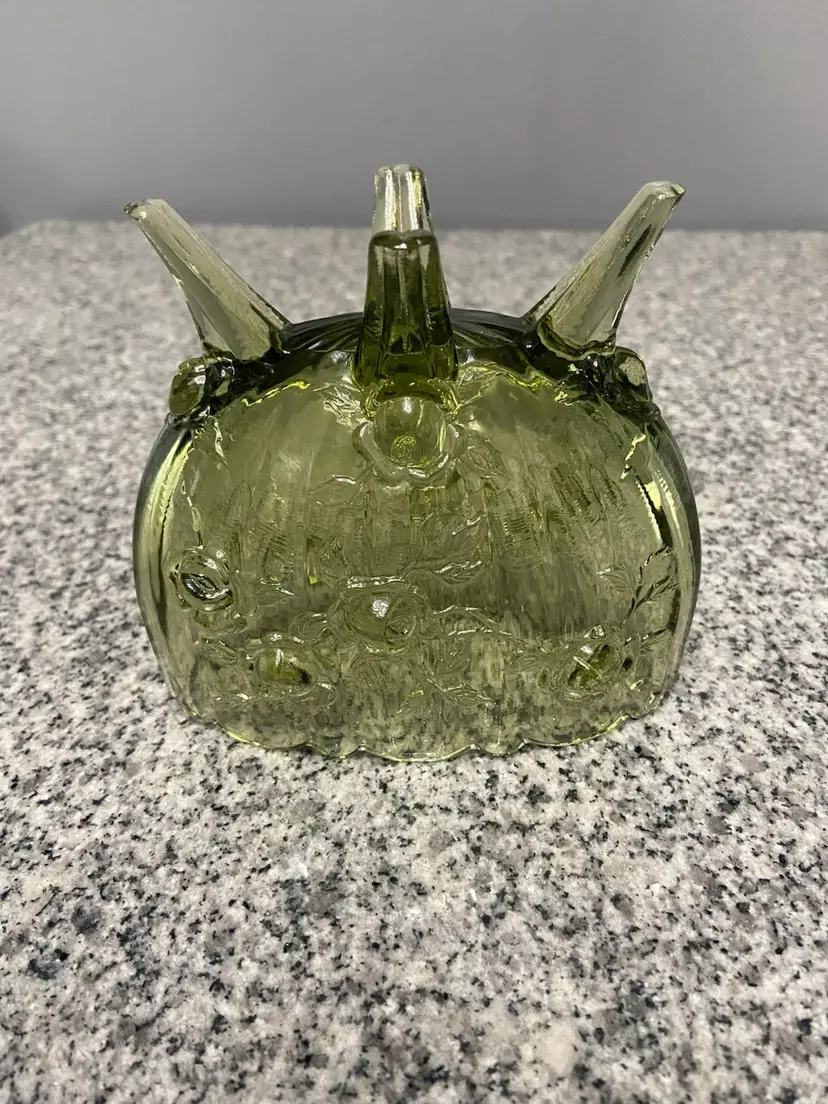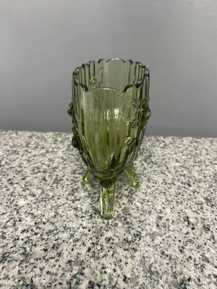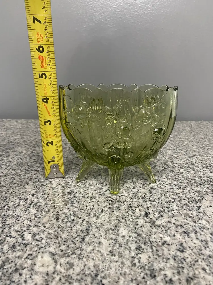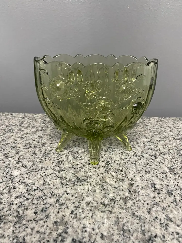 Vintage FENTON Green Oval 4 Footed Colonial Cabbage Rose Glass Vase North American-made A beautiful green color and an intricate cabbage rose pattern, this vase exudes a charming cottagecore aesthetic. The glossy finish and 3D effect add to its antique appeal, making it a perfect addition to any vintage or grannycore-themed decor. This Fenton vase, produced in the United States with a pressed glass technique, is a unique and decorative item that will surely add character to any space.