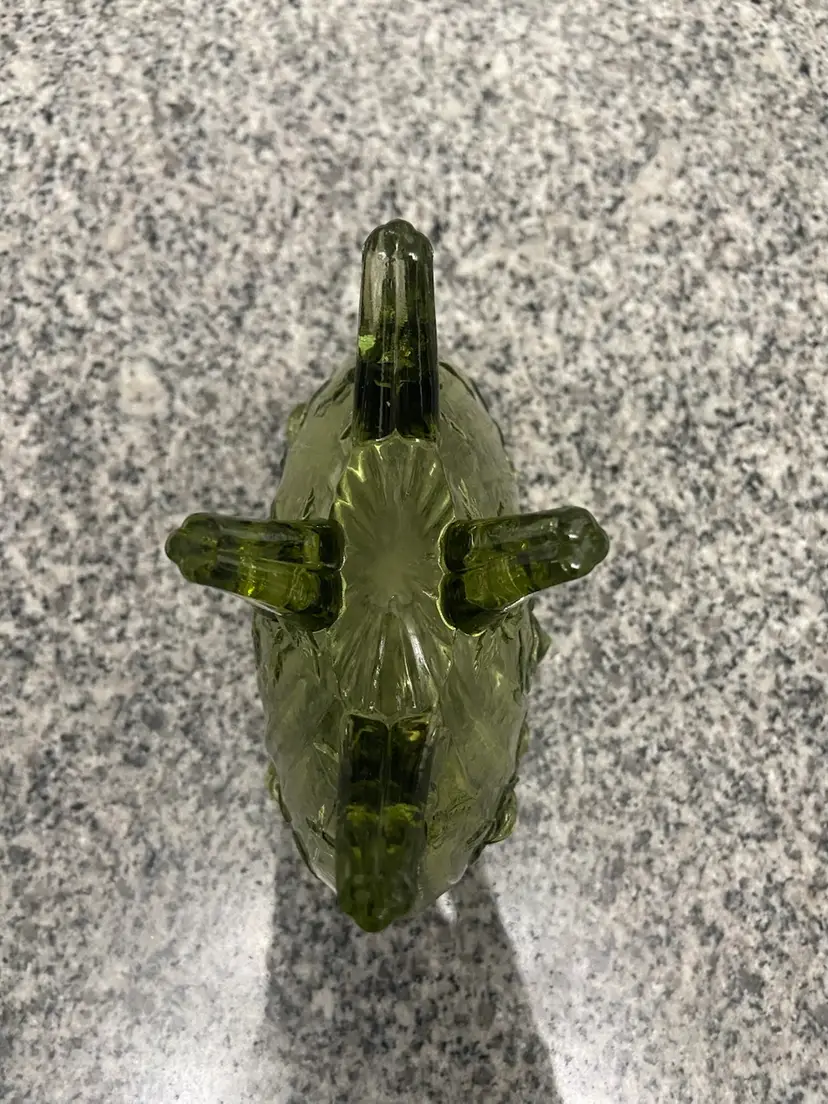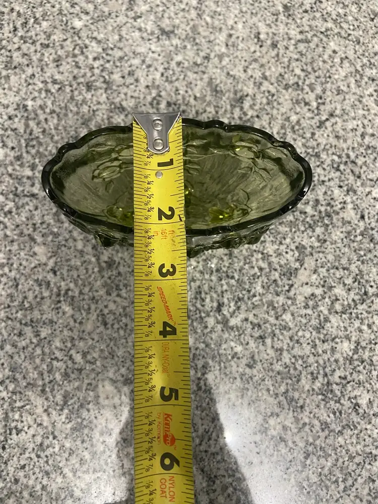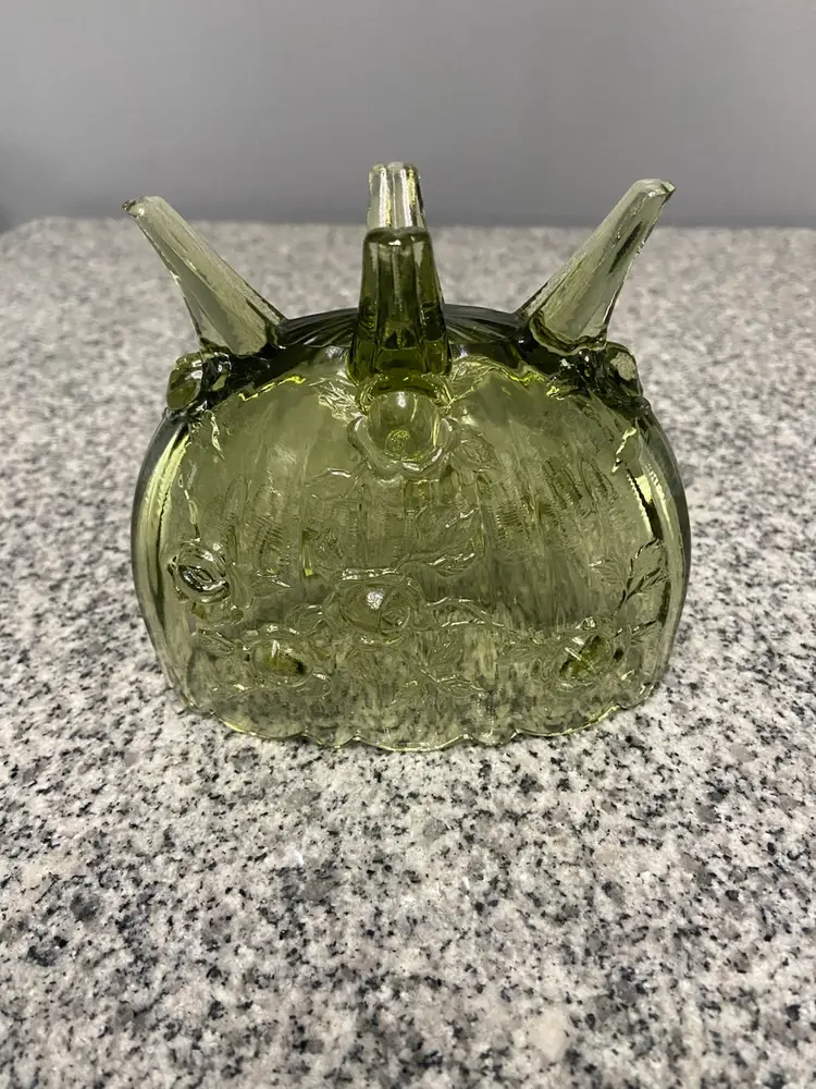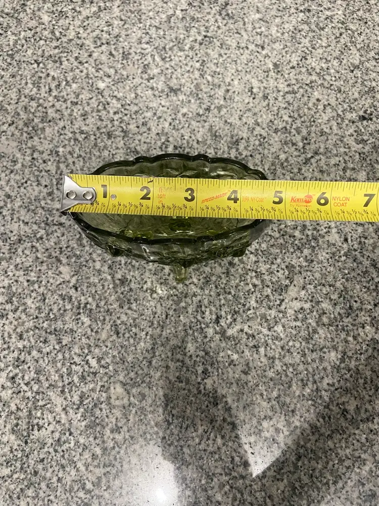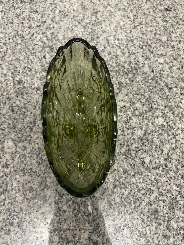 Vintage FENTON Green Oval 4 Footed Colonial Cabbage Rose Glass Vase North American-made A beautiful green color and an intricate cabbage rose pattern, this vase exudes a charming cottagecore aesthetic. The glossy finish and 3D effect add to its antique appeal, making it a perfect addition to any vintage or grannycore-themed decor. This Fenton vase, produced in the United States with a pressed glass technique, is a unique and decorative item that will surely add character to any space.