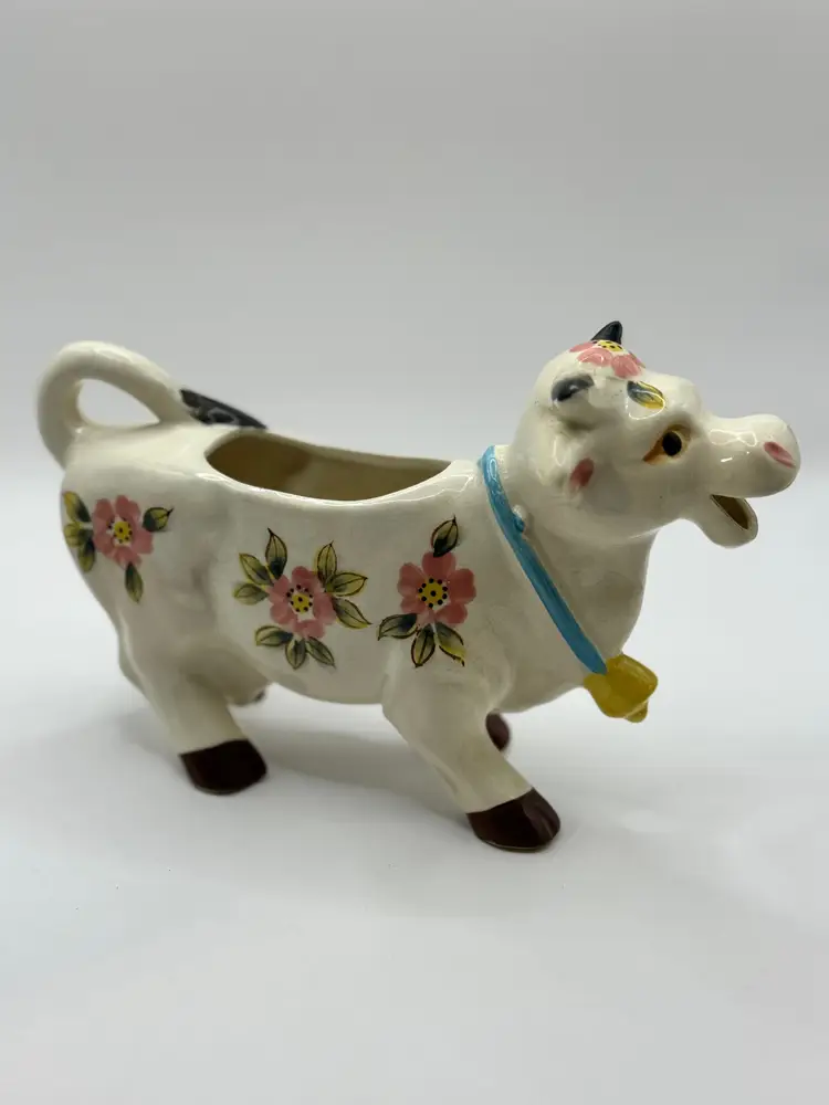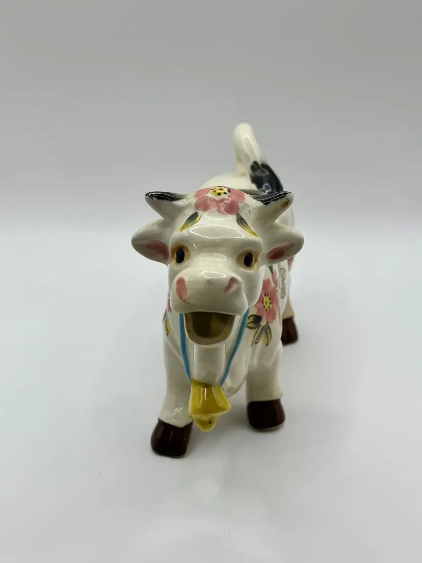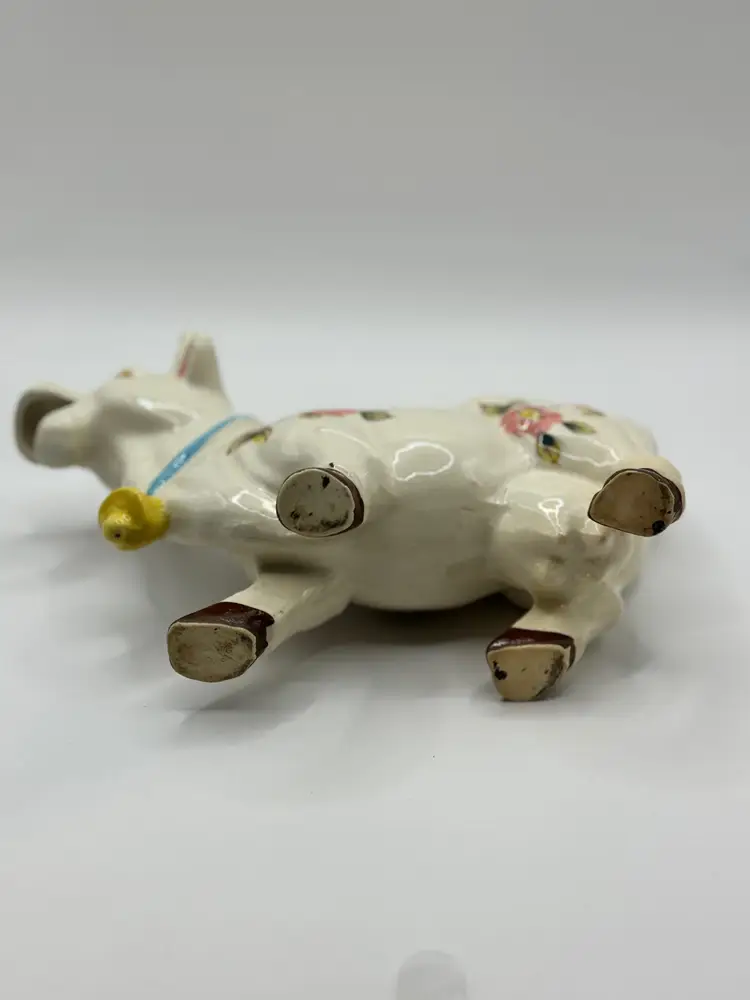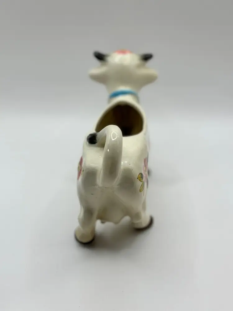 Add a touch of whimsy to your home with this vintage ceramic cow creamer planter. Adorned with delicate floral patterns and a playful design, it's perfect for farmhouse decor or as a quirky kitchen pot. No visible chips or cracks. A charming piece for plant lovers and vintage enthusiasts alike. Measures 8.5x5x2.75. Weighs 1lb.