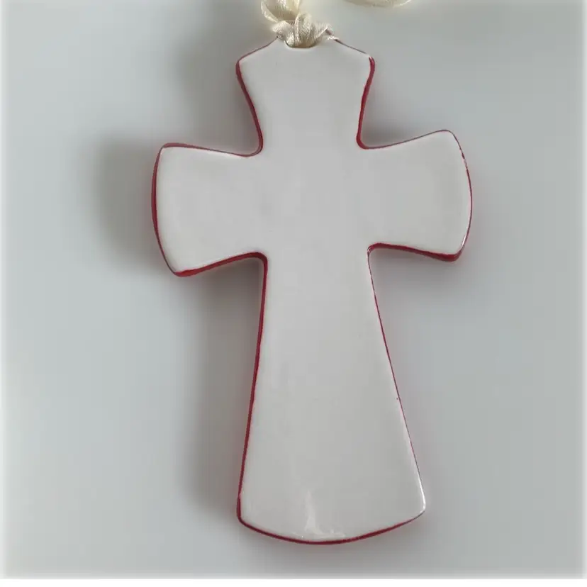 Vintage fused glass Christmas cross irnament with Isaiah 9:6. The cross measures 2” x 4 1/2”.