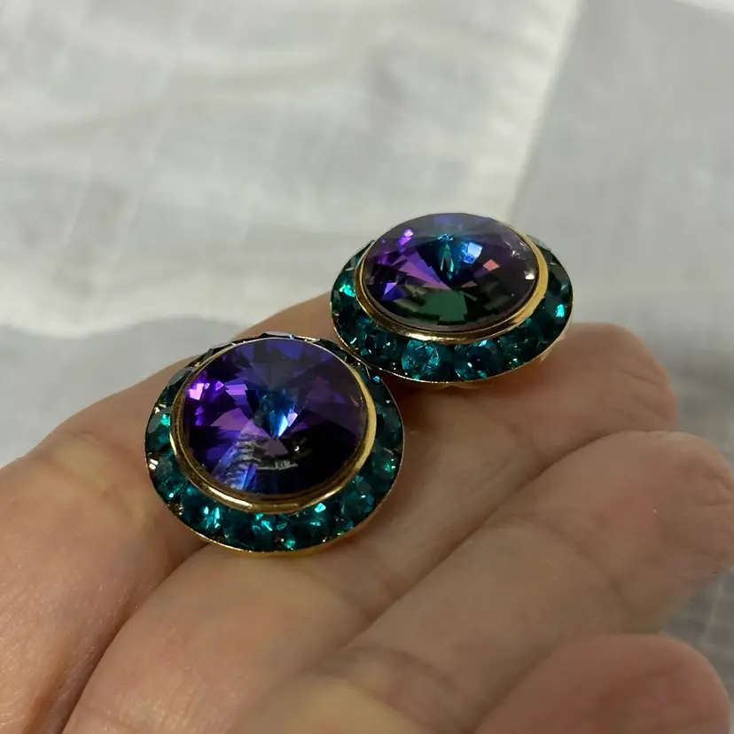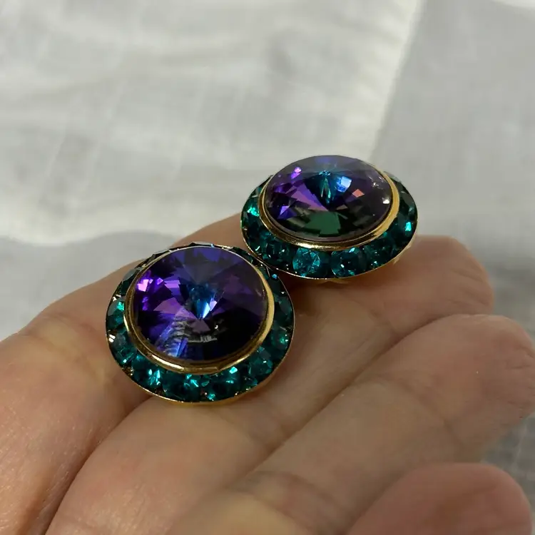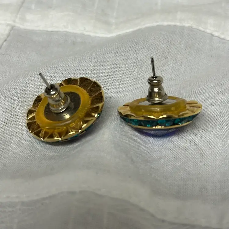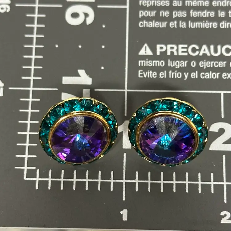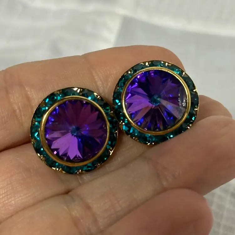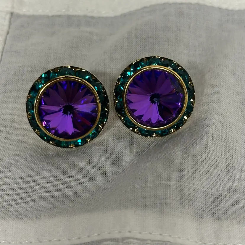 Vintage Gold Tone Circle With Purple Glass Stone And Green Rhinestone Post Pierced Earrings
