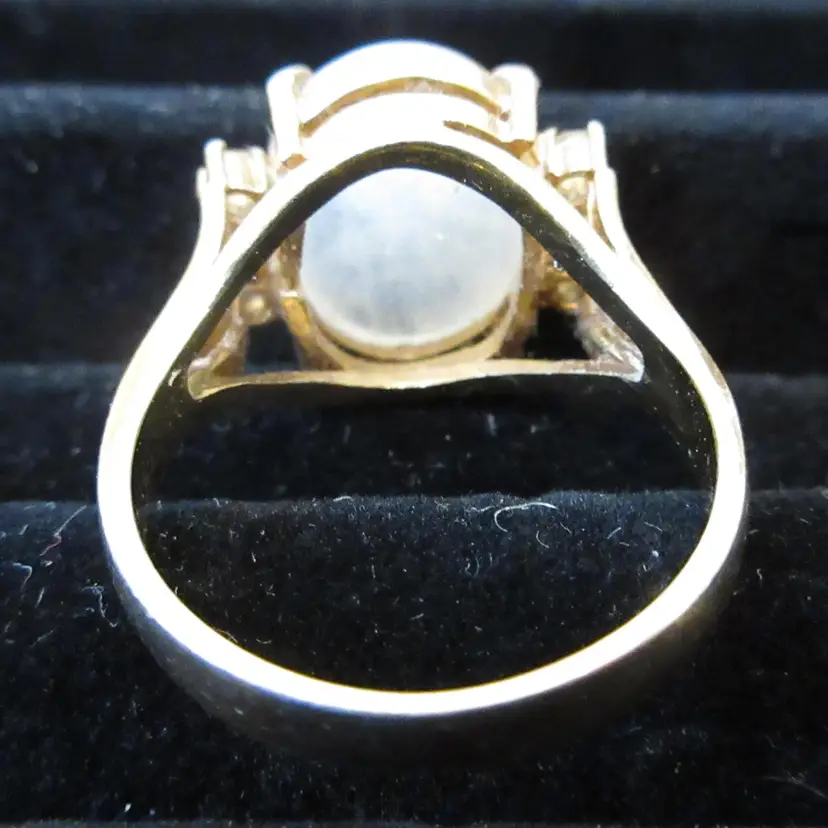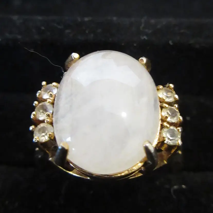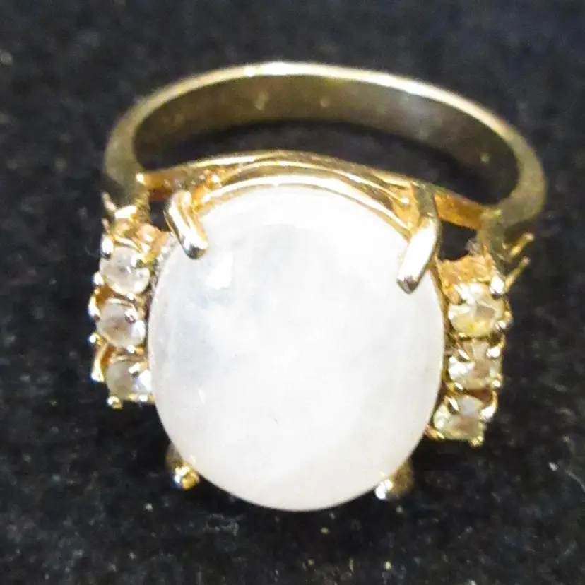 This is a BEAUTIFUL gold tone metal cocktail ring with a prong-set pinkish-white smoky glass cabochon features in the center. There are 3 small clear crystal rhinestones on either side of the cabochon. The ring is AMAZING! It is a size 8.