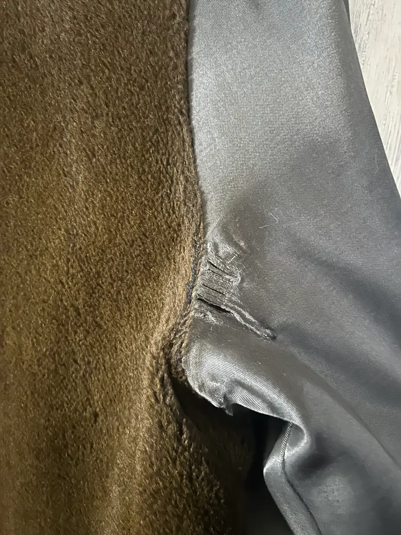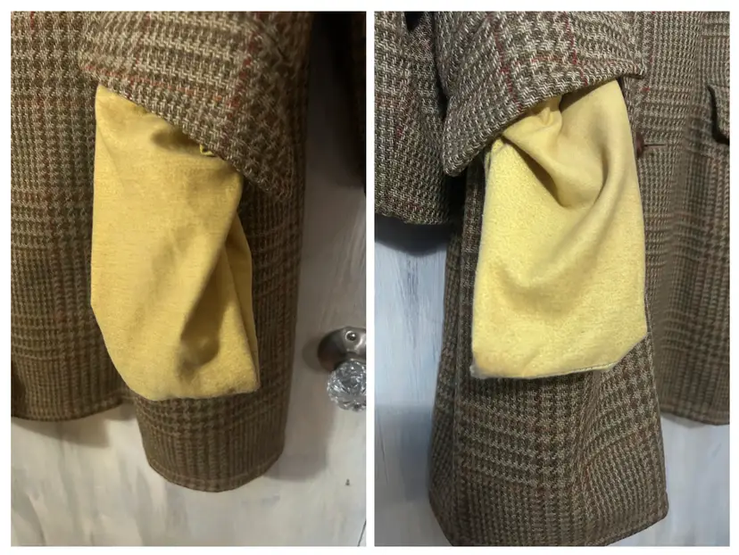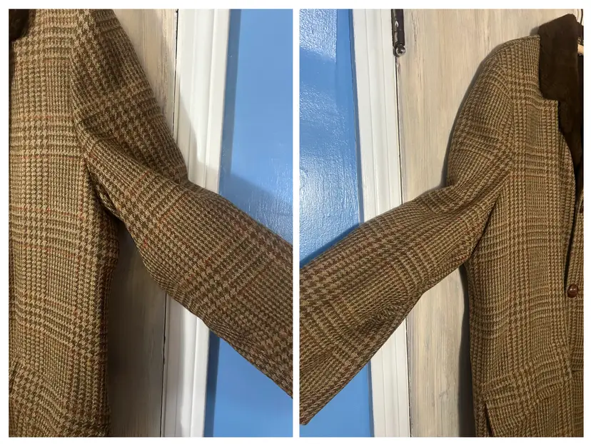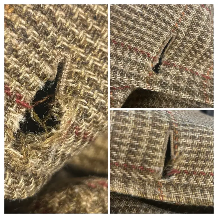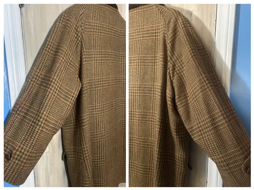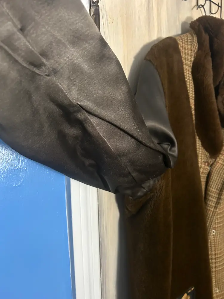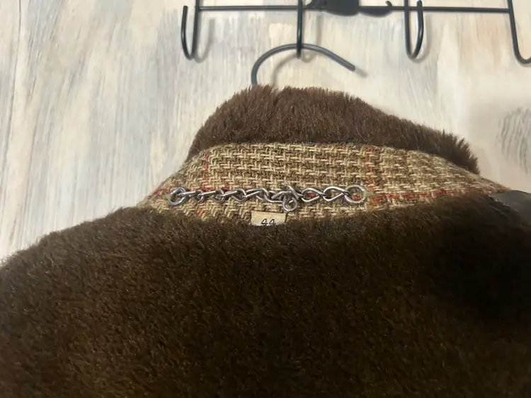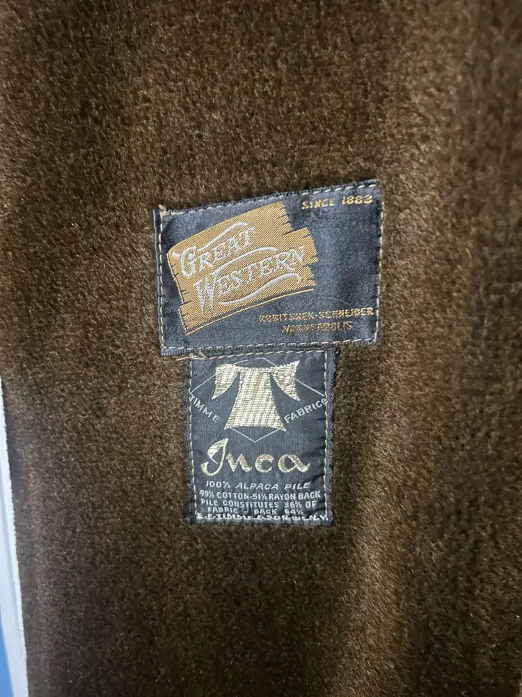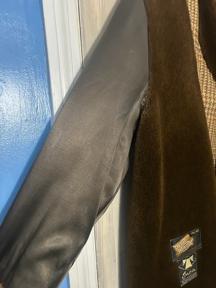 Brand/Maker- Great Western Size- Marked 44, measures to a modern XLarge- see measurements below Color- All Brown with houndstooth pattern Condition description- No stains on outside shell. Button holes have wear toward seam from use, would recommend to be stitched - see last photos for close ups. Also some thread wear present on seam edge between bottom button hole and middle - see photo . Inside armpit on right side is torn and needs to be stitched. Button holes are worn toward outside seam from use. Pockets on front are usable and have no holes. Fabric- Alpaca pile, cotton, rayon