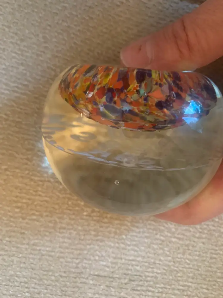 Vintage hand blown God Bless Our Home paper weight. It measures 3 1/4 inches in diameter and 2 1/2 inches tall. The bottom is polished and concave. There are a few bubbles in the glass and I have pictured 2 chips in the paper weight. I note no other flaws.