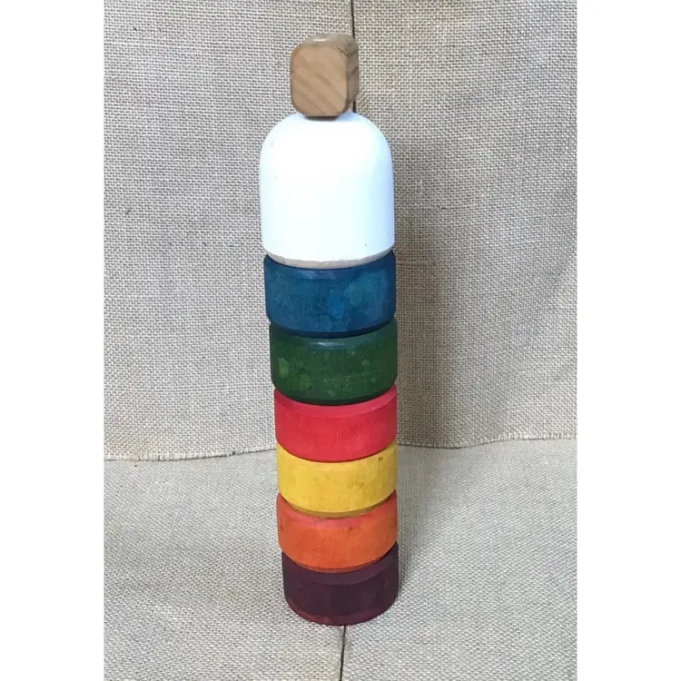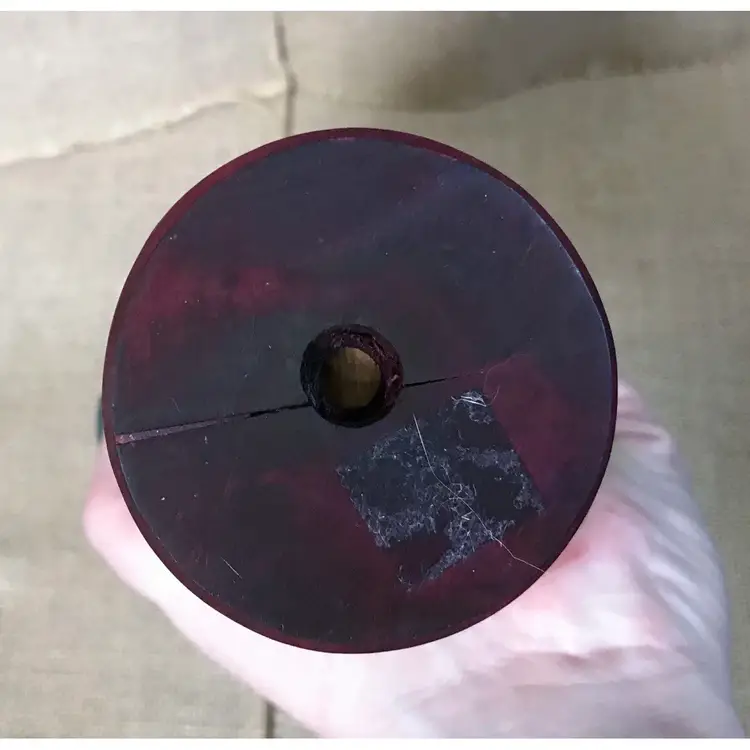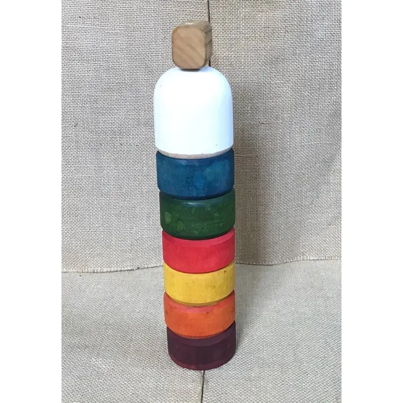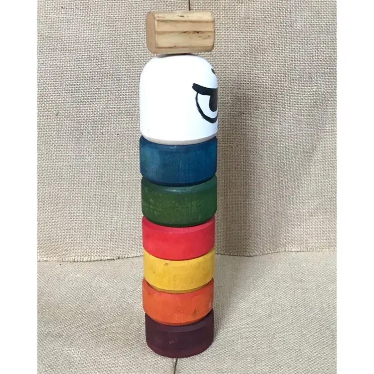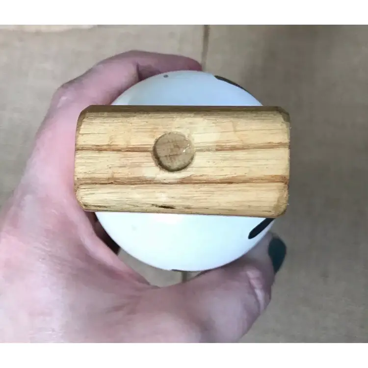 Condition: This piece seems to have been made exclusively for decorative purpose, as the stick does not seem to come out. The face drawing is imperfect and there is uneven coloring/discoloration on the pieces. Please note that the color runs when this is wet, which I learned the hard way when I cleaned this. There are some marks and nicks on the piece. The bottom red ring has a crack in it. There is some sticker residue on the bottom which, because of the color running issue, I’ve made no effort to get off. I would not recommend that you do it, either.