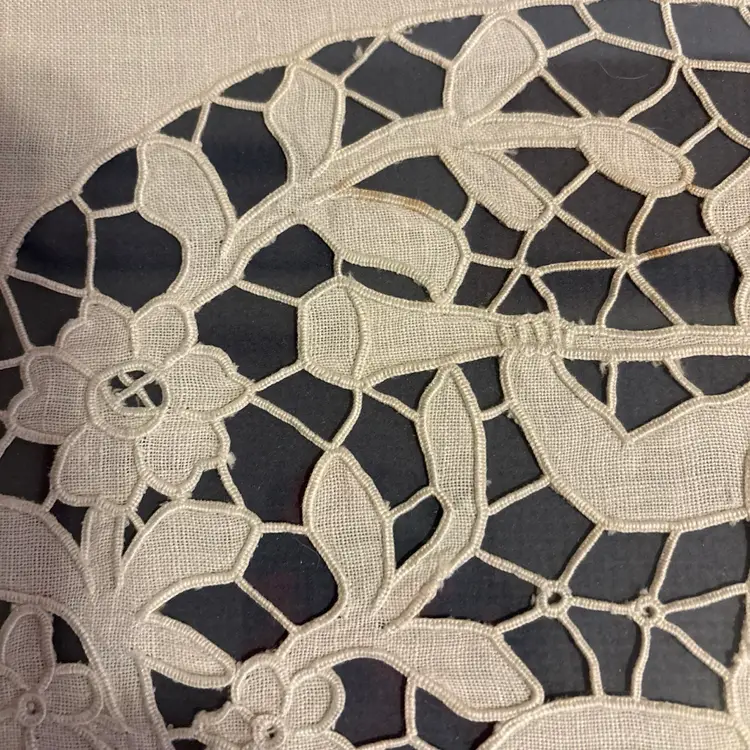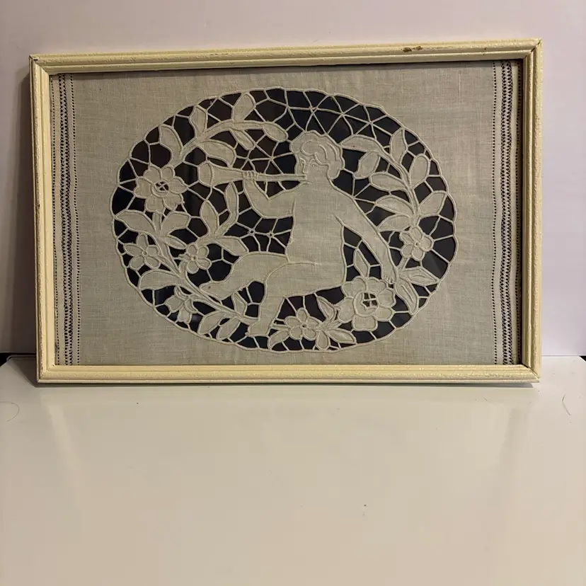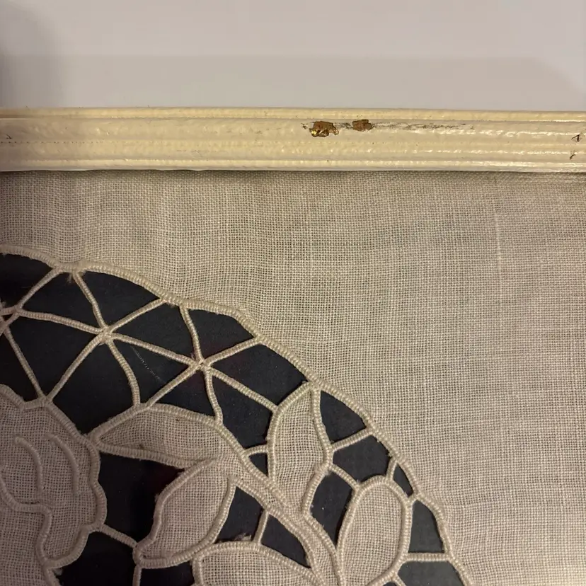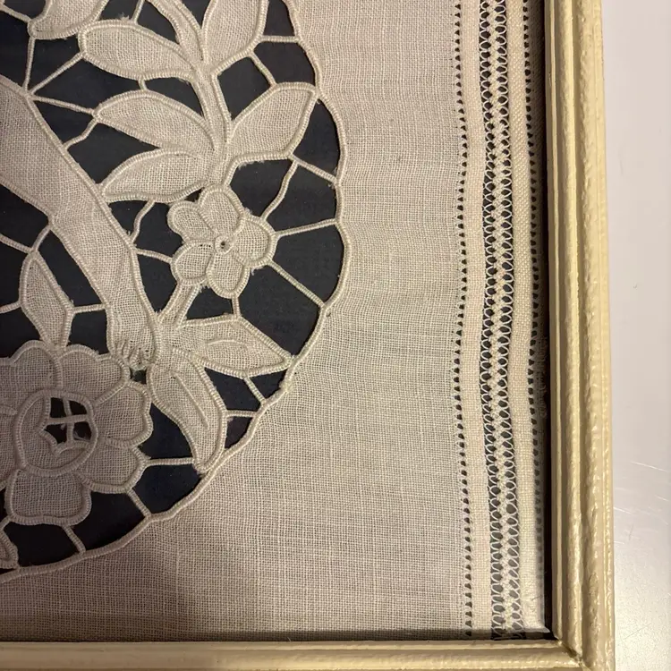 Disclaimer: I am not a master of textiles, lace or linens etc. this is a framed piece. Original unknown. Age unknown. Minor flaw in frame n minor stains on linen.