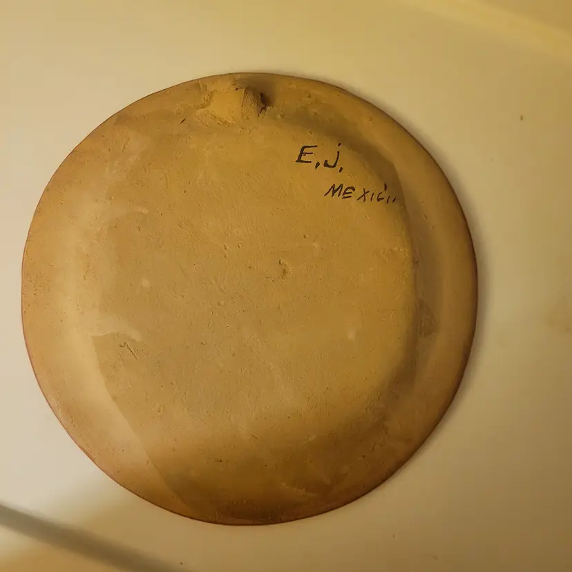 Vintage hand painted Tonala face plate signed E. J. Mexico. Measures 6 3/4" across. No chips or cracks. Minor irregularities, age wear/discoloration. Questions welcomed and thanks for viewing.