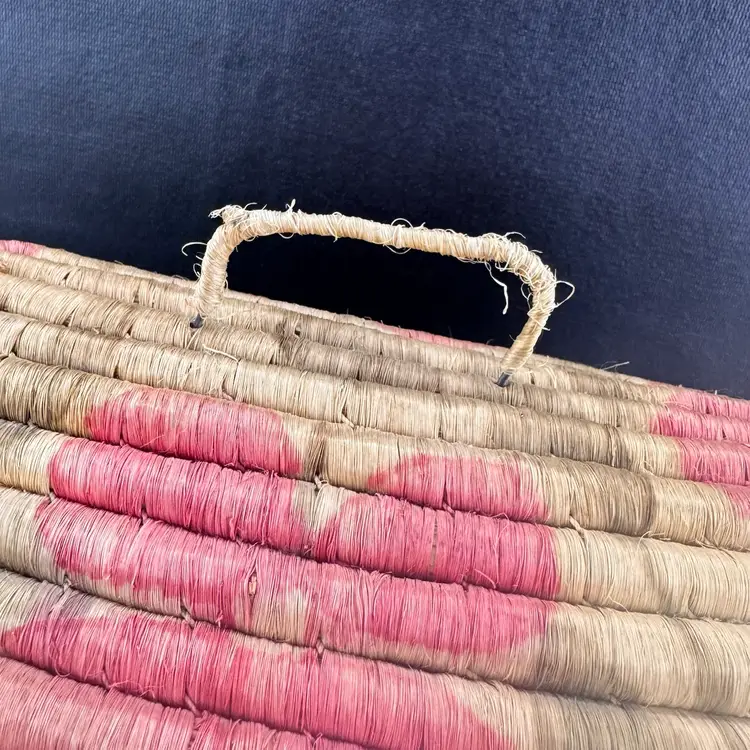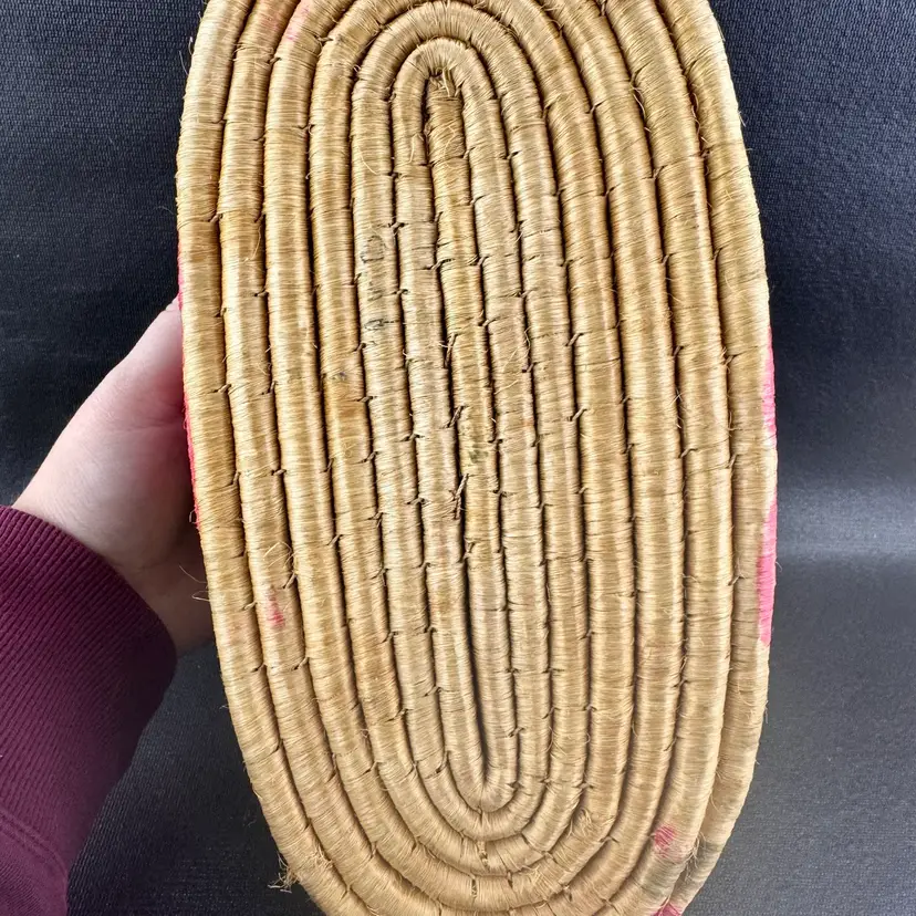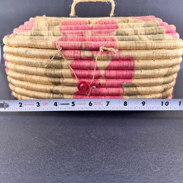 Beautiful handcrafted coil basket. A little wear on the corners, but otherwise in great shape. Approximately 5.5” tall and 10.5” wide.