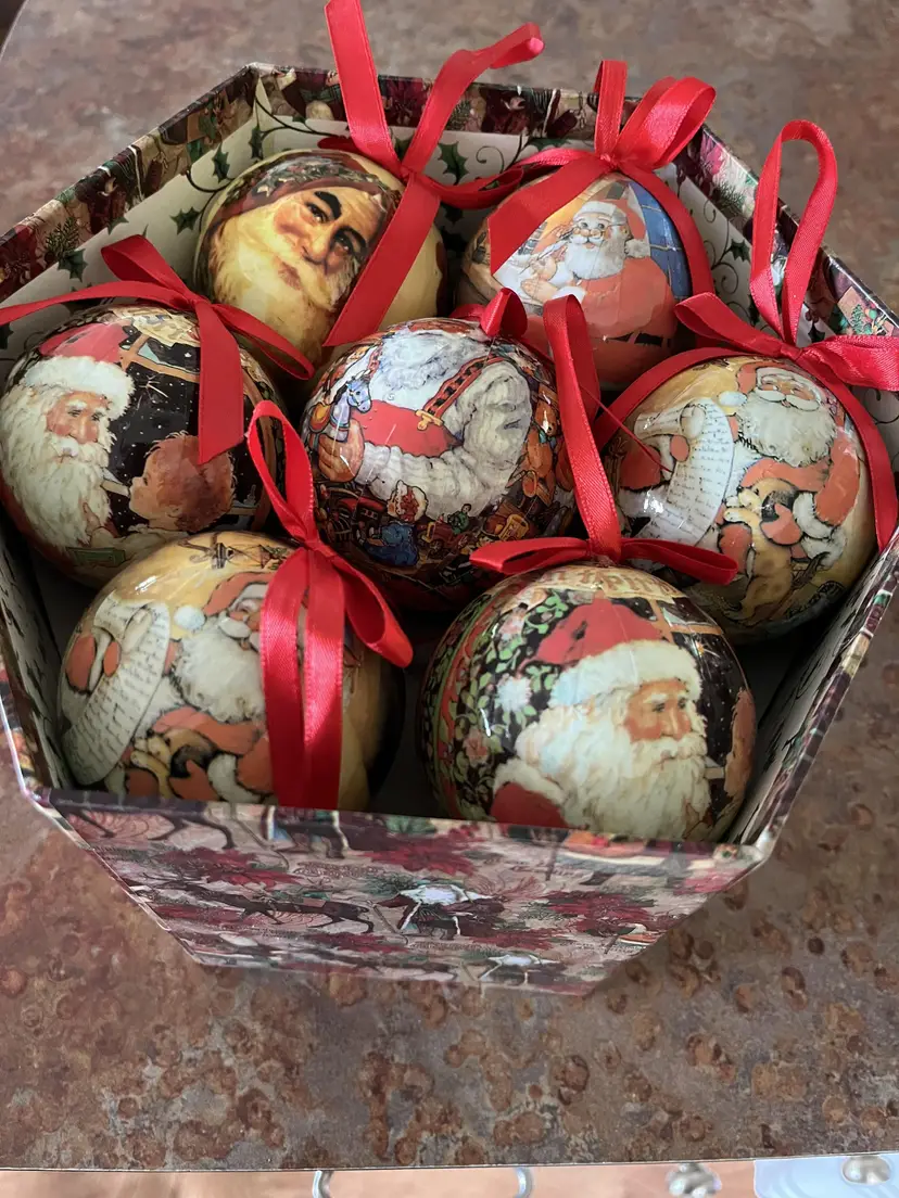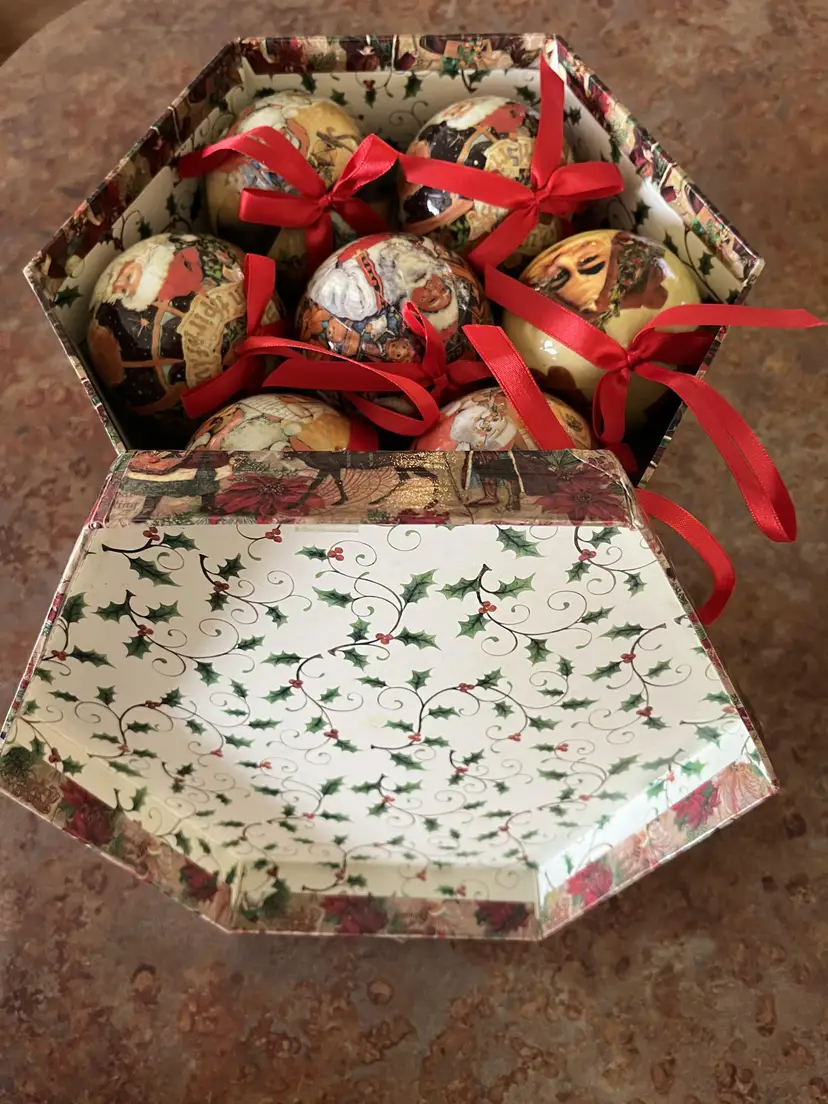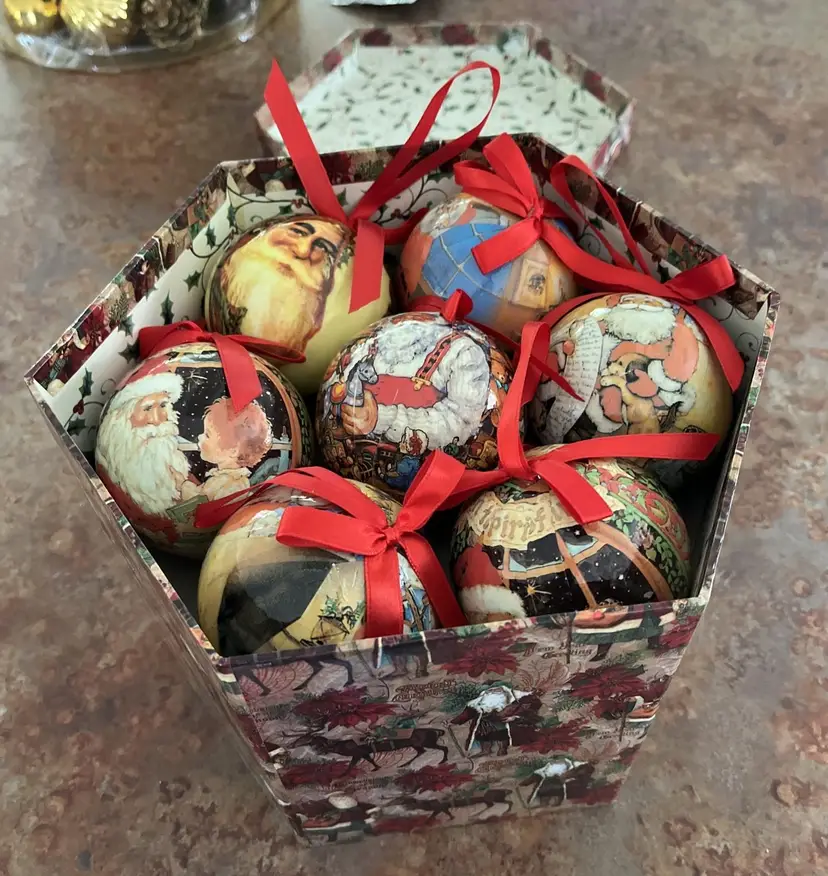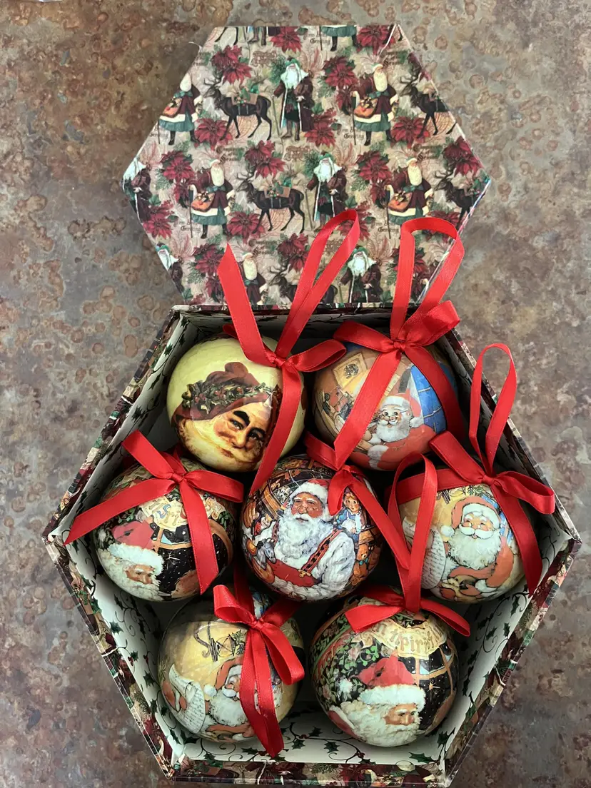 VINTAGE HEXAGON BOXED DECOUPAGE SANTA CHRISTMAS ORNAMENTS SET OF 14