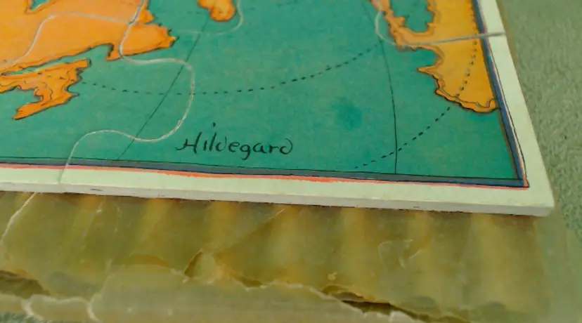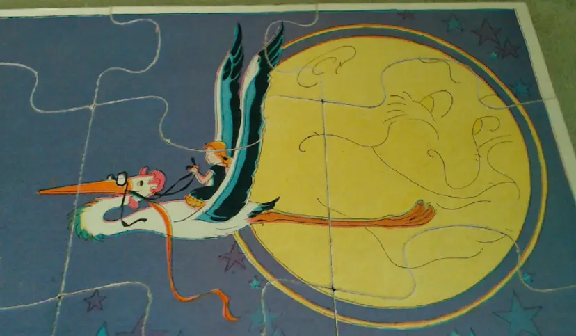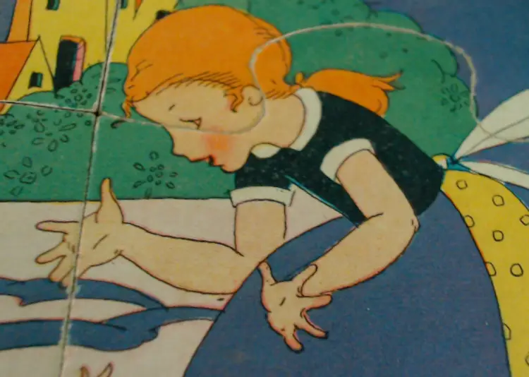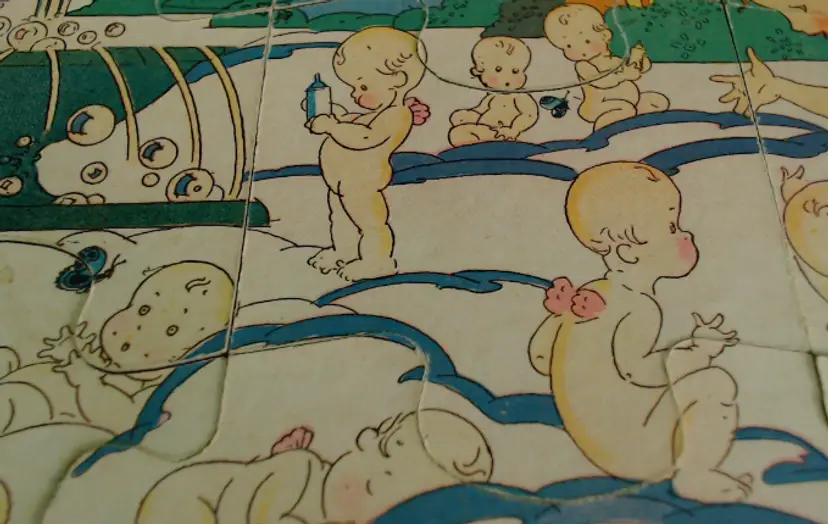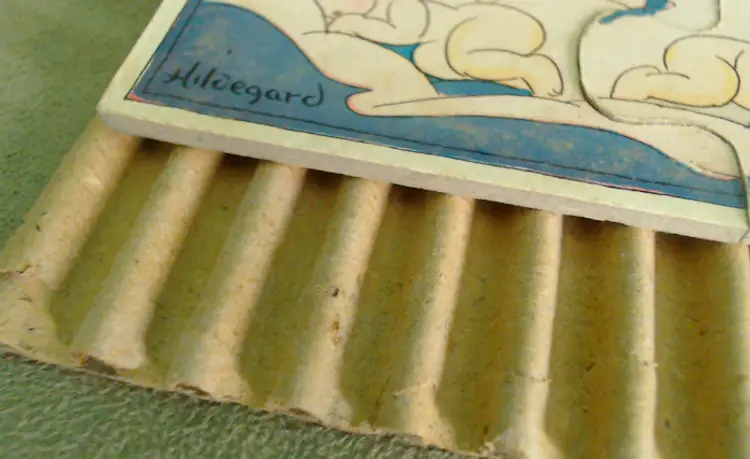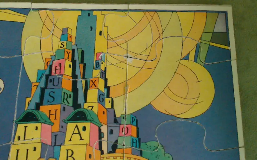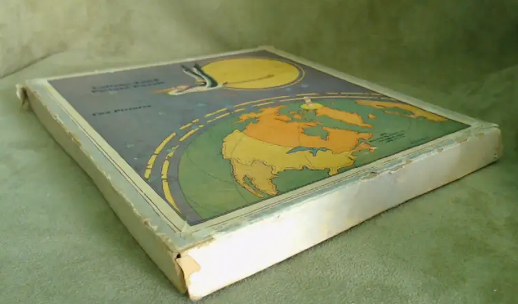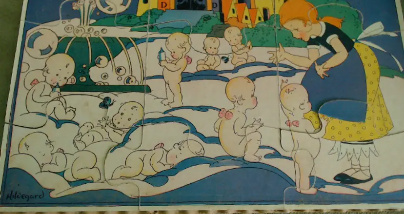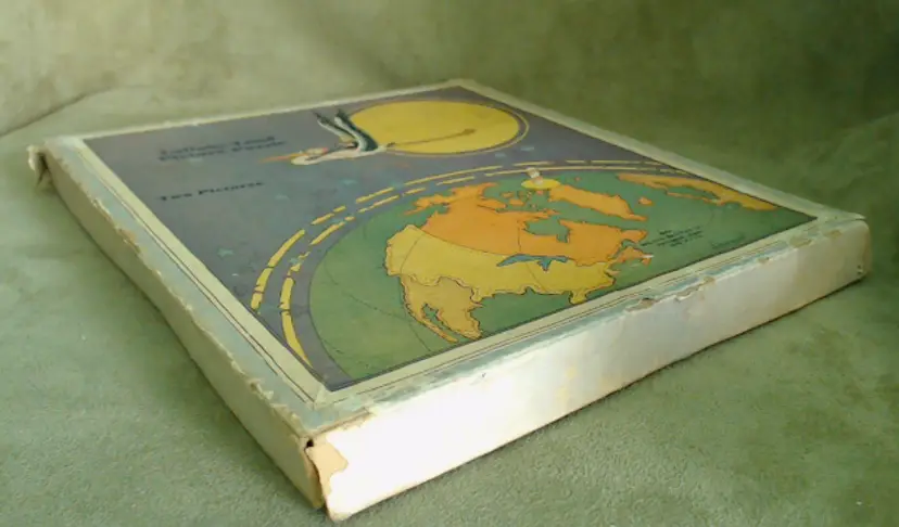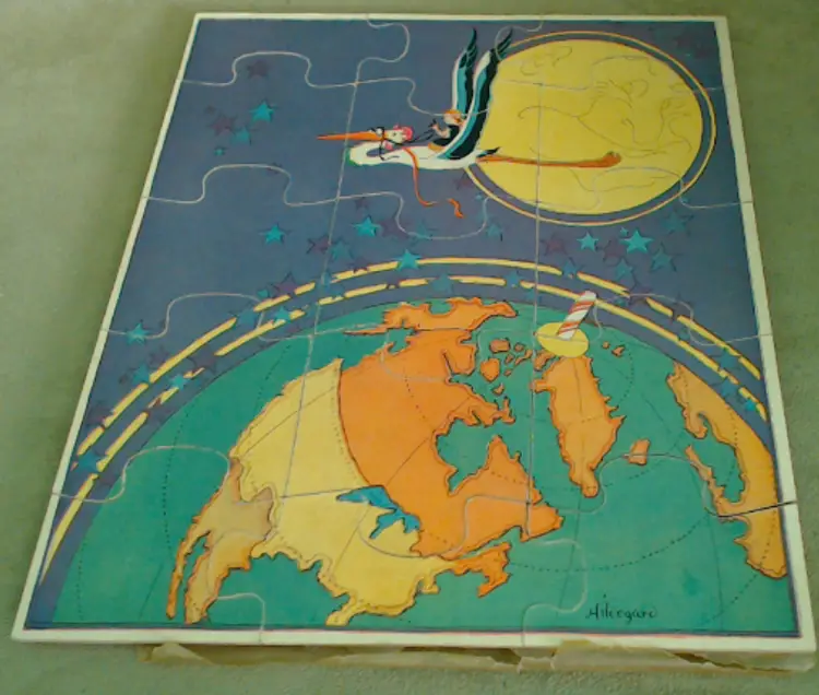 This is a vintage puzzle set, with illustrations from an adorable children's book! Made during the late 1920s or early 1930s, game company Milton Bradley produced these puzzles using the work of author and illustrator Hildegard Lupprian. Featuring two scenes from her 1928 book "Lullaby Land", both of these puzzles are beautifully stylish and charming. Just look at all those little babies at the castle, or that lovely man-in-the-moon watching over the world! Condition: This set is in Very Good shape! Both puzzles are complete, and even have the original cardboard inserts that separated them. There is a little bit of wear to the graphic paper on the Nursery Castle puzzle, but only on a couple of pieces. Both puzzles are still very vibrant, without water or light damage. The box does have some wear, especially at the corners, and a little fading from light damage. However, even the box itself still presents very well! Size: The box measures 8½" by 9½", and the puzzles nestle in perfectly.