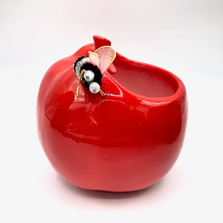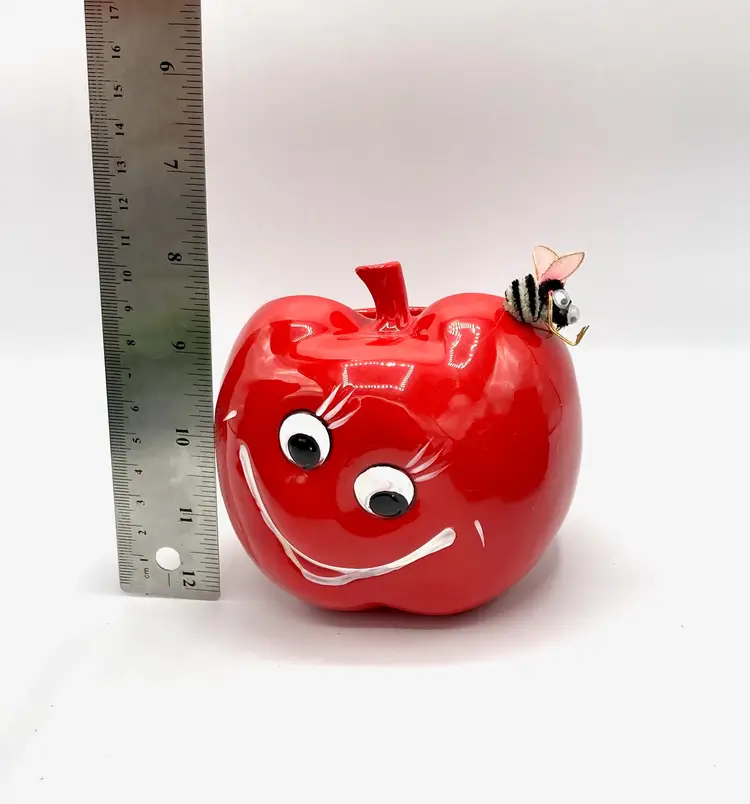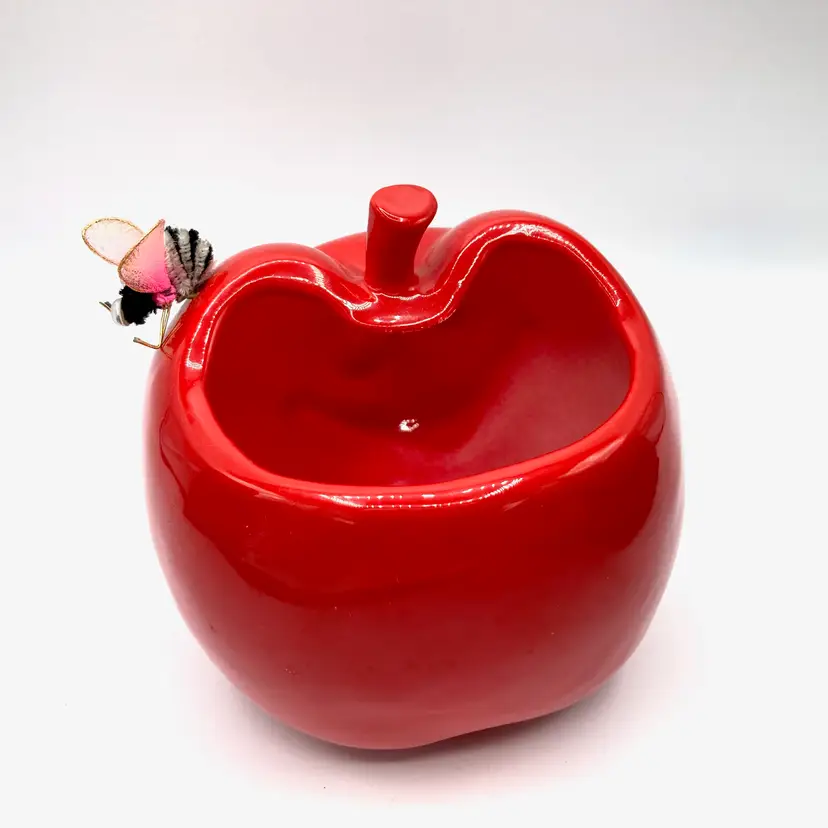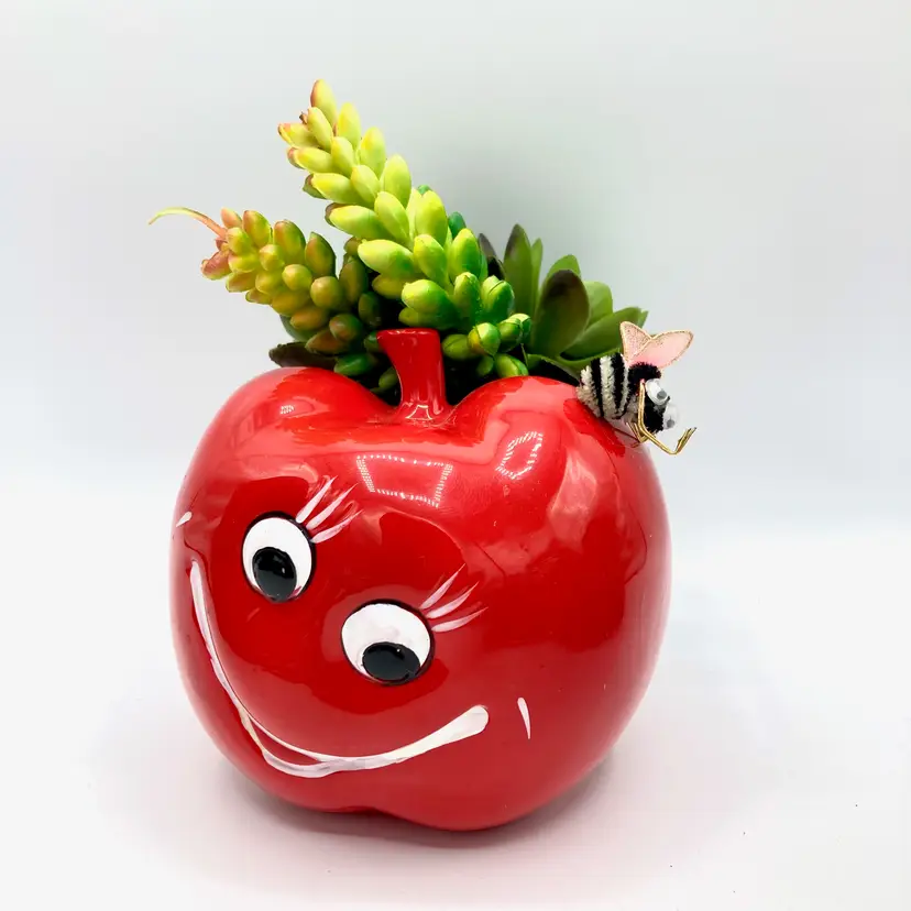 Vintage Inarco Shiny Red Apple Planter ~Kitschy smiling apple w/ a bumble bee on it's head ~Add a real or faux plant to use as a planter ~Optional uses: pen/pencil cup, kitchen sponge holder, paint brush jar etc ~Please see all images as they are an important part of the description ~Measurements: approx 4.5" X 4.5" ~Made in Japan in the 60's