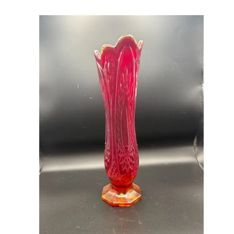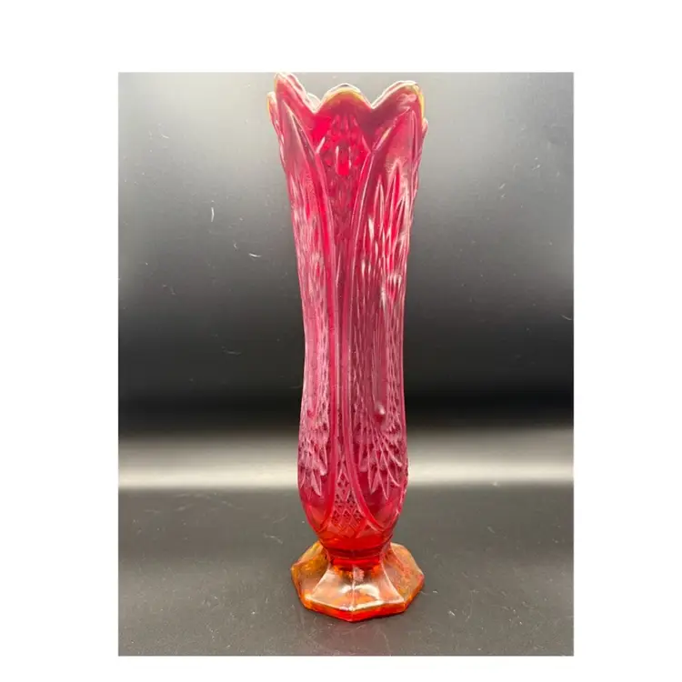 Made by Indiana Glass Company as part of their Heirloom Series, which re-issued near-cut patterns from the 1900s. Iridescent Sunset is a red to amberina (ombre) effect, giving it the iridescent, glossy finish. This was produced from te 1970s to 1980s. It is a swung vase referring to the method of shaping the hot glass by swinging it to elongate it. The "heirloom" pattern is also known as "Panelled Daisy and Finecut." Orange UV Glow.