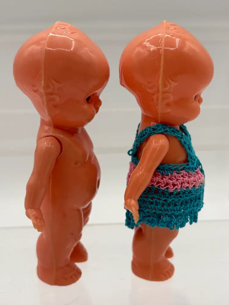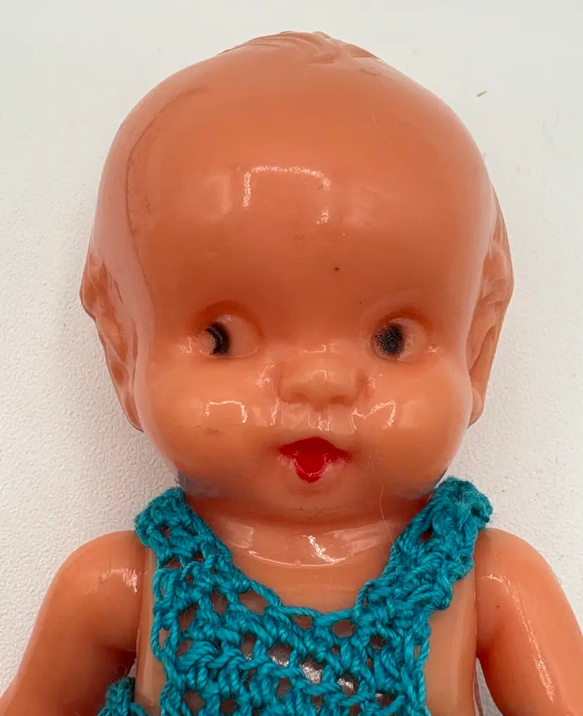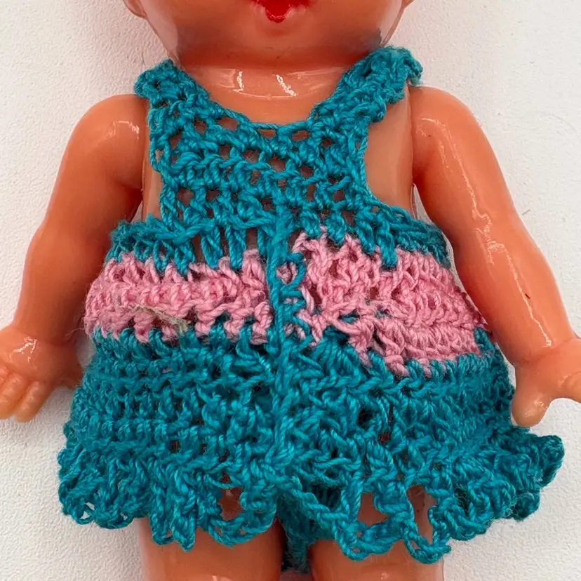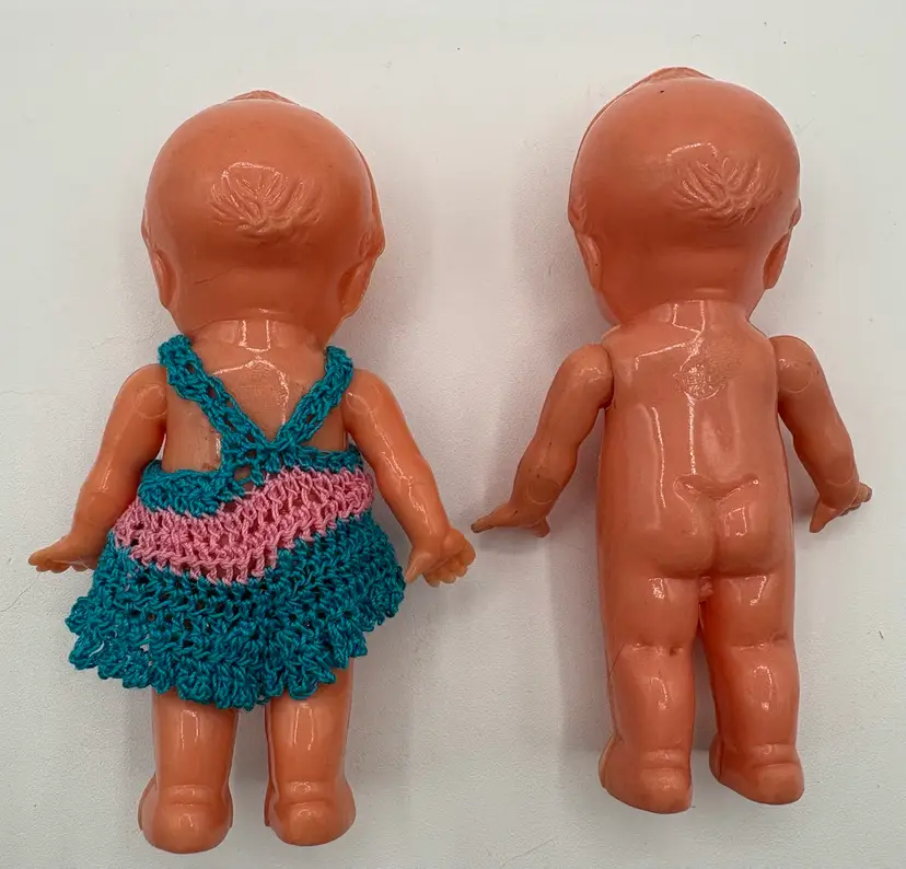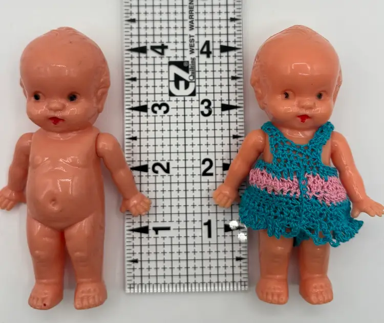 Set of two 4 1/4”H side-eye Irwin marked dolls. Jointed arms. One doll is wearing a little crocheted teal and pink jumper. The other doll has a few surface marks, but otherwise good condition. Please review the images. Dolls are a hard plastic.