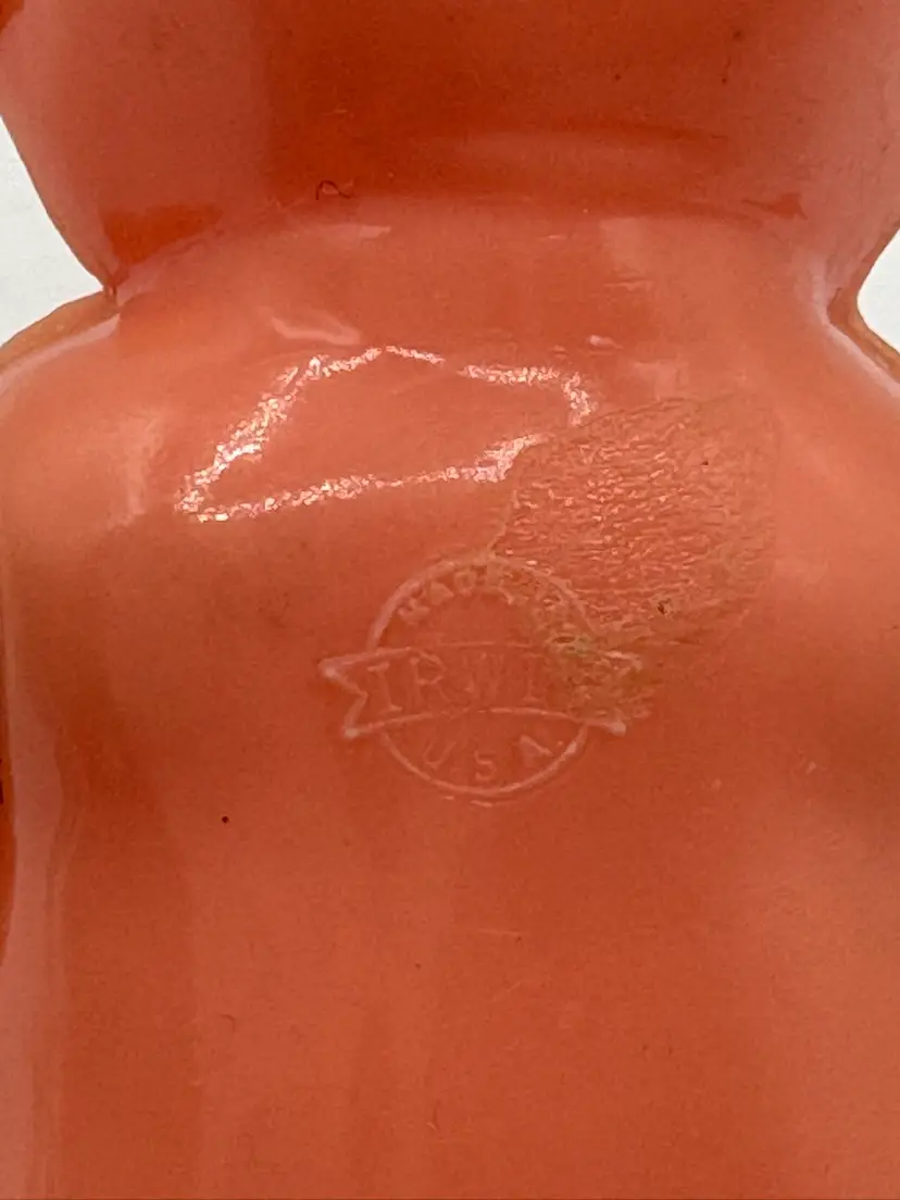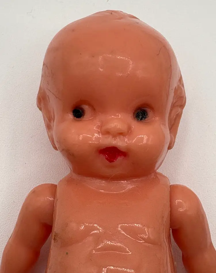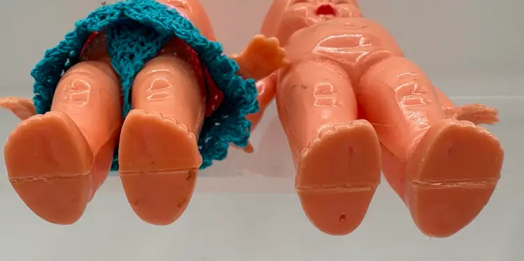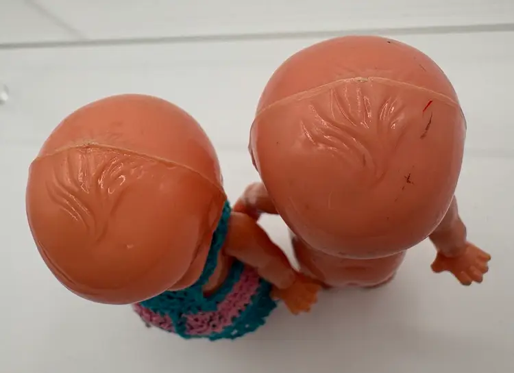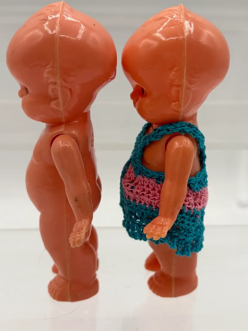 Set of two 4 1/4”H side-eye Irwin marked dolls. Jointed arms. One doll is wearing a little crocheted teal and pink jumper. The other doll has a few surface marks, but otherwise good condition. Please review the images. Dolls are a hard plastic.
