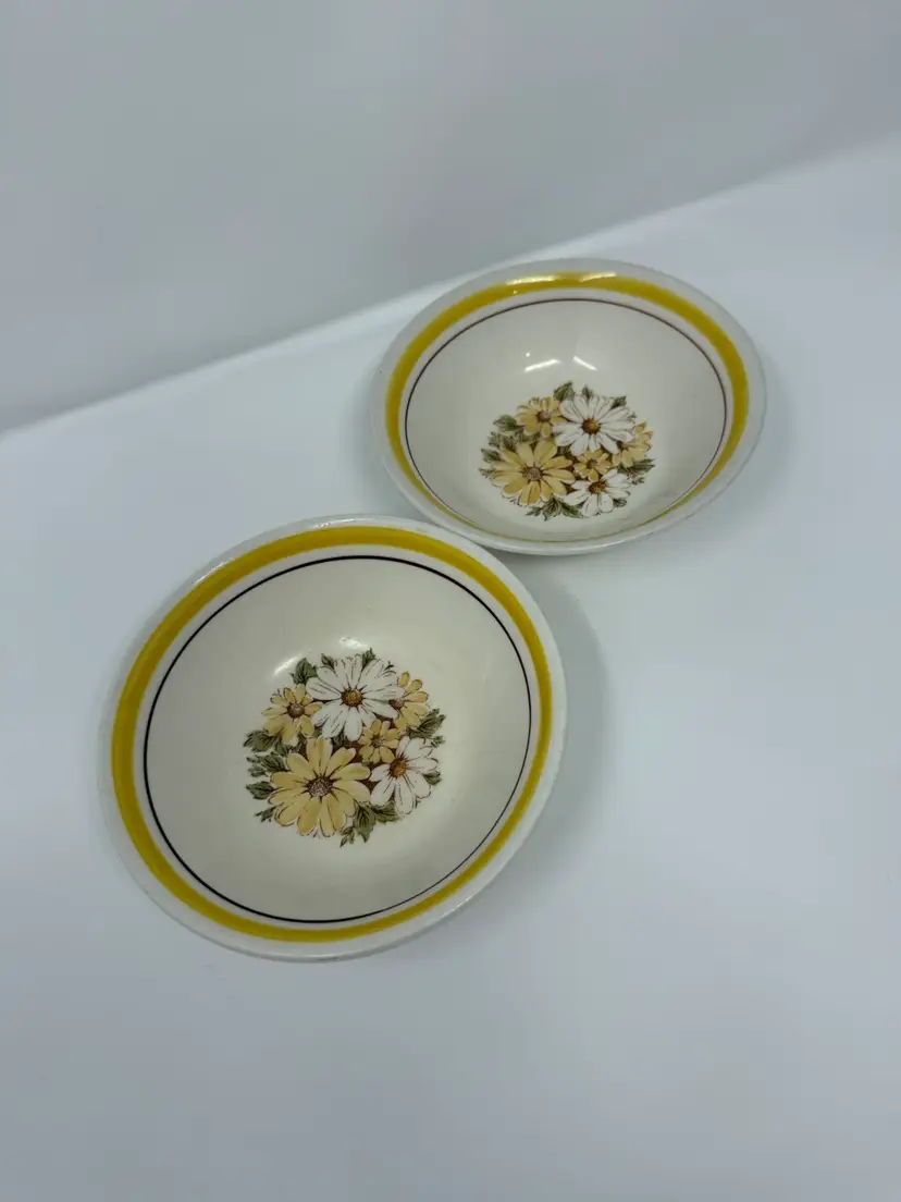 2 bowls with yellow and white daisy print. Yellow and brown stripe along inside edge. Made in Japan 6” round, 2” tall