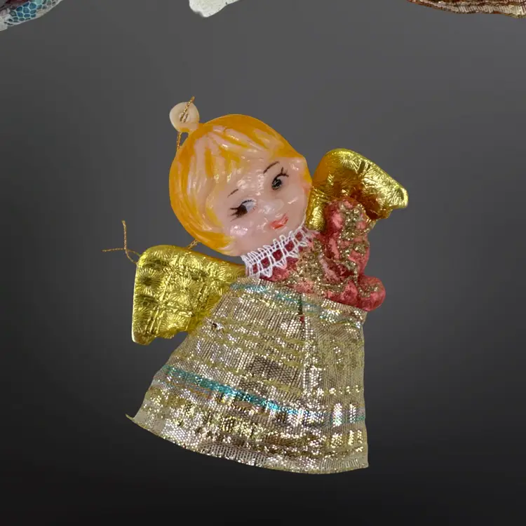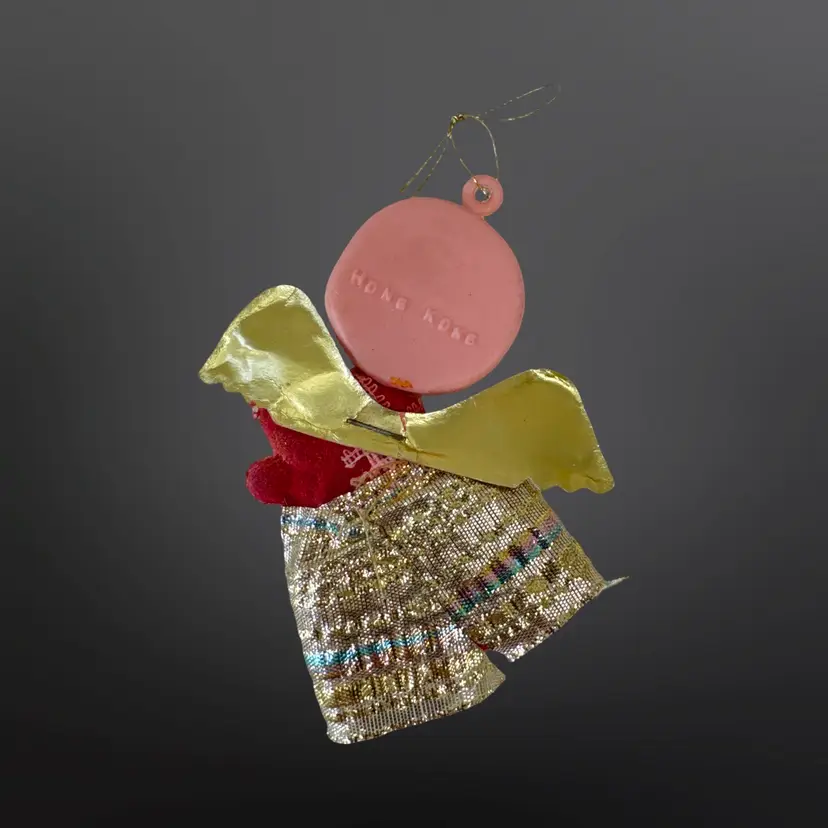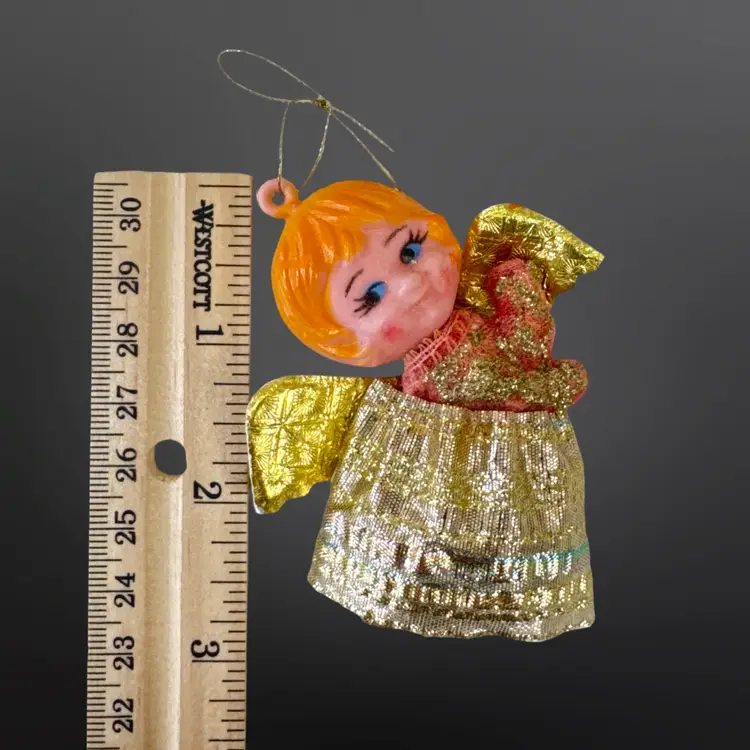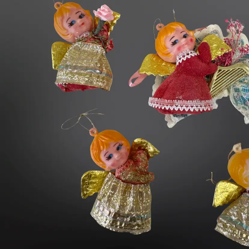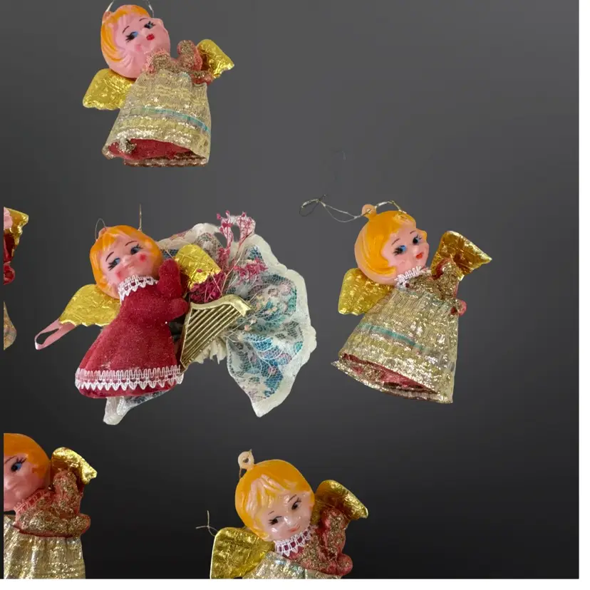 Great set of 6 vintage kitschy plastic flocked angel ornaments marked Hong Kong on the back. They are in good overall condition with some wear, especially one angel’s face. Measures approximately 3” tall each