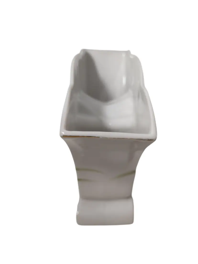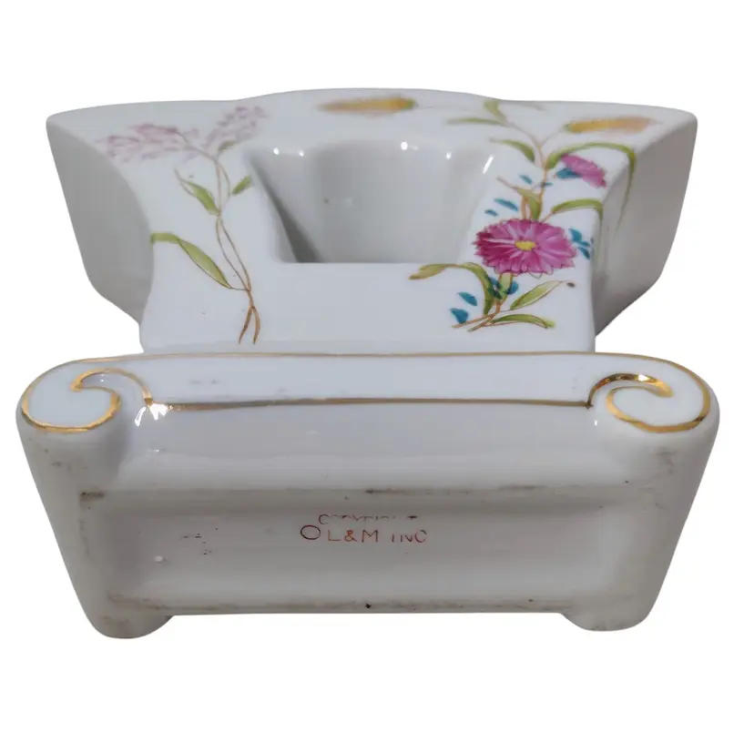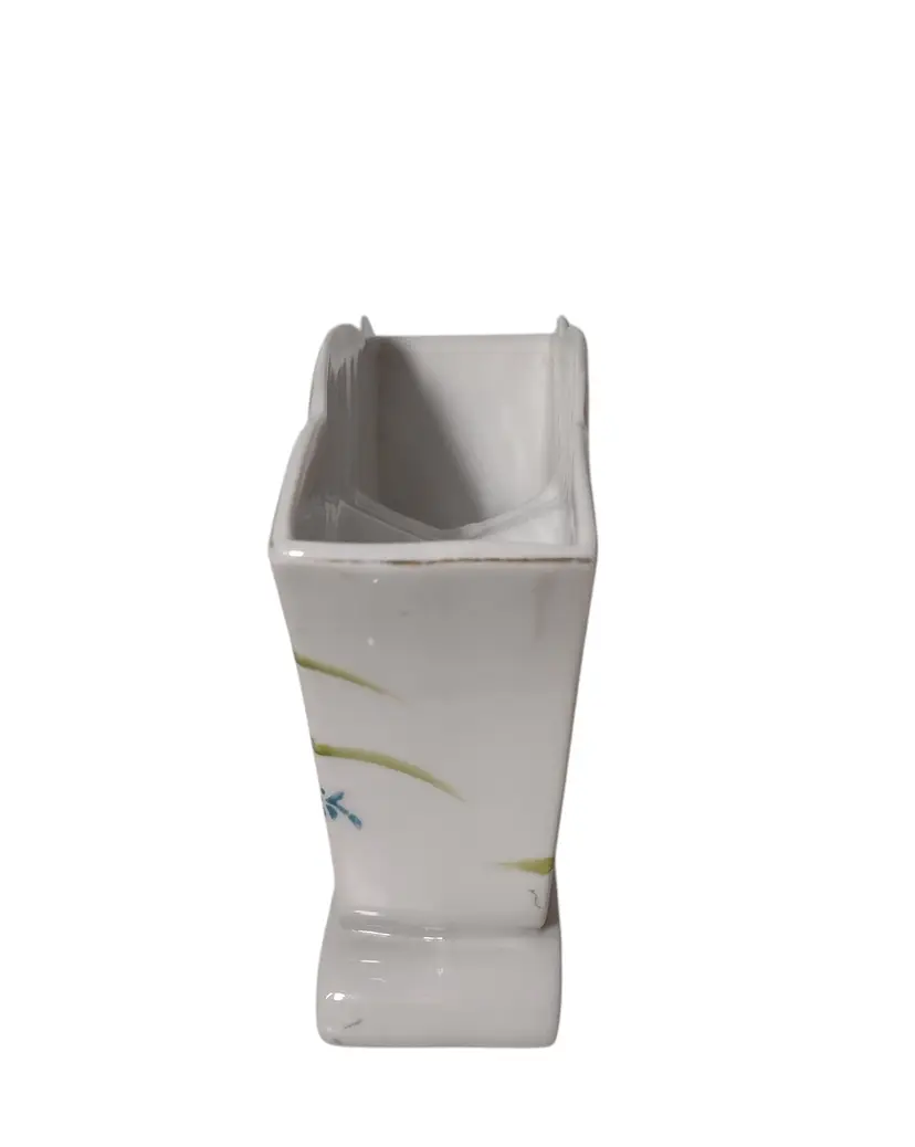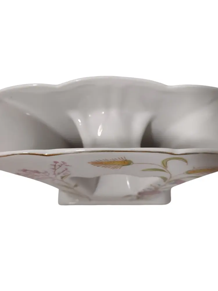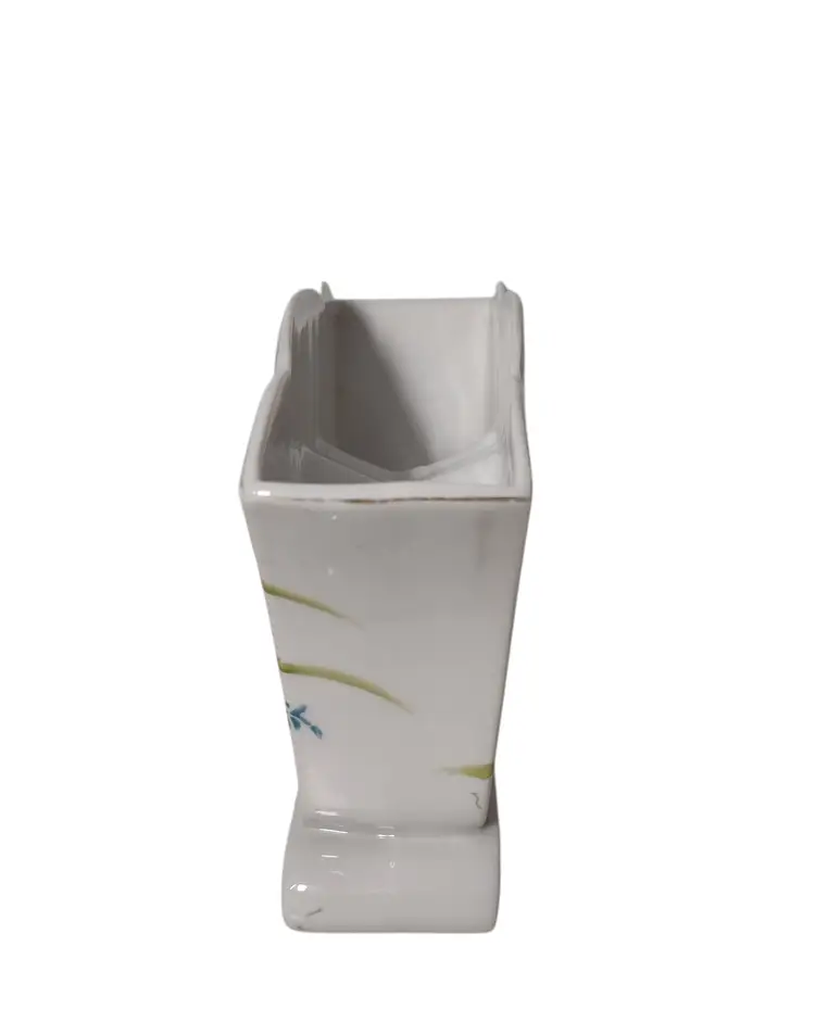 This is a very pretty floral porcelain vase with scalloped trim and a scrollwork base. This is divided inside where the cut out is. Vase measures 5" tall x 6" wide x 2" depth.