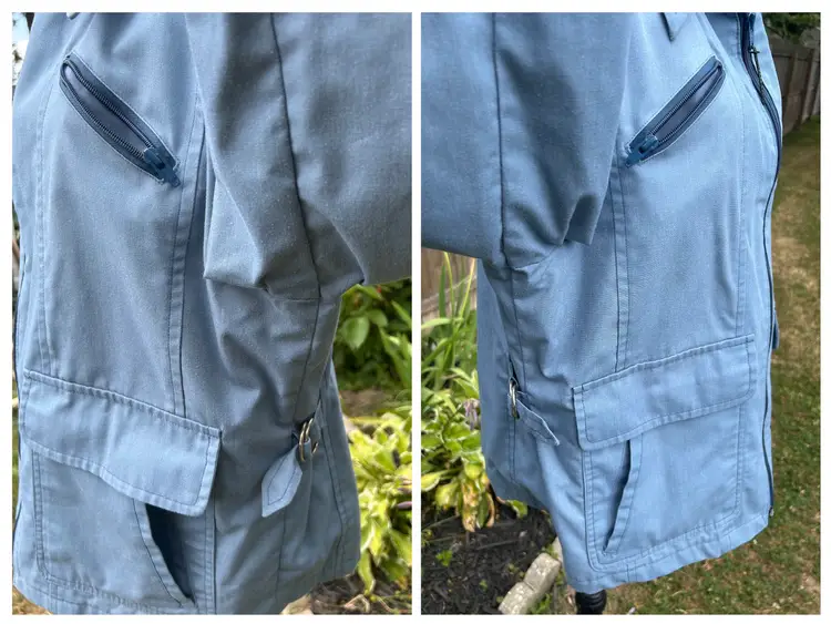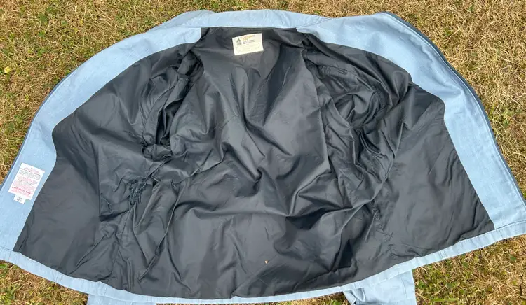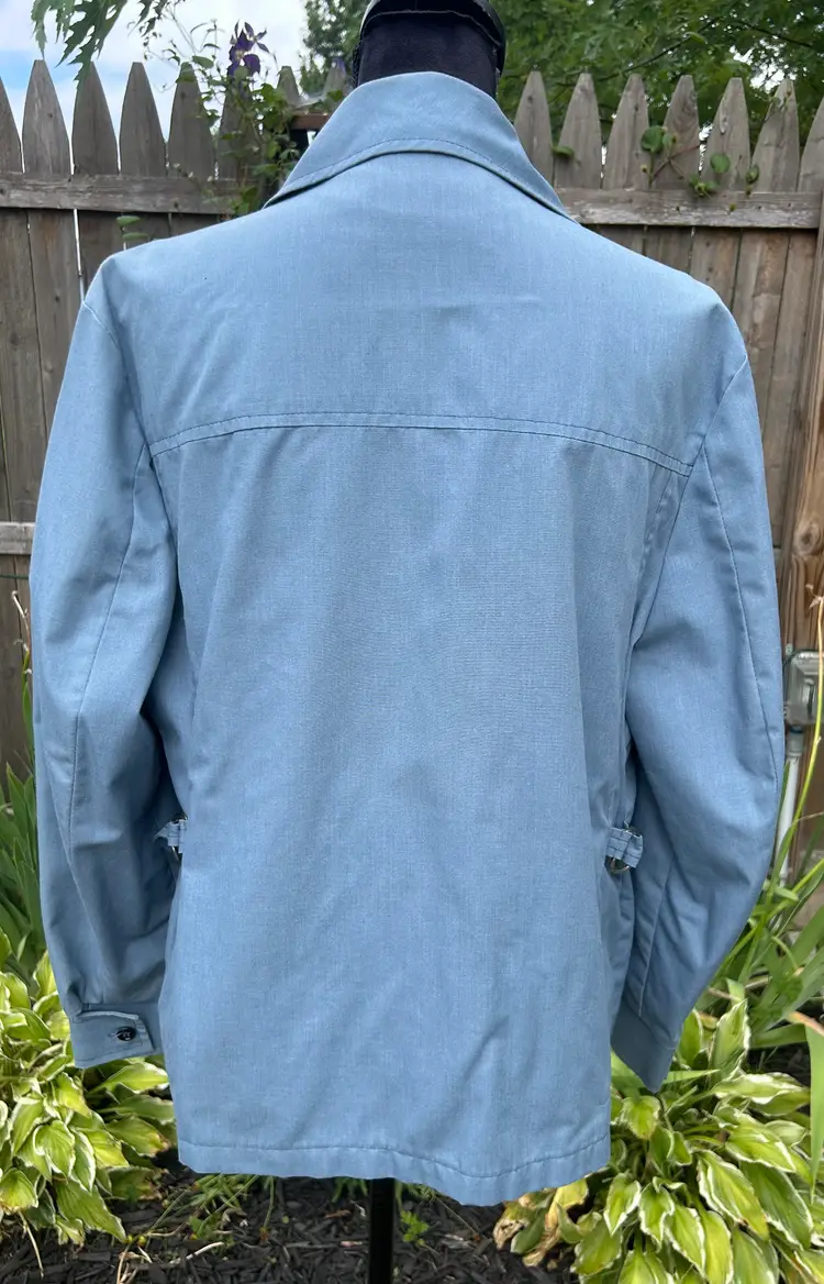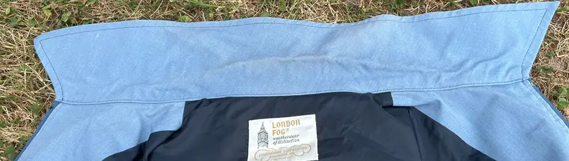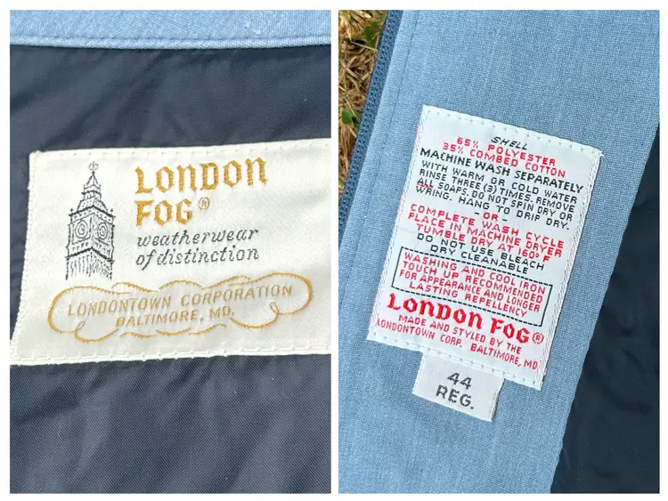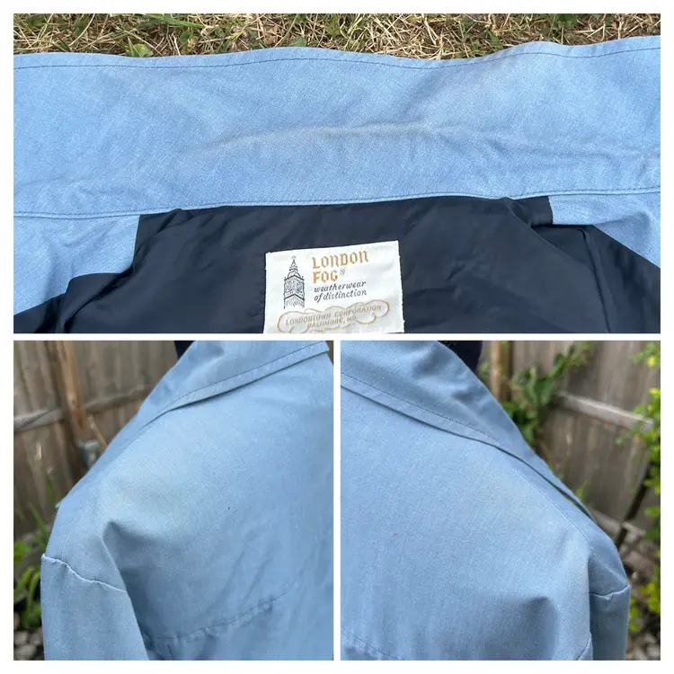 Brand/Maker- London Fog Size- Marked 44 Please see measurements below - would be approx. a modern XLarge Color- Blue Condition description- No rips, tears on outside shell. Collar and shoulders have discoloration. Seam below right armpit in lining is ripped - see photos for closeup. Zippers intact and functional. Fabric- Shell - 65% Polyester 35% Combed Cotton. Made in- USA