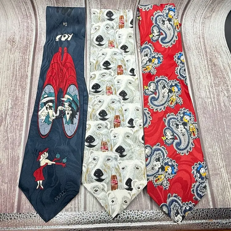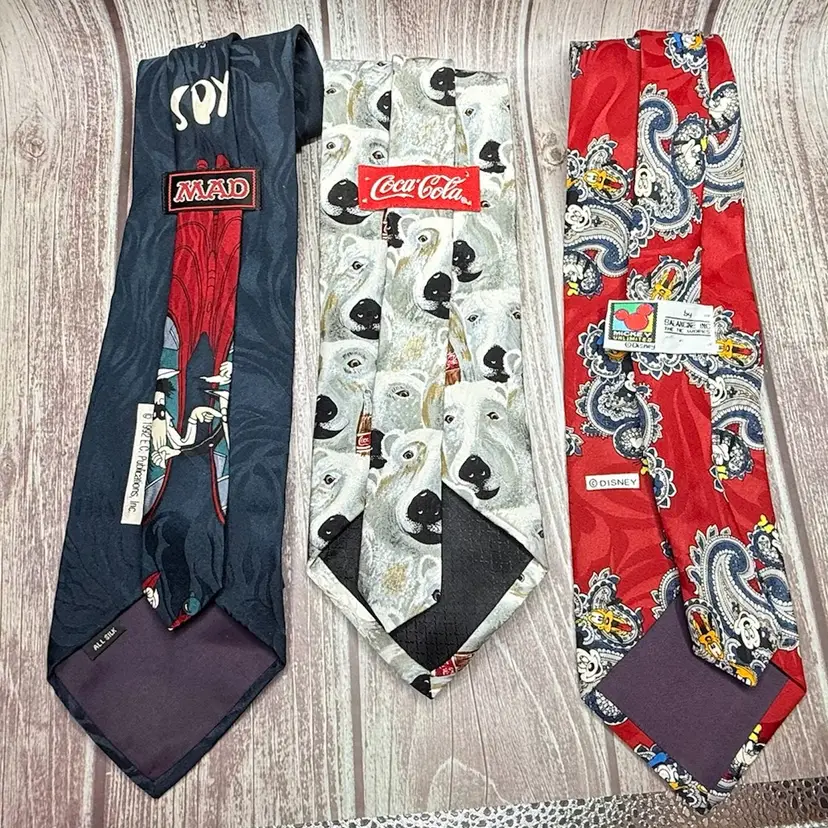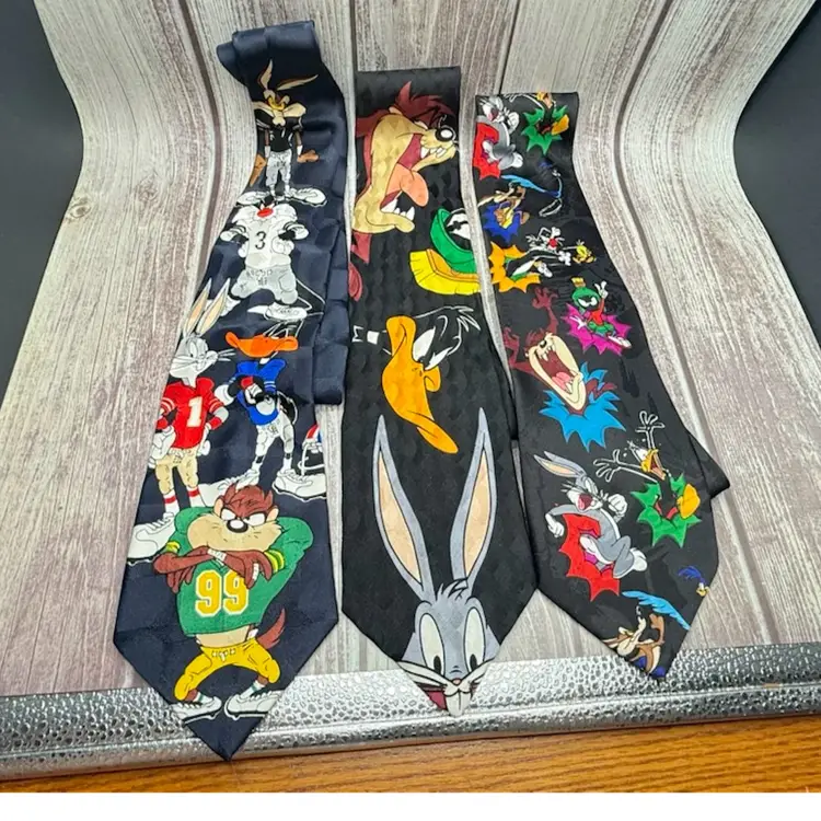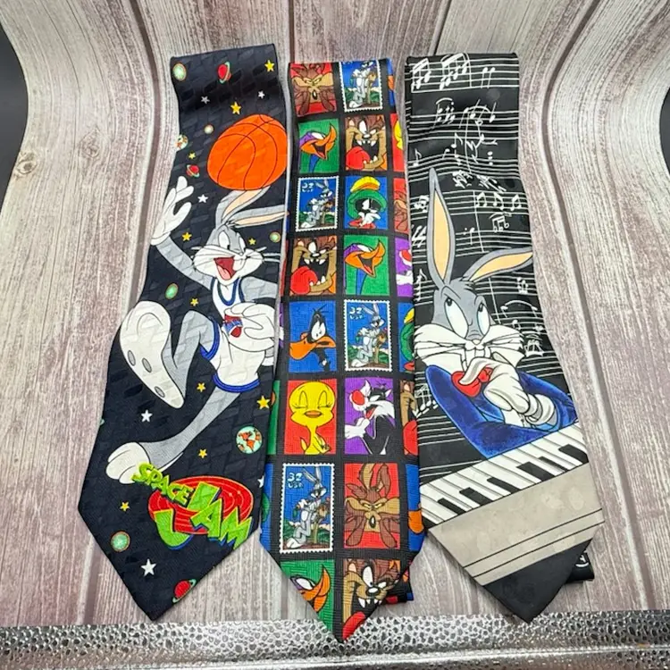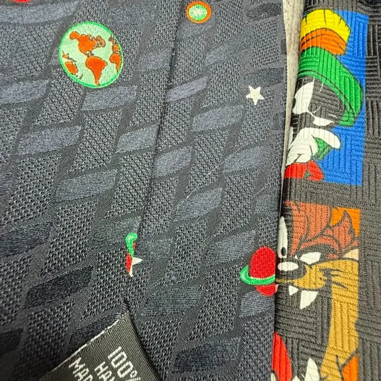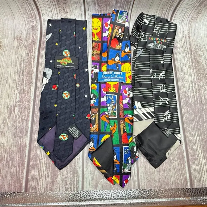 All in nice clean condition, have done my best to check them each over very well. Mickey Mouse tie has a little wear on the back where it was tied and tag is loose on one side. Space Jam tie has a snag spot on the back. Please see photos of what is included in the lot. If you live in the Omaha Nebraska area, I’m able to meet so you can save on shipping.