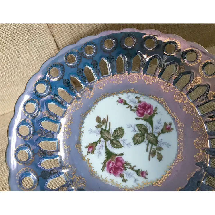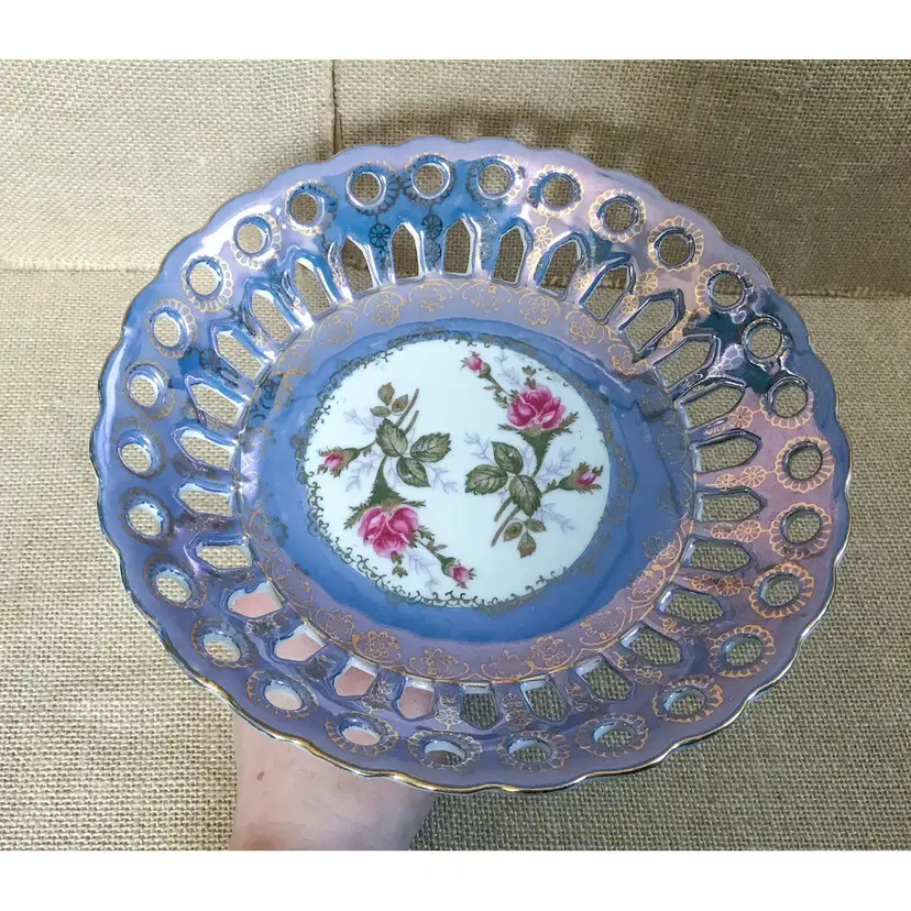 Vintage Lusterware Floral Pedestal Basket Bowl Centerpiece MCM Victorian Cottage