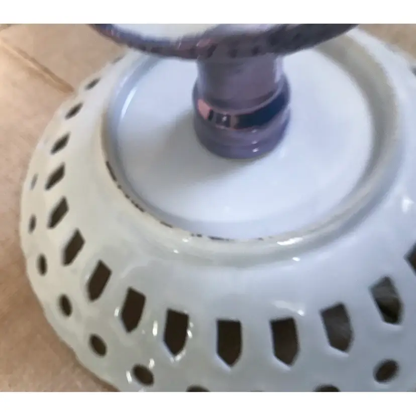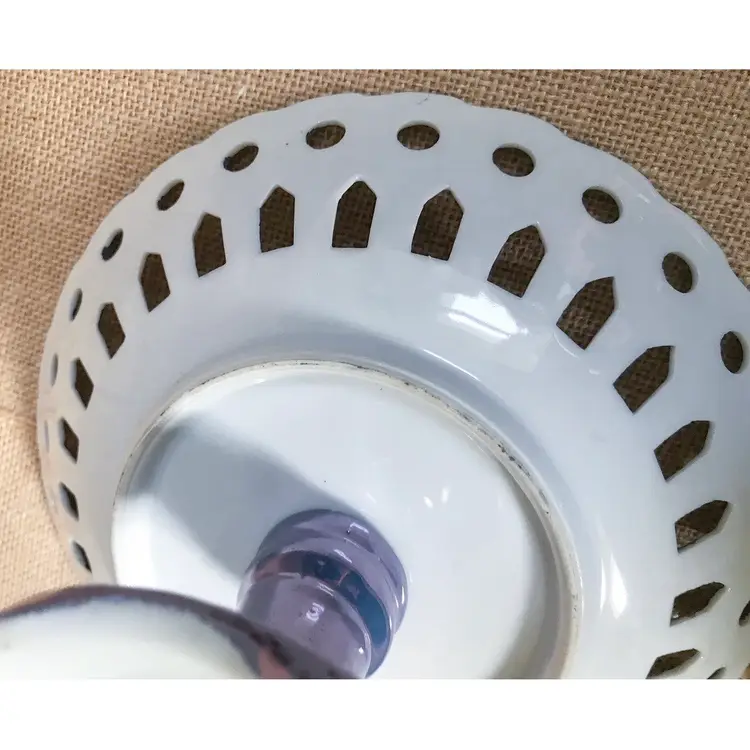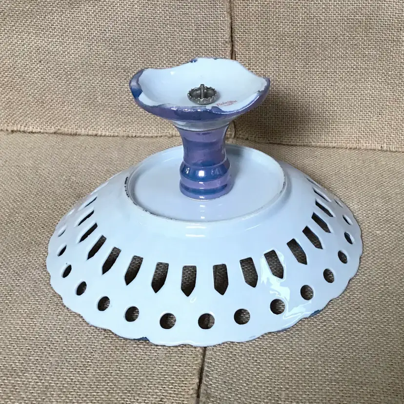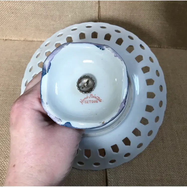 Condition: Many scuffs, scratches, and areas of color wear in basket and around basket edge. Some staining on bottom of bowl. Some tiny marks on pedestal. Some fade to flowers on pedestal. Pedestal can be tightened, but does loosen easily. I believe the pedestal may be removable, but I am not entirely sure, and I don’t want to ruin the piece by trying to remove it myself.