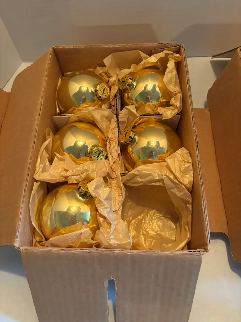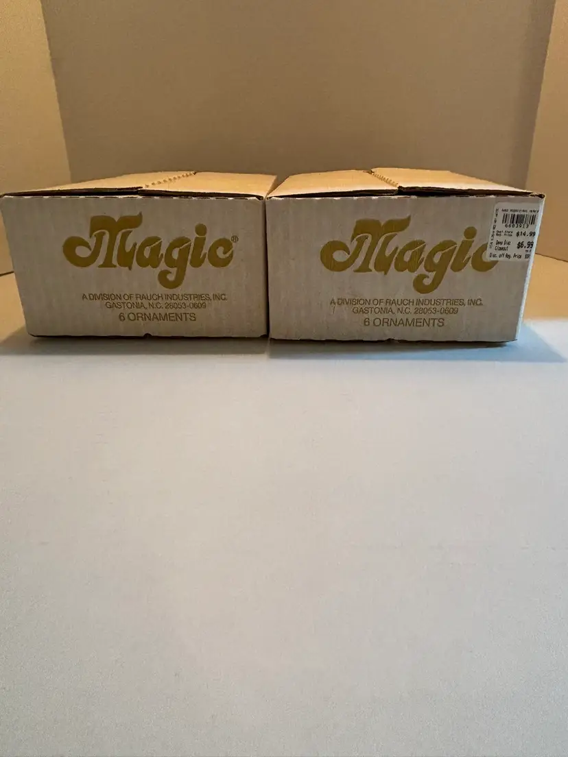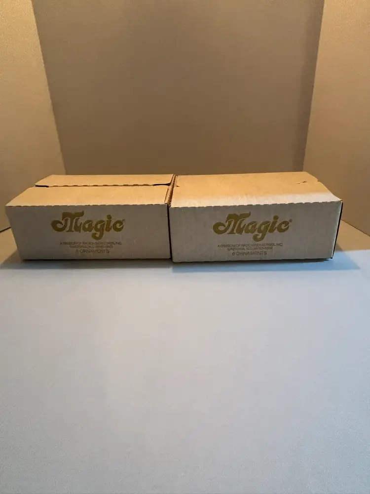 This lot of 2 vintage Magic brand Christmas ornaments in red and gold features a solid round shape, perfect for adding a touch of nostalgia to your holiday decor. Made of glass, these ornaments come in their original box with one ornament missing in each box. The classic Christmas theme and vintage appeal make them a charming addition to any ornament collection. ONE ORNAMENT IS MISSING IN EACH BOX. THERE MAY BE SCRATCHES FROM AGE AND USE