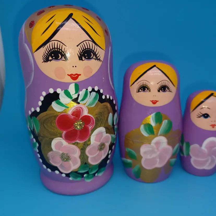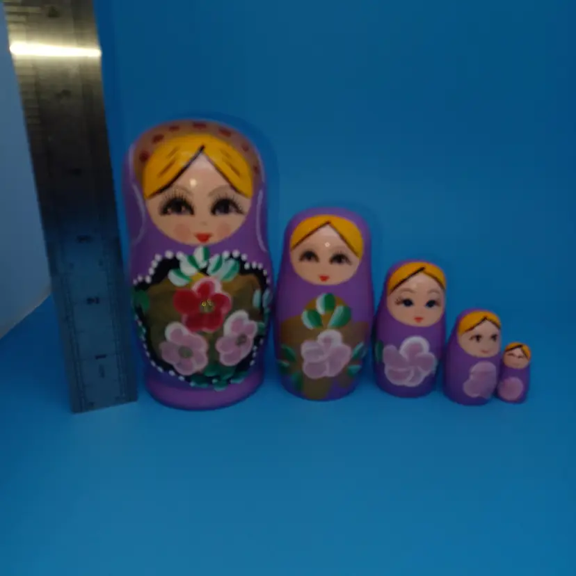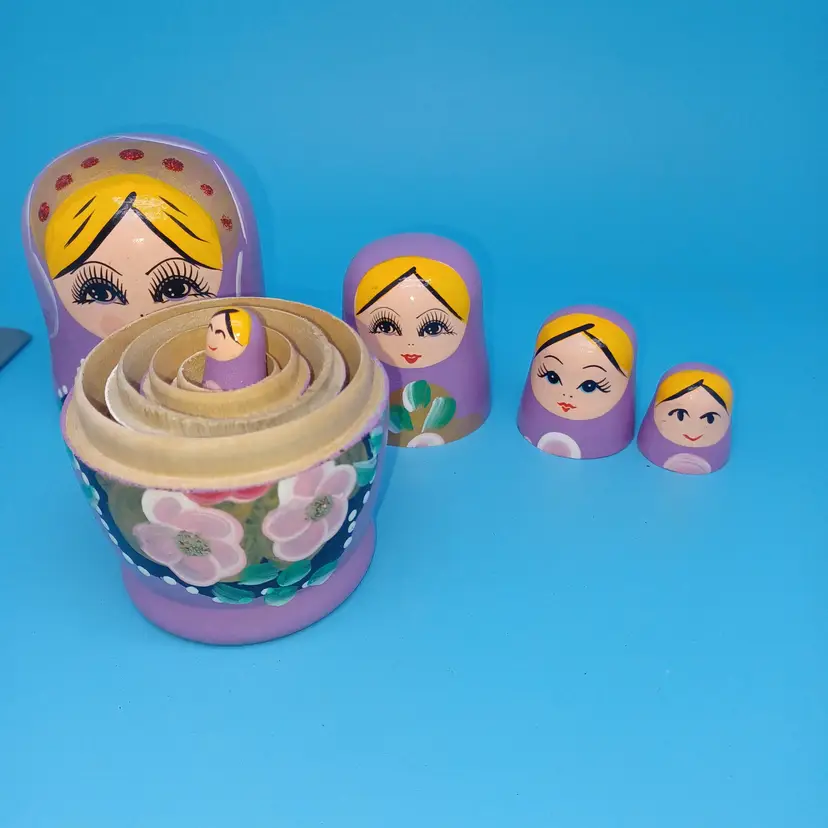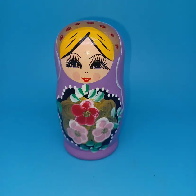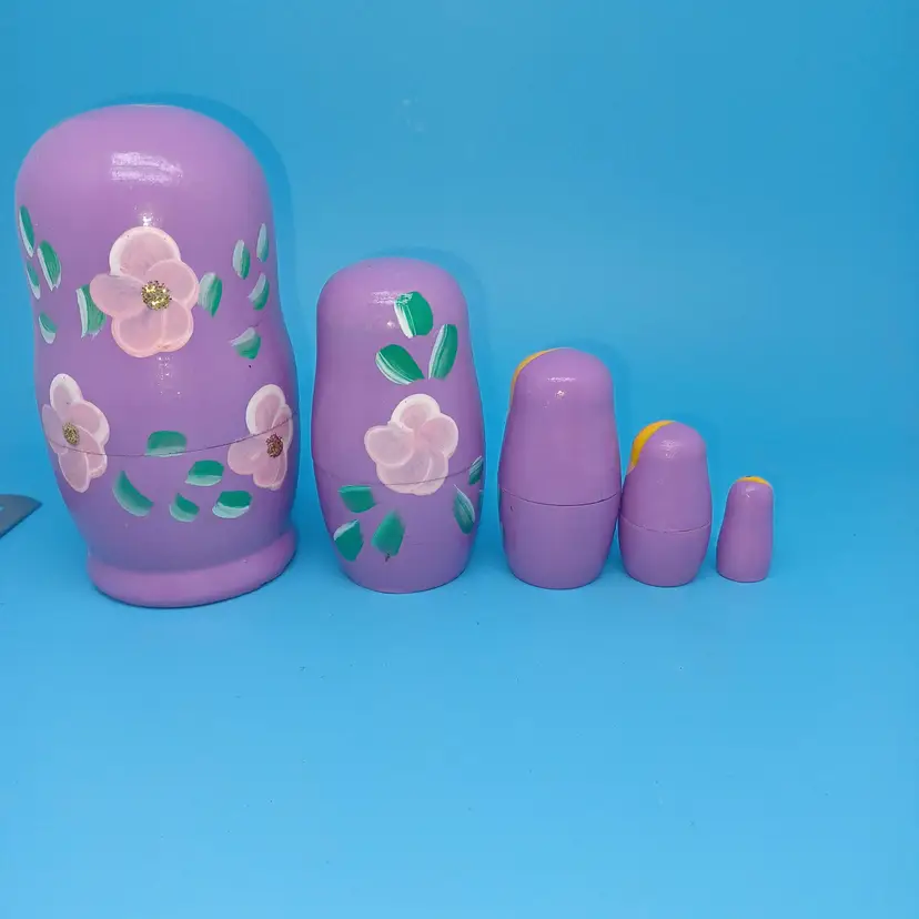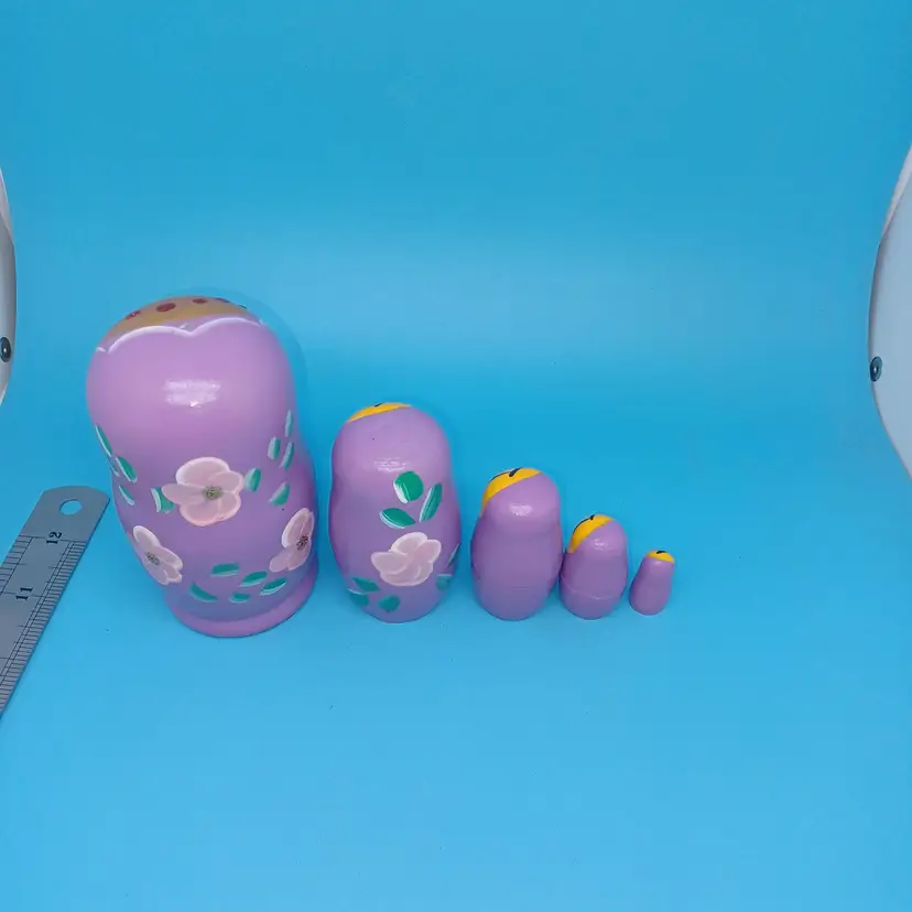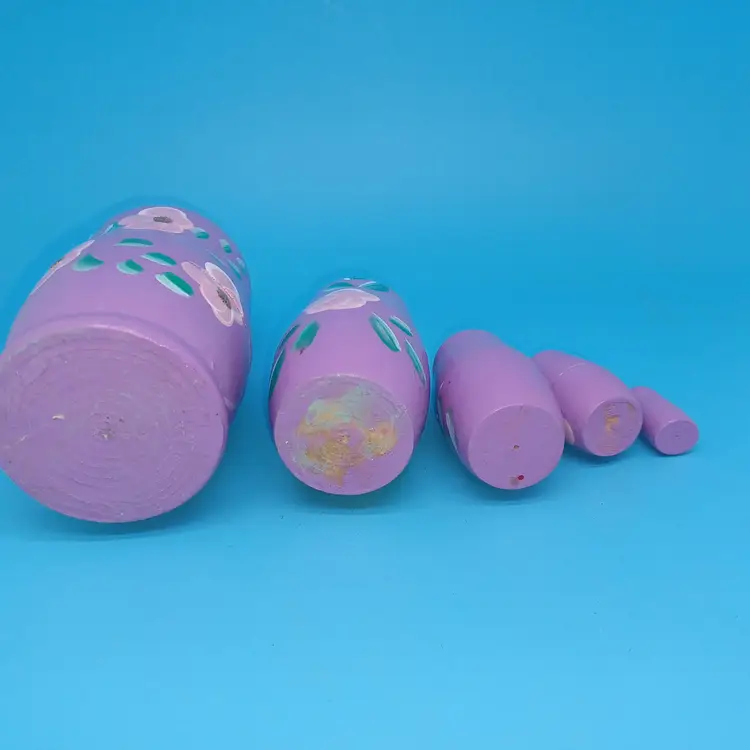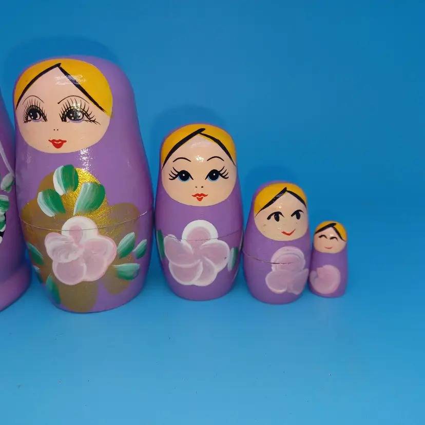 Vintage Matryoshka Russian Nesting Doll 5 piece 5 in Lavender Hand Painted Hand Turned Largest 5 in Smallest 1 in Please see all pictures as they are the best description All items from a smoke-free home with pets Experienced fragile shipper