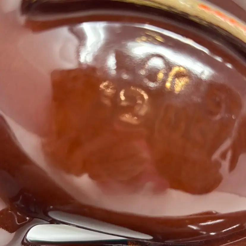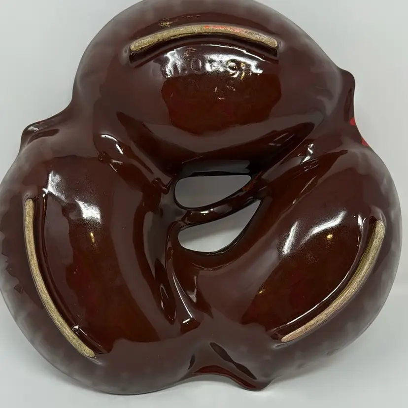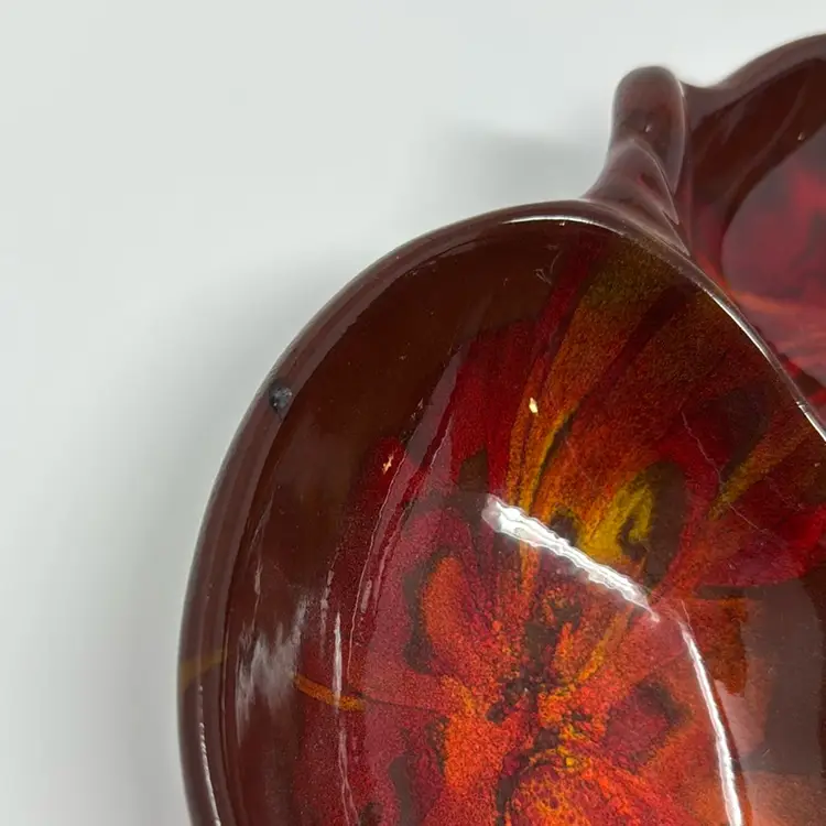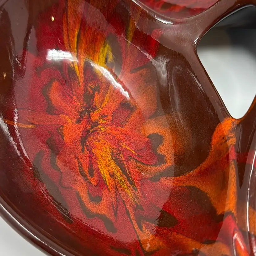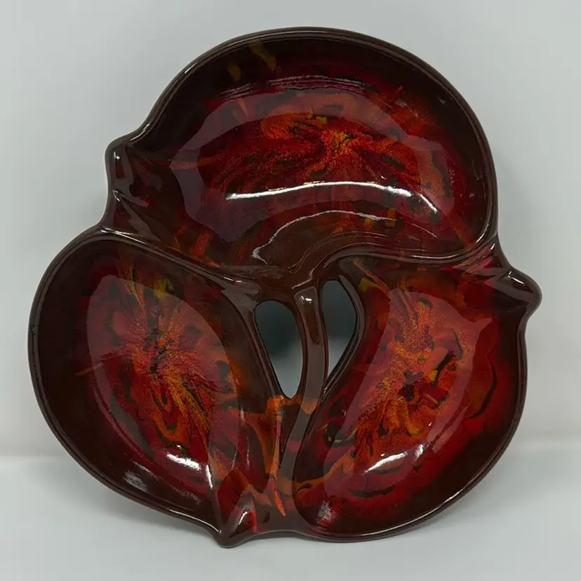 Vintage 3 sectioned pottery dish with handle in beautiful fire and lava tones. Stamped on the back but I can’t make it out. The colors are great. 10.5” across, 3.5”tall