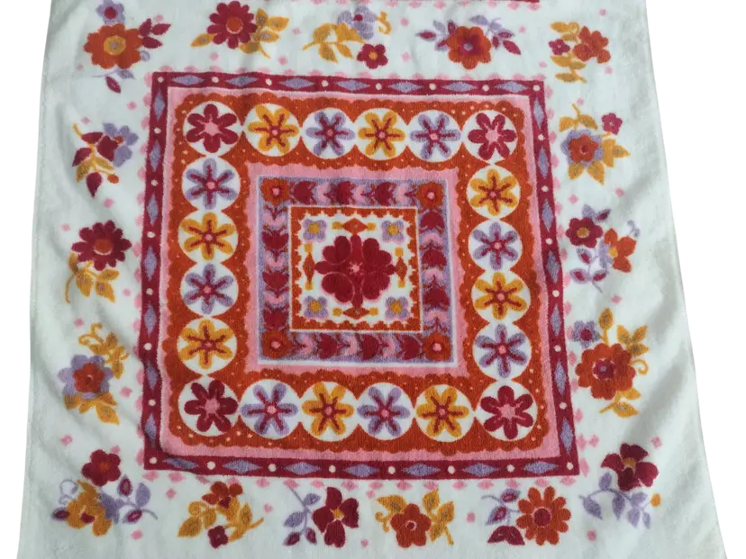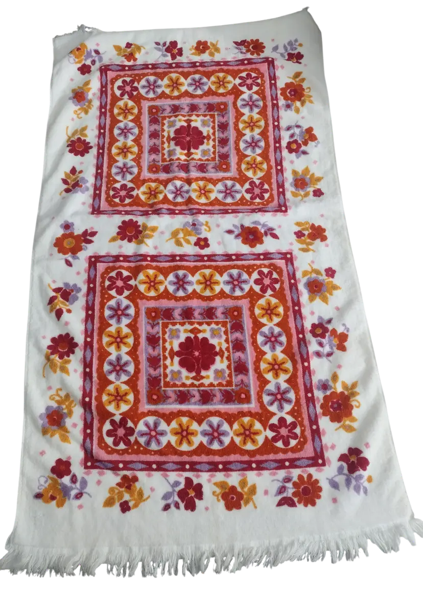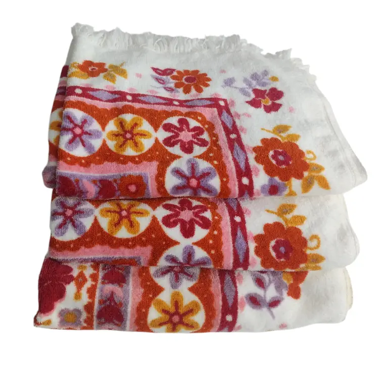Vintage MCM Fieldcrest Floral Fringe Bath Towels Set of 3 Soft Cotton Retro USA
