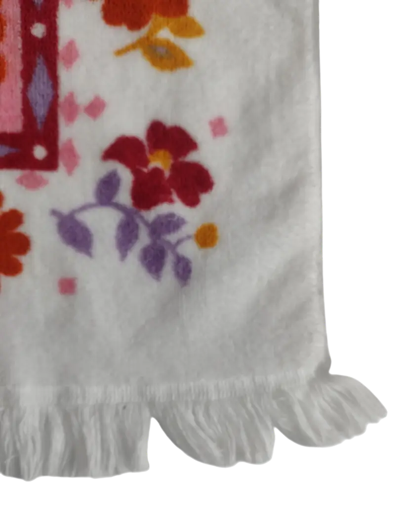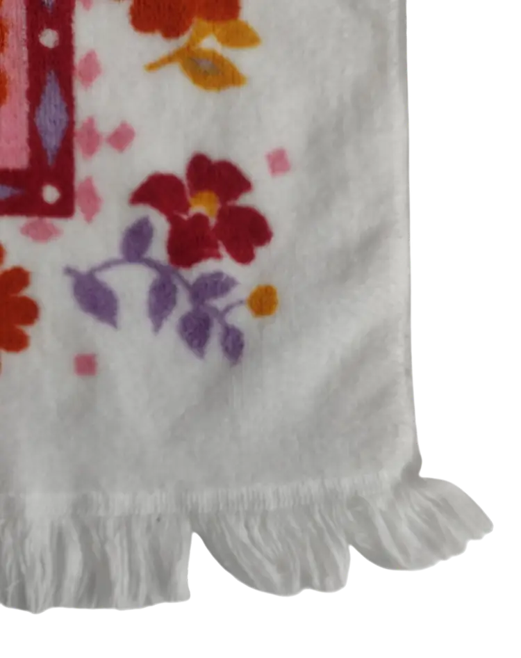 These are very pretty artsy looking floral towels in a soft cotton with fringe on both ends. Each towel measures 43" long x 23" wide.