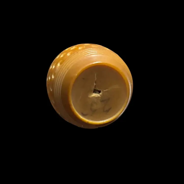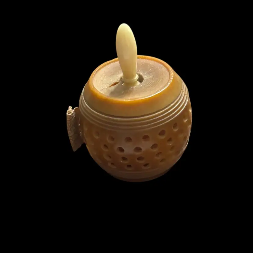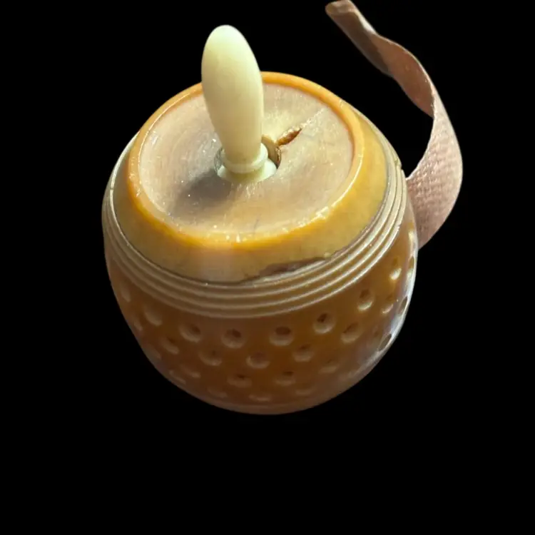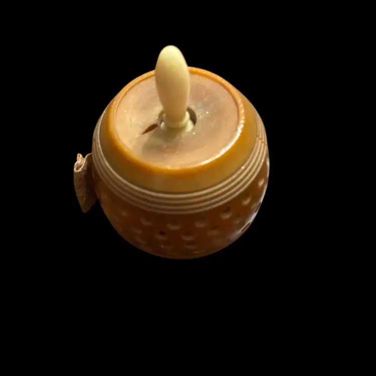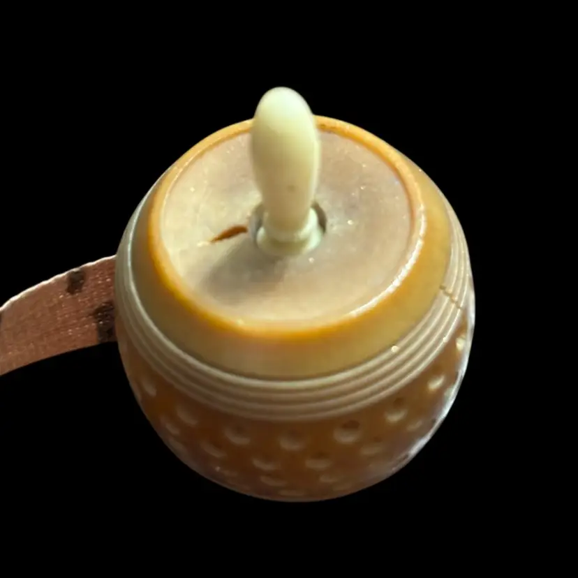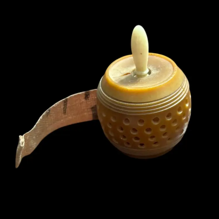 This appears to be a vintage carved tagua nut measuring tape with white twist knob. In working order, some minor damage due to age as seen in photos. 0.75x1.5”