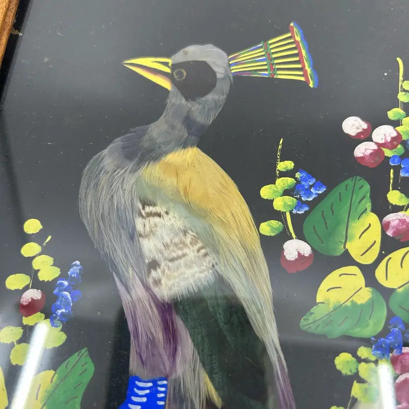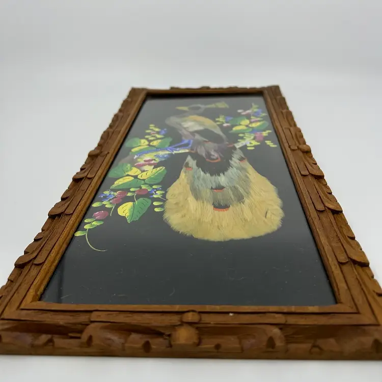 Vintage Mexican Folk Art Feathered/feather craft Bird Wall Art Carved Wood Frame