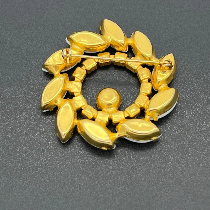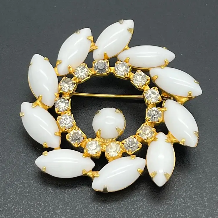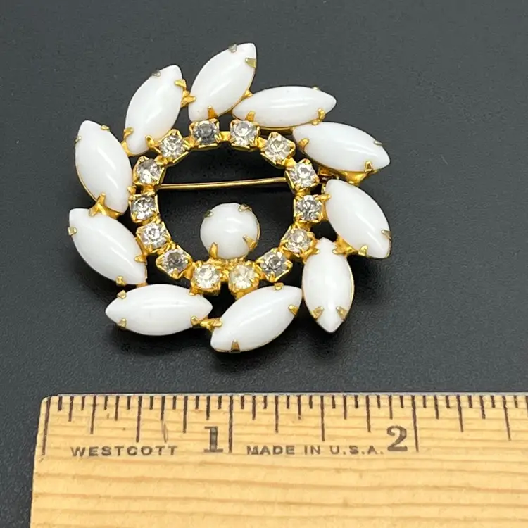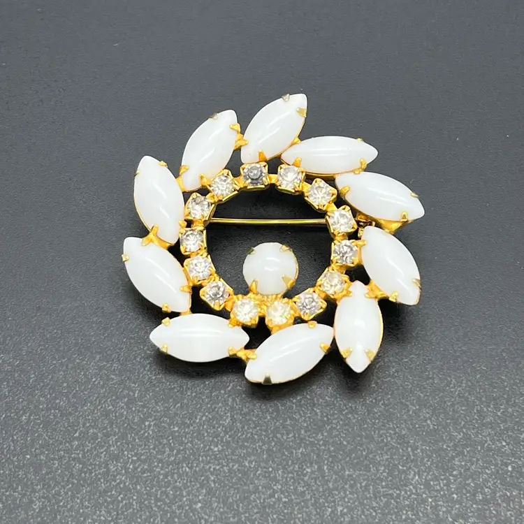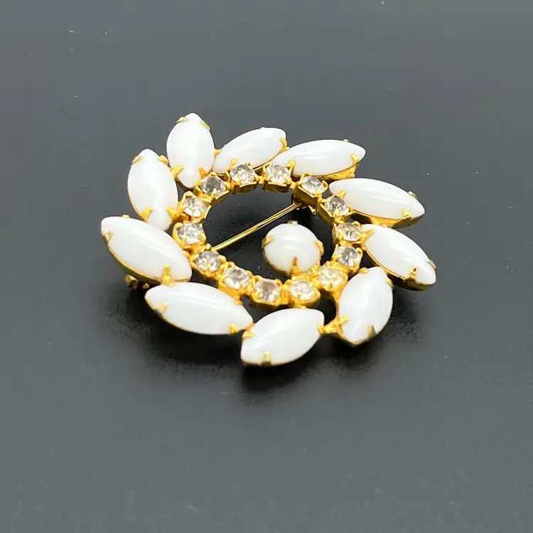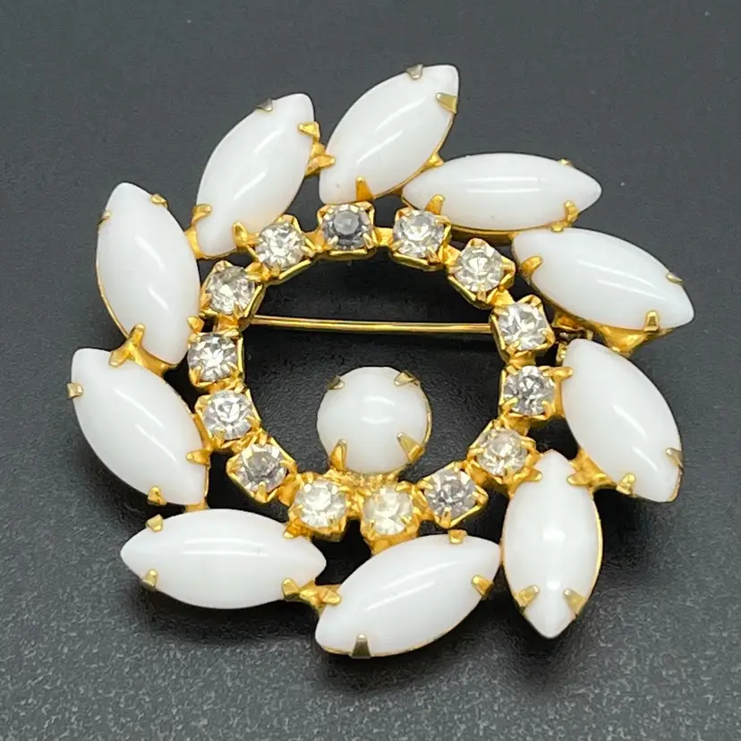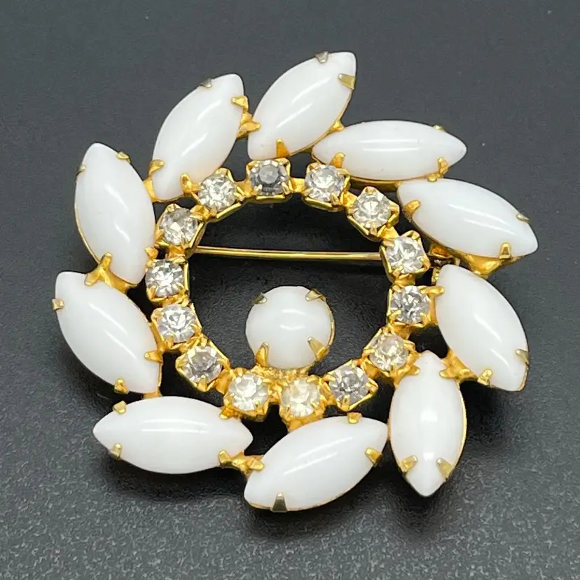 Vintage Milkglass and Rhinestone Pinwheel Brooch pin gold tone white glass navette marquis circle