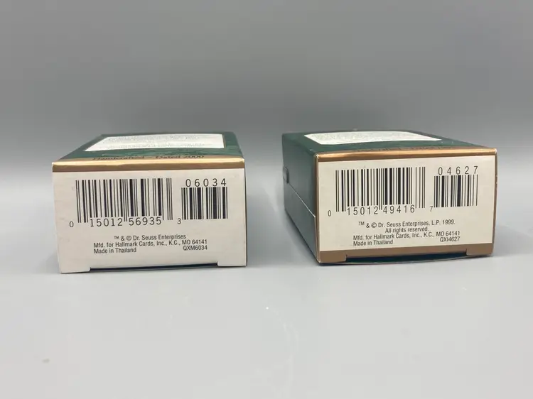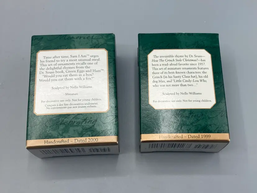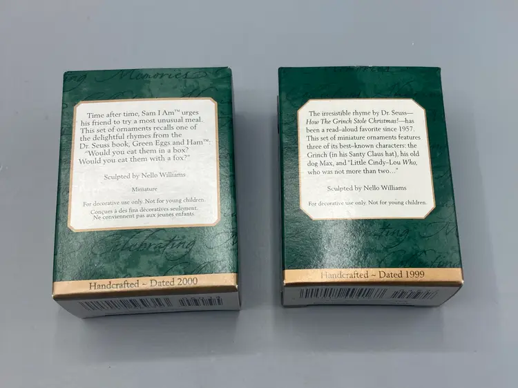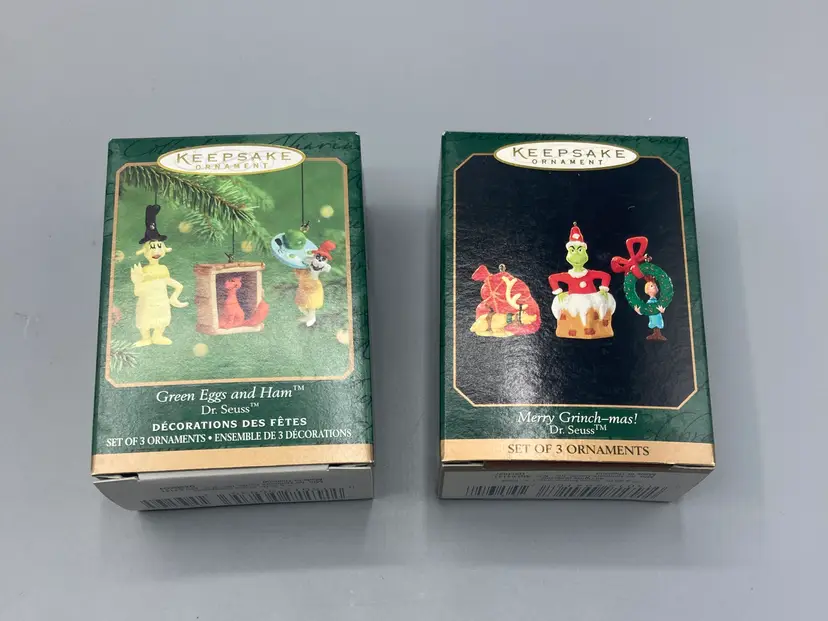 These ornaments are in good condition. They measure approximately... Merry Grinch-mas set of 3 - between 3/4" - 1 1/2" tall Green Eggs and Ham set of 3 - between 1" - 1 3/4" tall