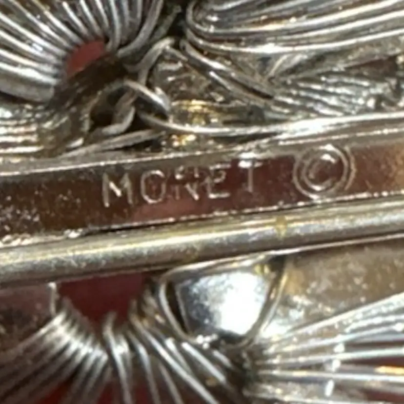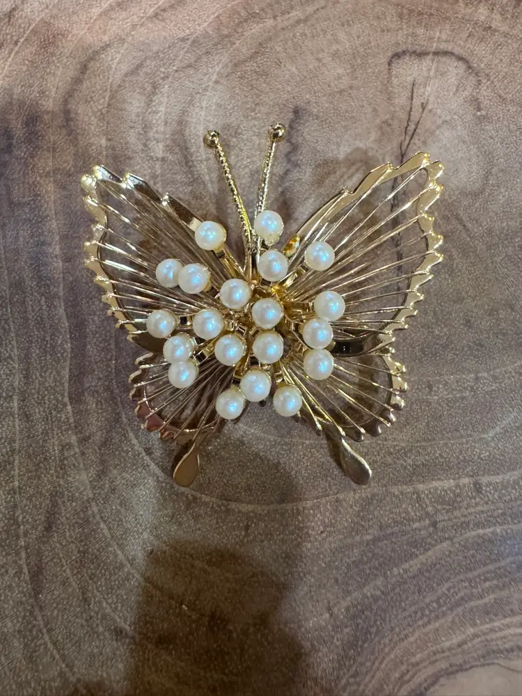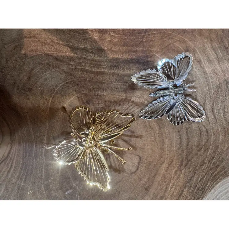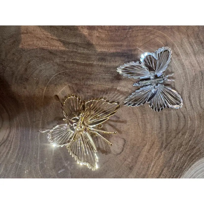 Set of two vintage Monet butterfly brooches. Gold tone with faux pearls measures an inch and 3/4 wide. Silvertone measures an inch and 3/4 wide. Both marked Monet and in excellent condition!