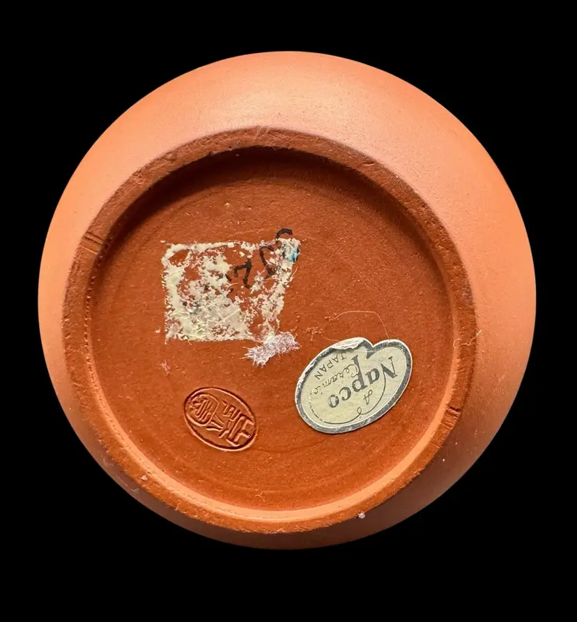 Terracotta vase with a rural landscape. It has a Napco sticker, and an impressed mark on the bottom.