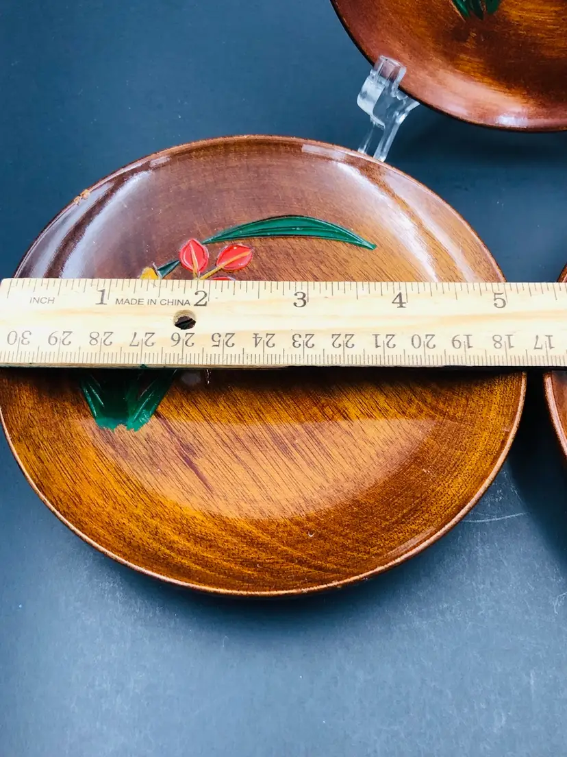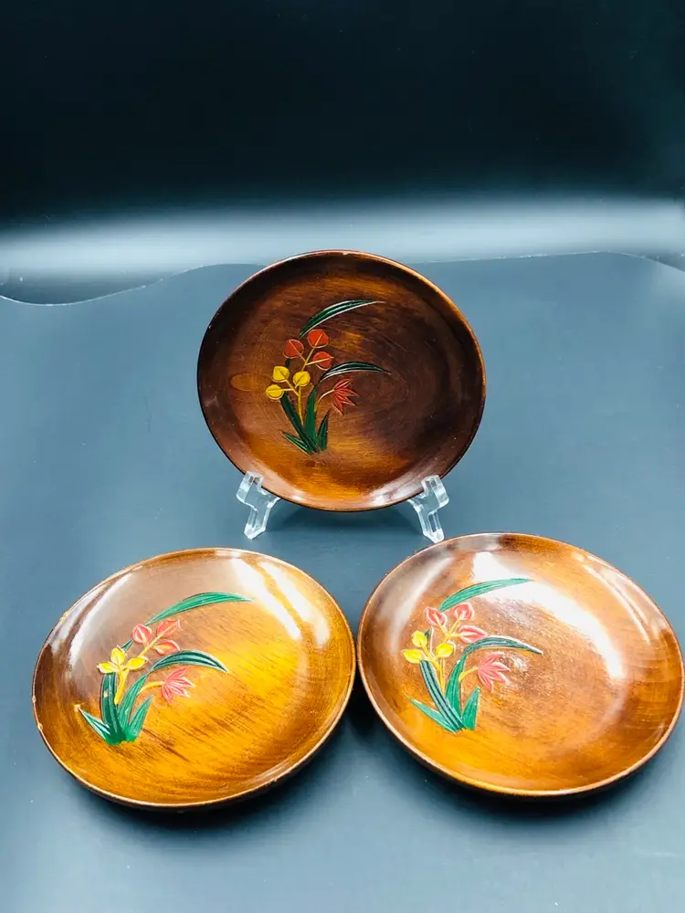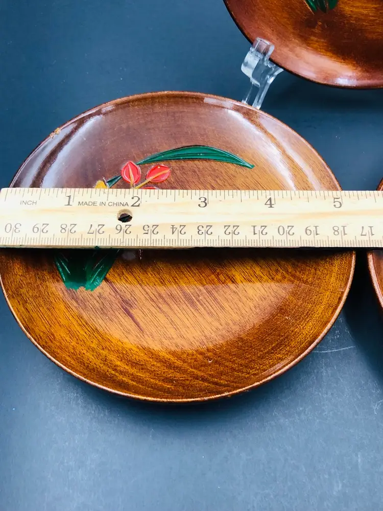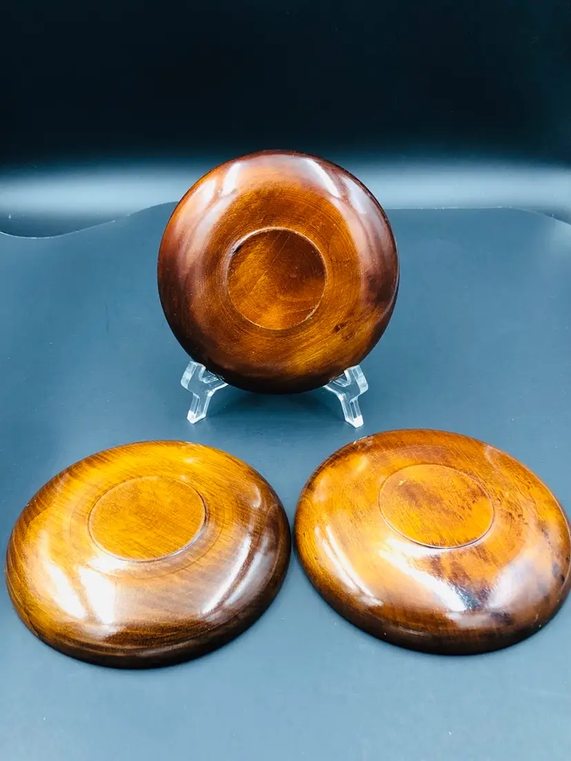 Great little set of 3 wood trinket dish or saucer or display..there are a few nicks from age and wear. Beautifully MCM. 5 X 5 ish…