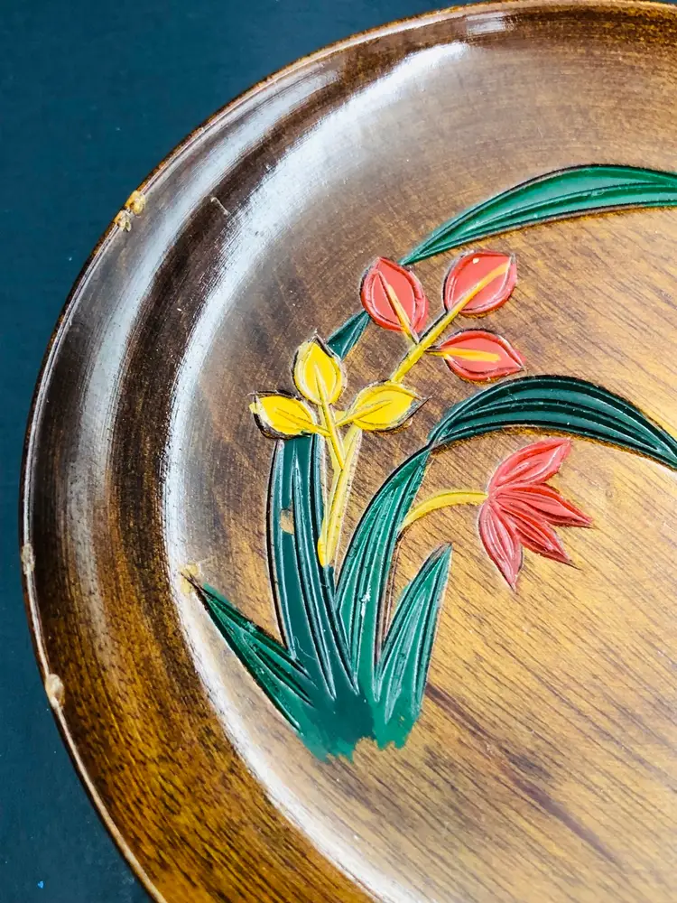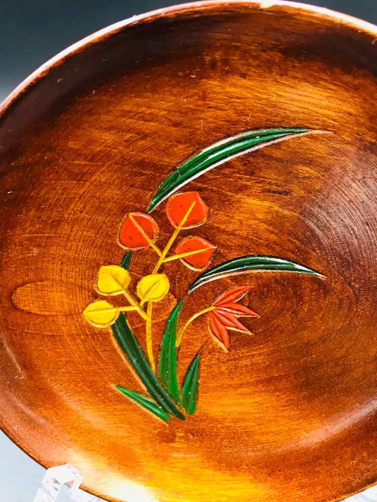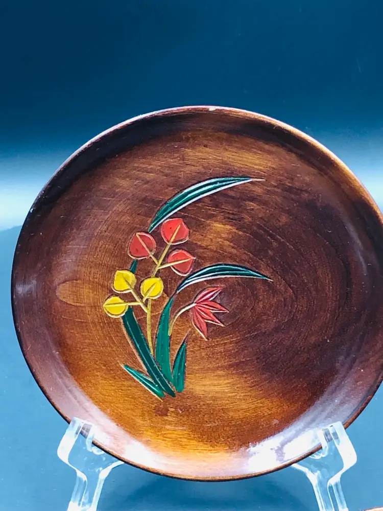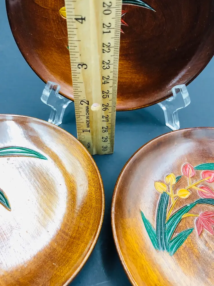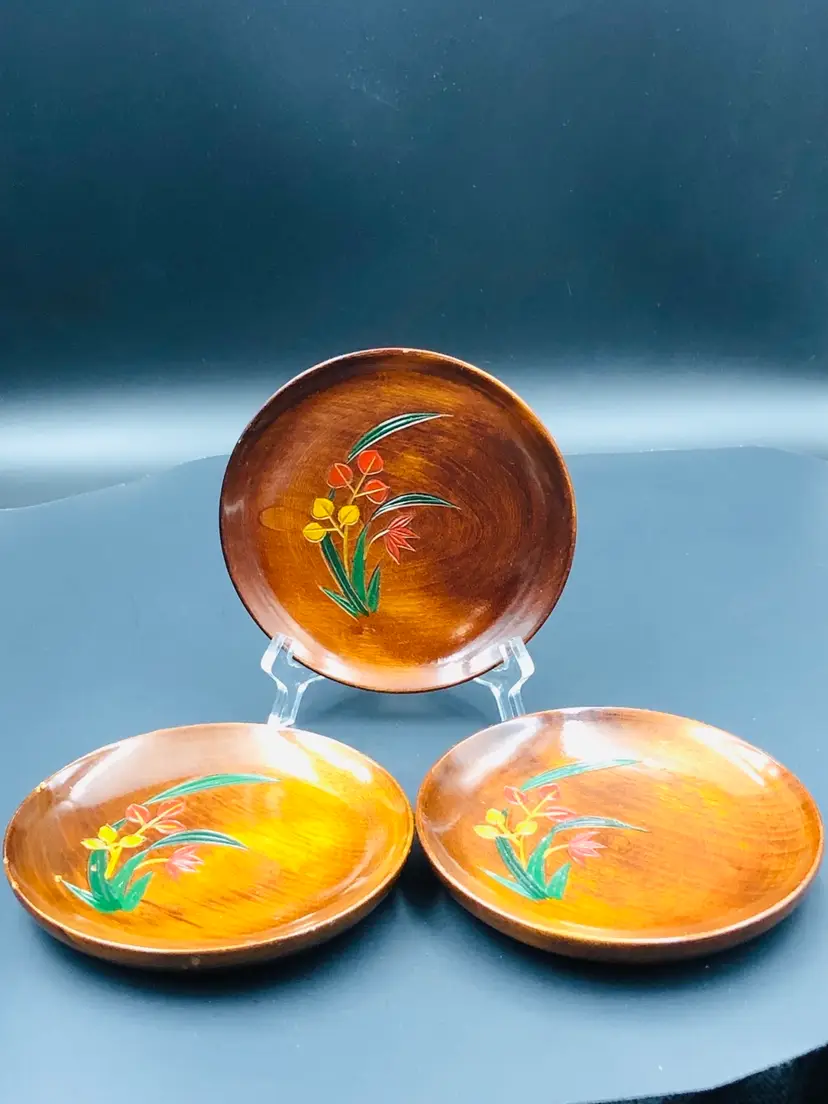 Great little set of 3 wood trinket dish or saucer or display..there are a few nicks from age and wear. Beautifully MCM. 5 X 5 ish…