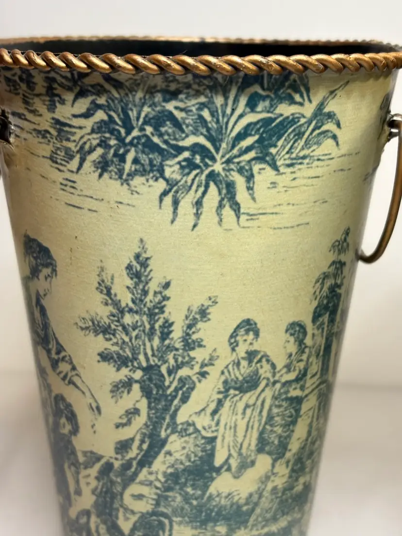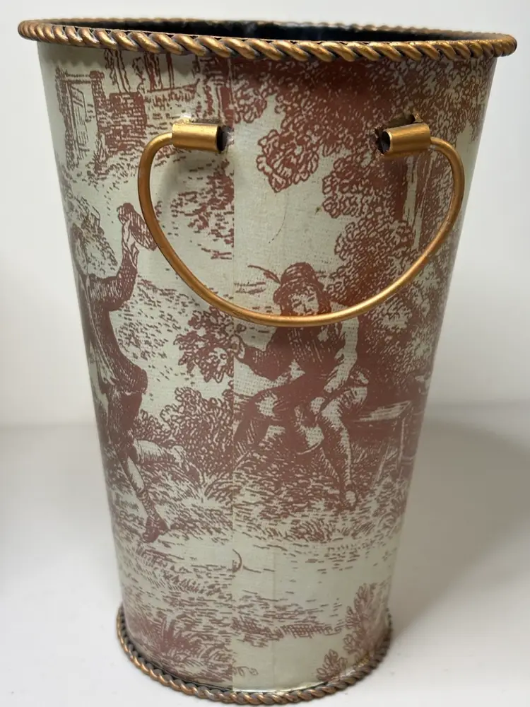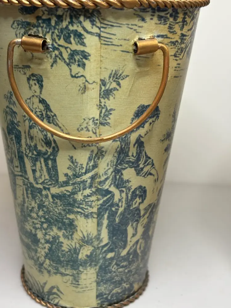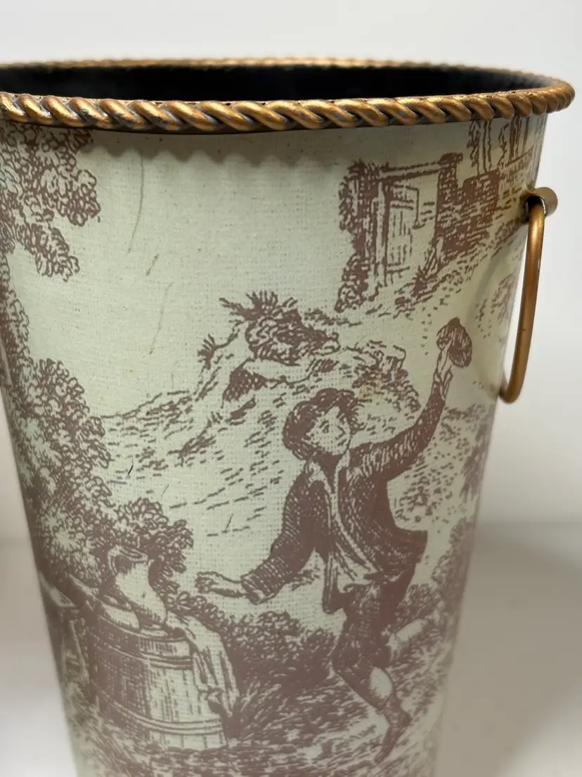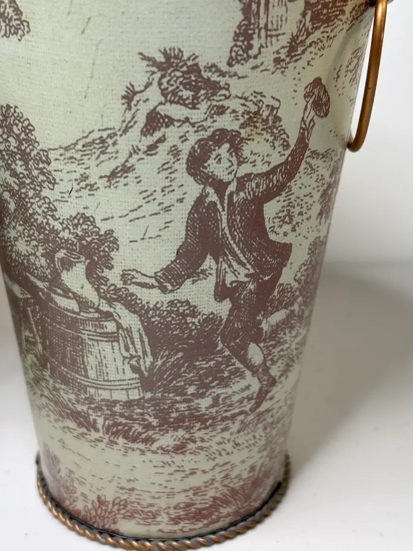 The product is a pair of classic tin flower vases that stand at 7 inches tall and have a diameter of 5 inches. These vases are perfect for displaying flowers or as decorative collectibles. Their timeless design and durable tin material make them a charming addition to any space, whether it be a home, office, or garden.