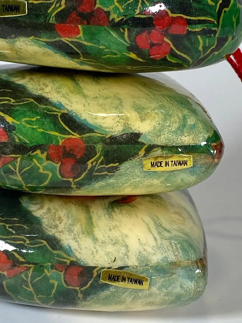 Vintage set of 4 heart shaped Santa Christmas ornaments. Three of the ornaments measure 3.5" x 3.5" One ornament measures 2.5" x 2.5" All are in good pre-owned condition.